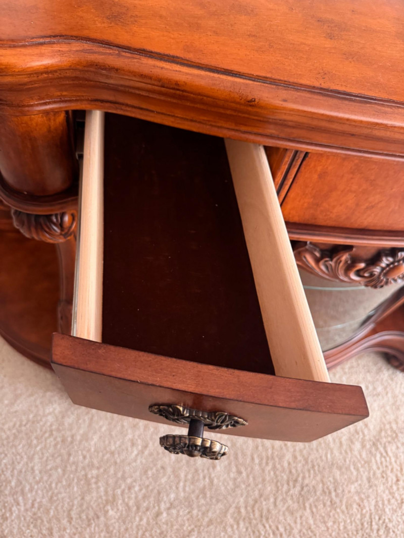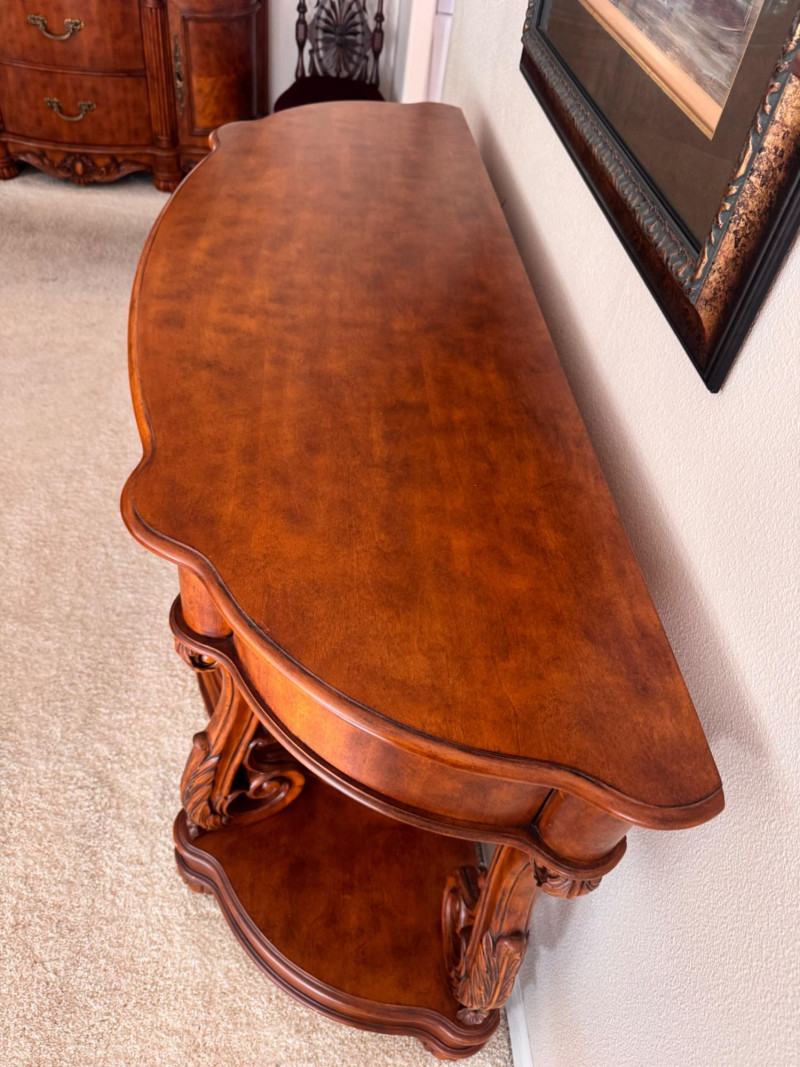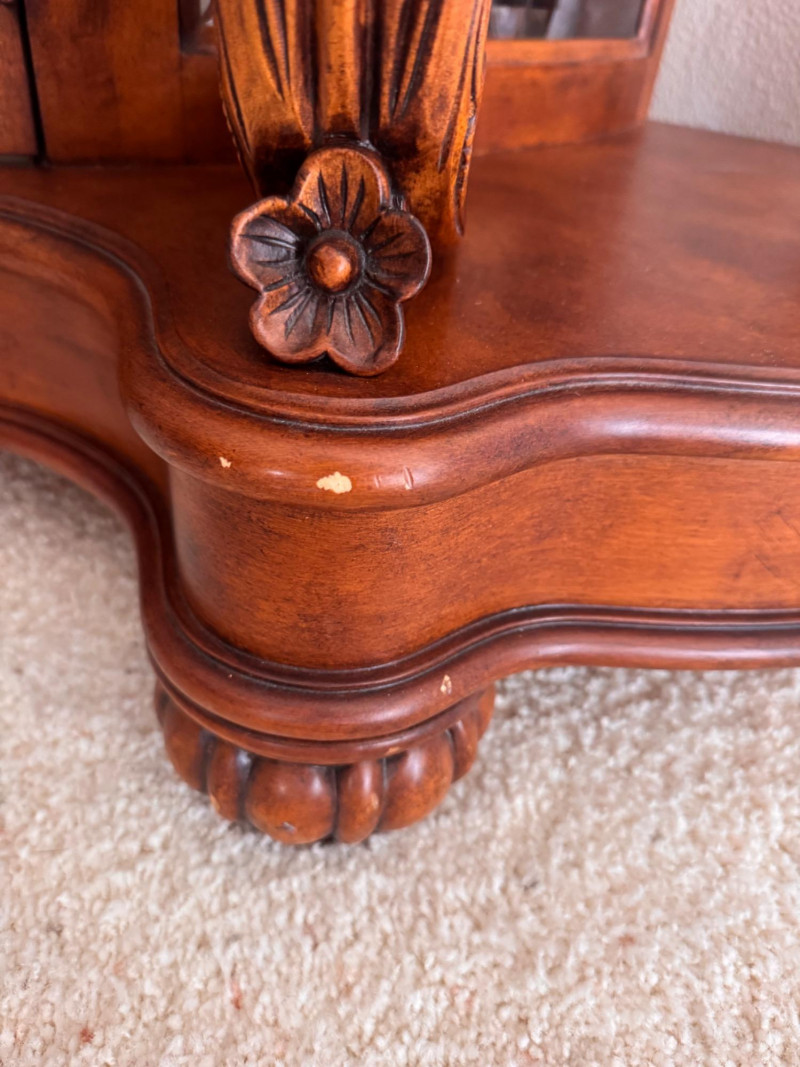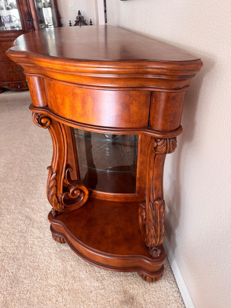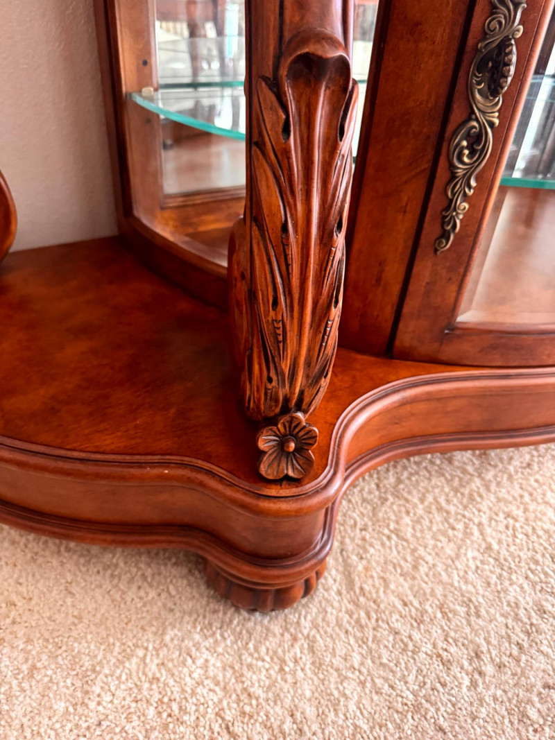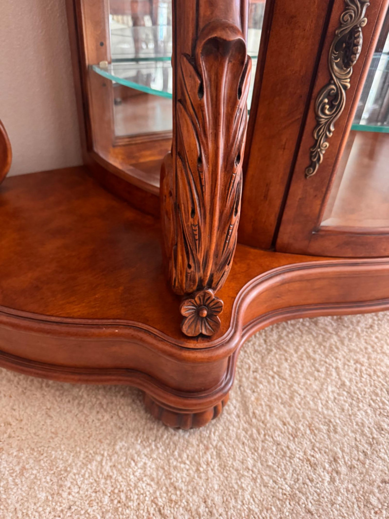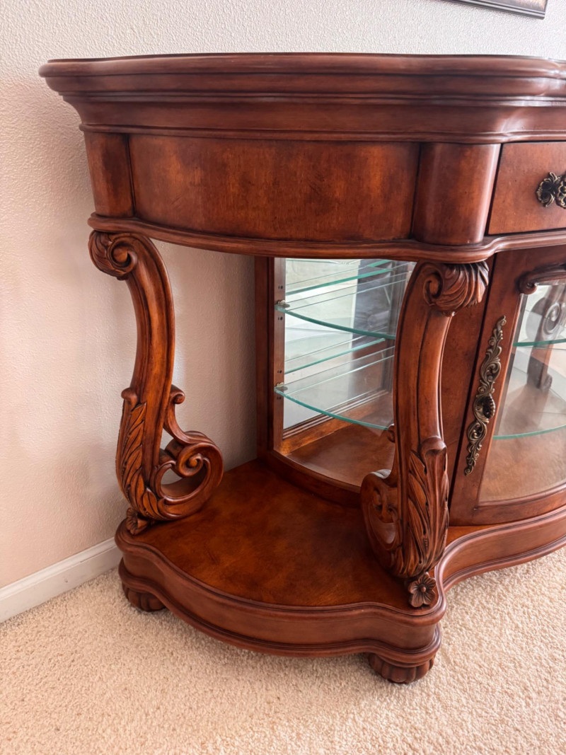 Ornate Carved Wood Buffet w/ Curved Glass Door & Shelves.