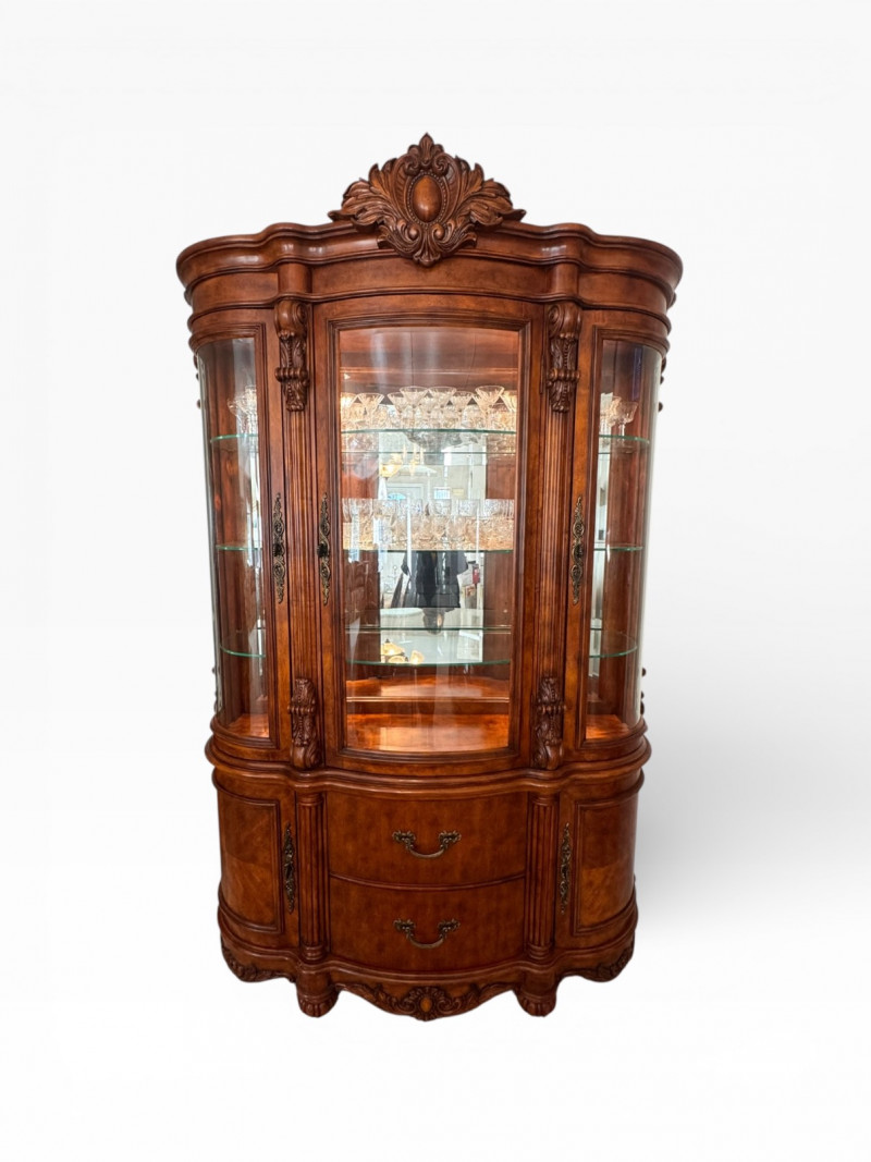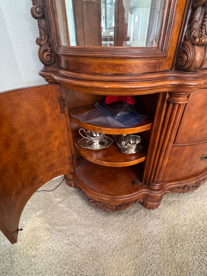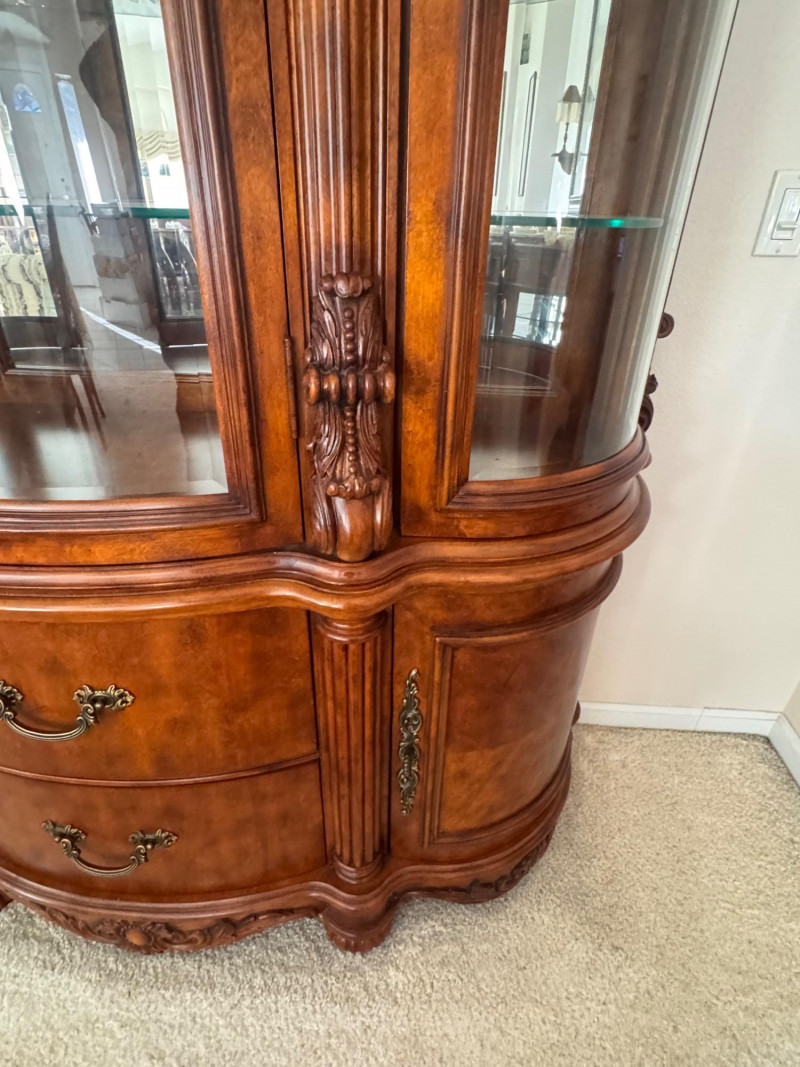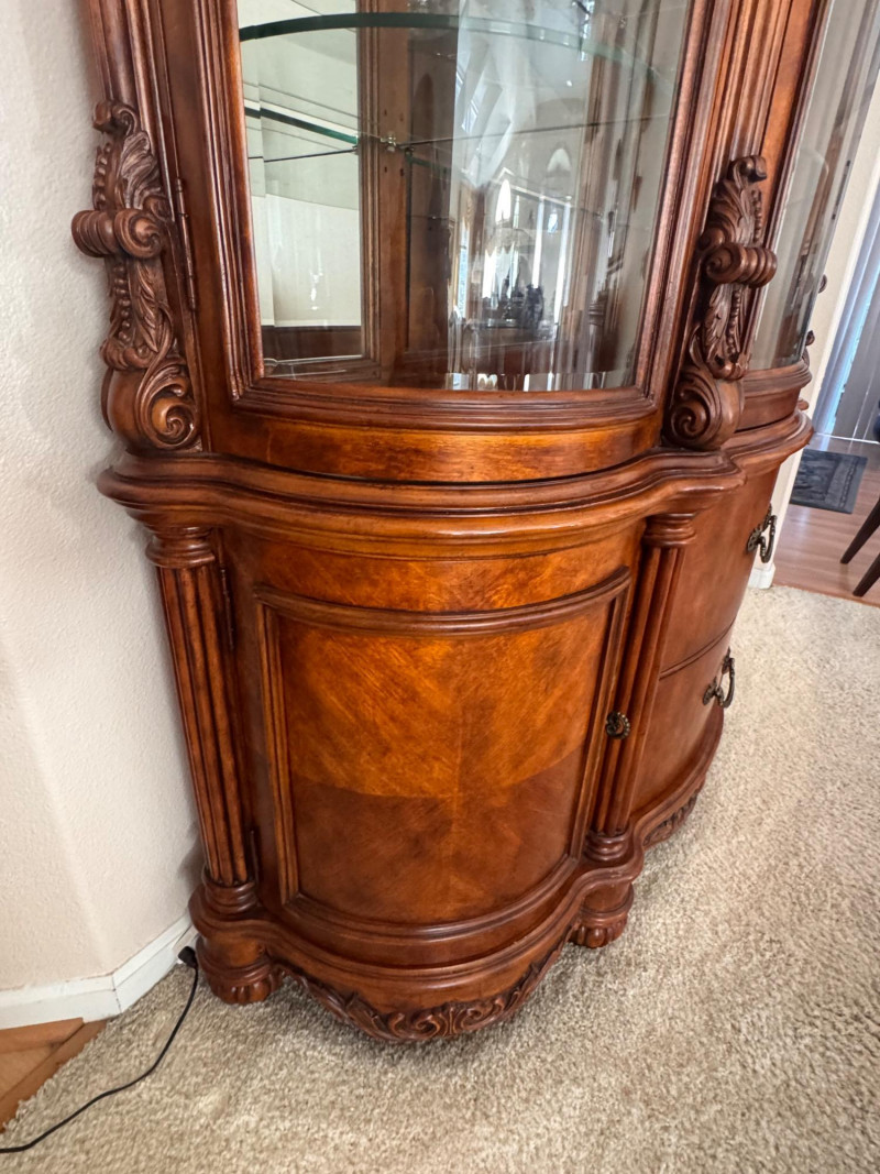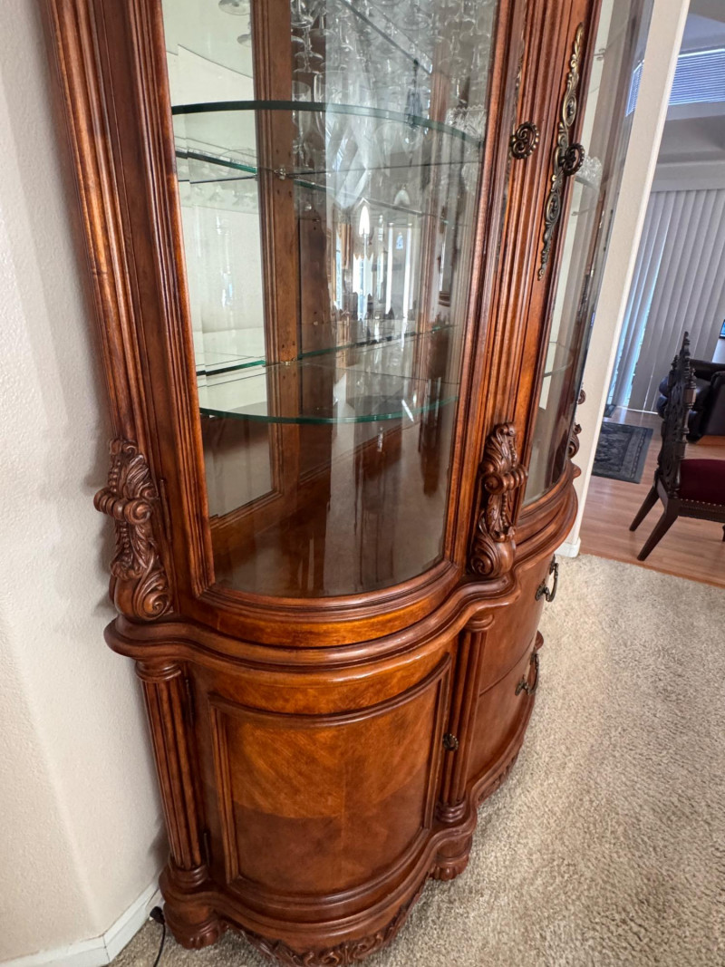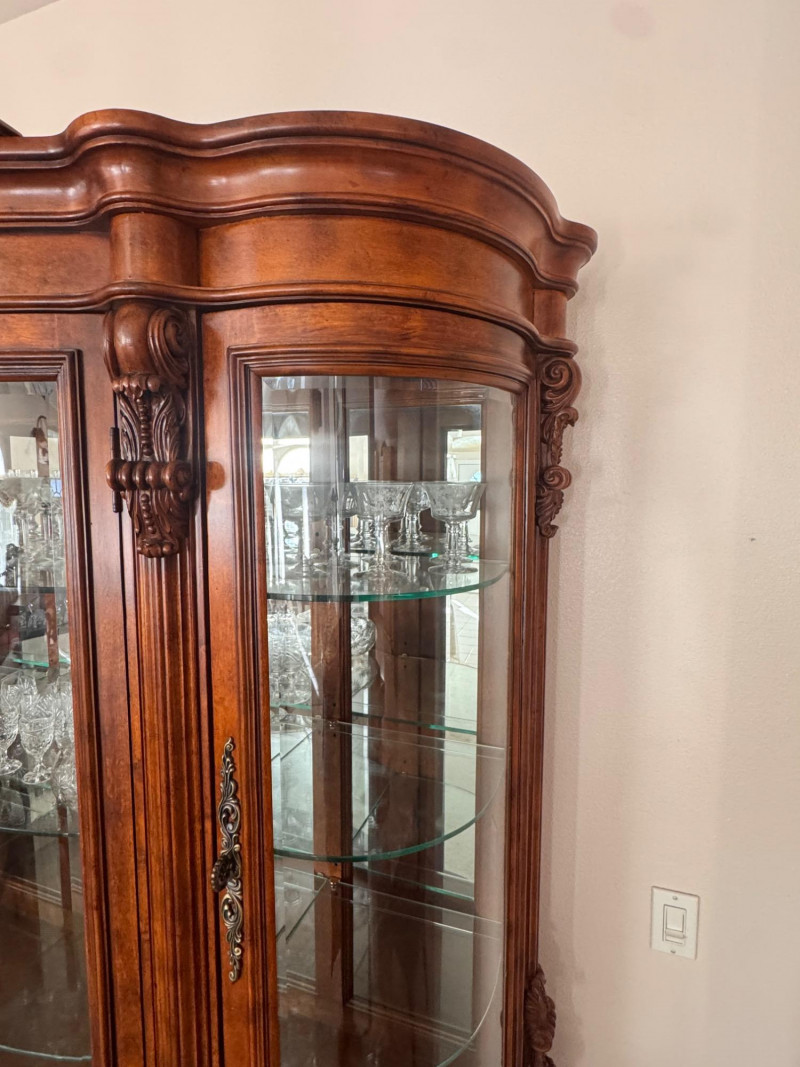 Large Carved China Hutch Curio Cabinet w/ Curved Glass & Drawers. Bidding on this lot is an agreement that: (1.) You will have at least 2 capable, able bodied persons to lift and load at a minimum. (2.) You will bring a hand truck and/or any other tools needed to remove this item. If these steps are not followed your item will be forfeit and no refund given.