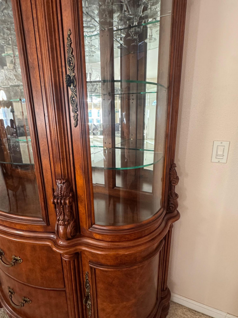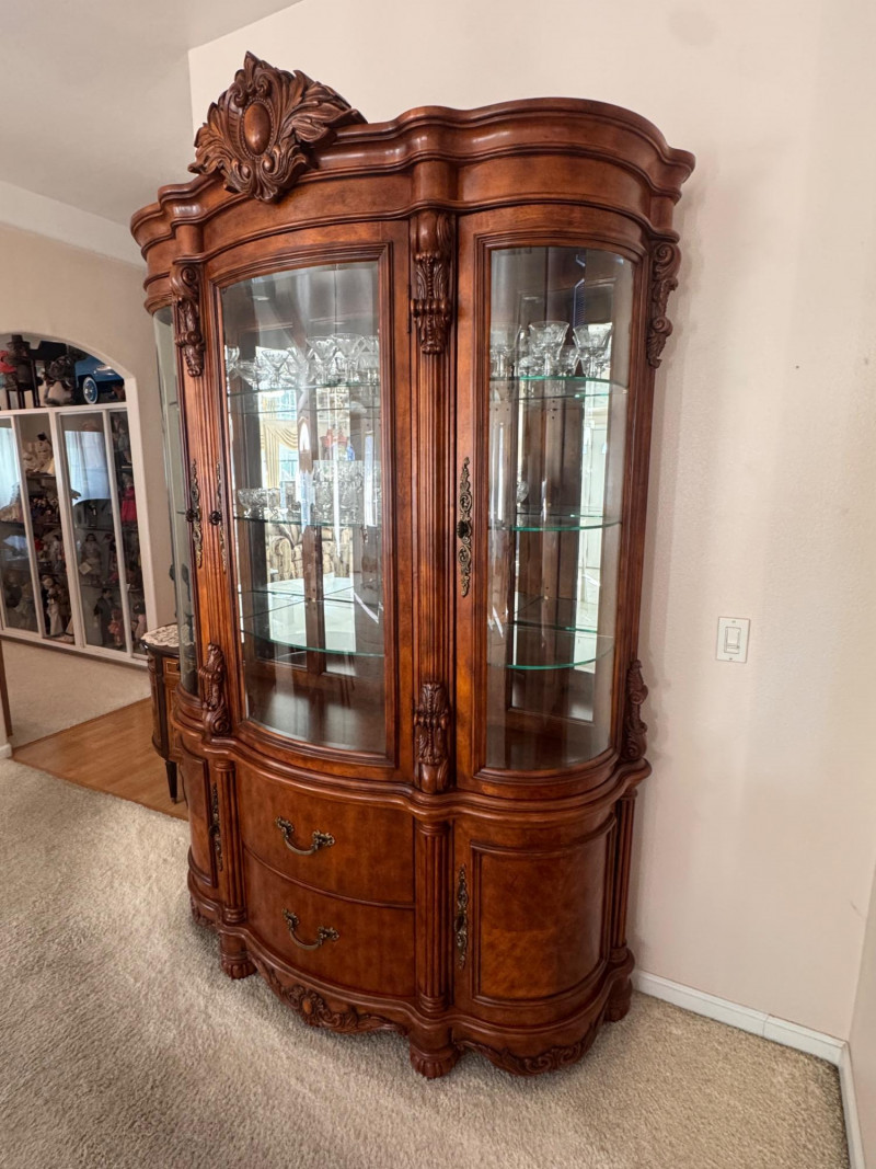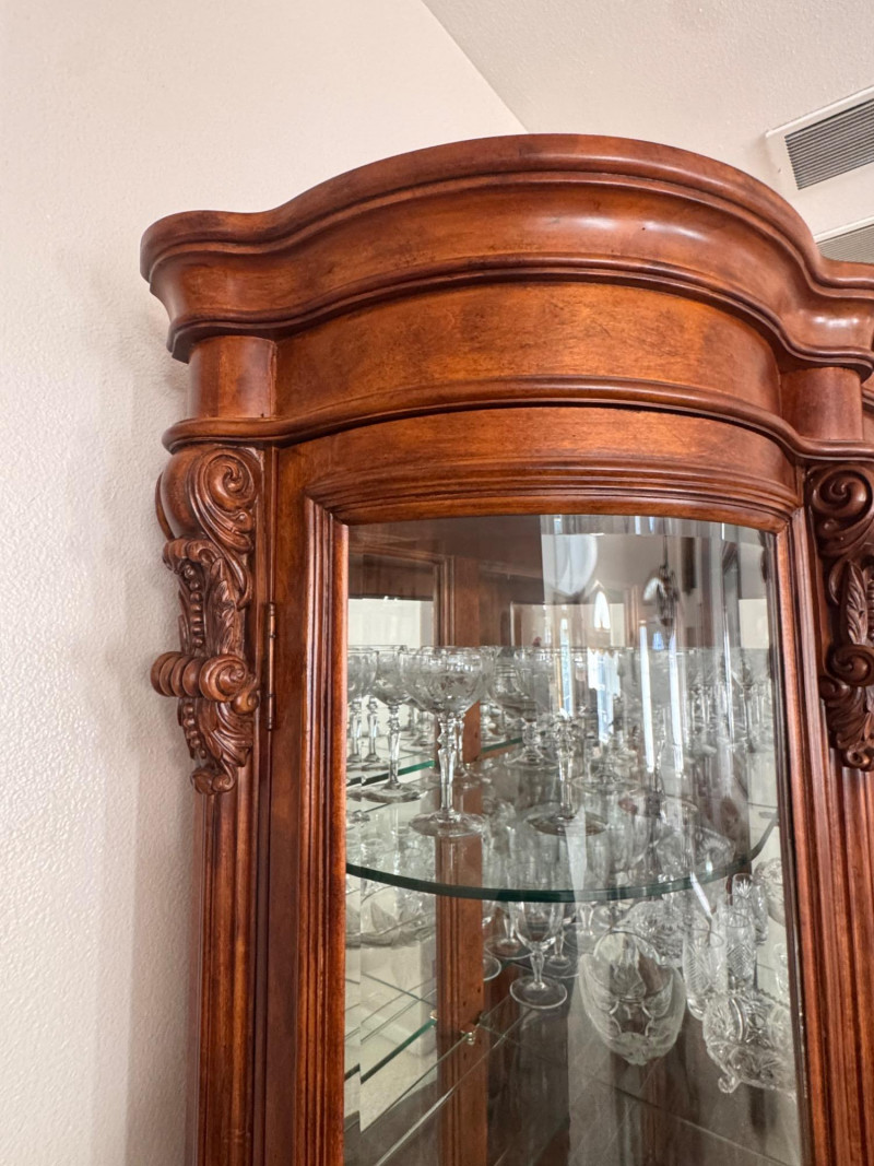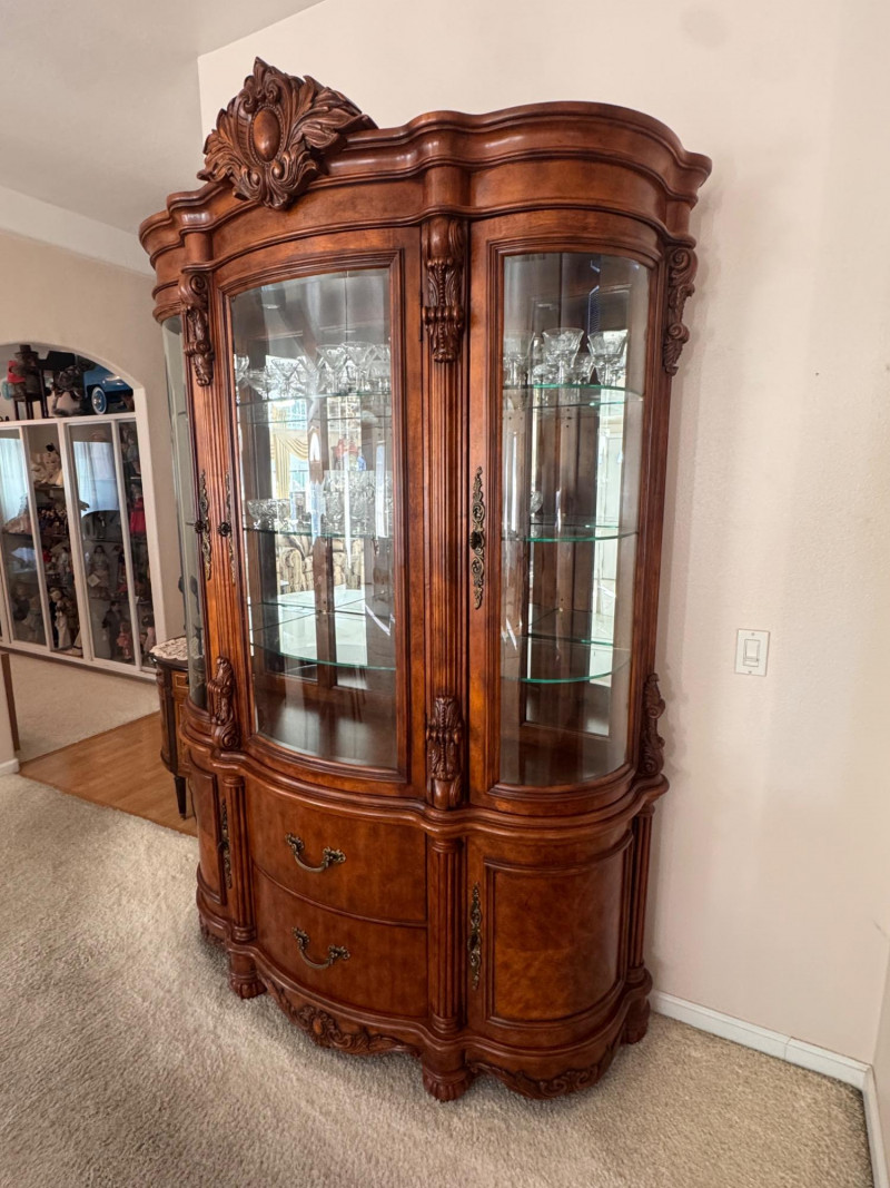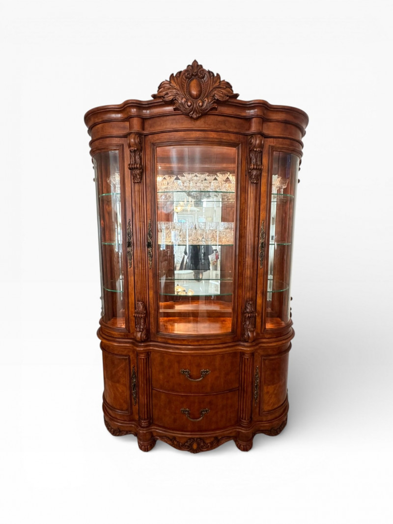 Large Carved China Hutch Curio Cabinet w/ Curved Glass & Drawers. Bidding on this lot is an agreement that: (1.) You will have at least 2 capable, able bodied persons to lift and load at a minimum. (2.) You will bring a hand truck and/or any other tools needed to remove this item. If these steps are not followed your item will be forfeit and no refund given.