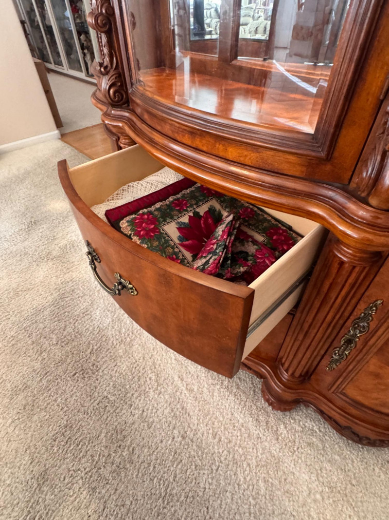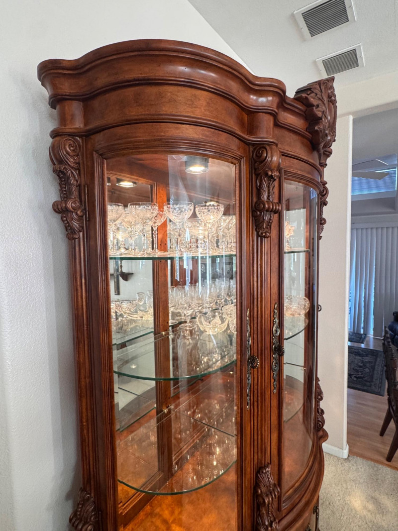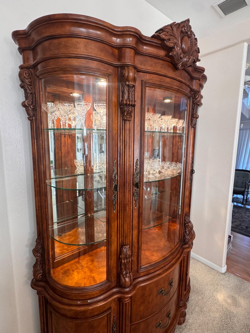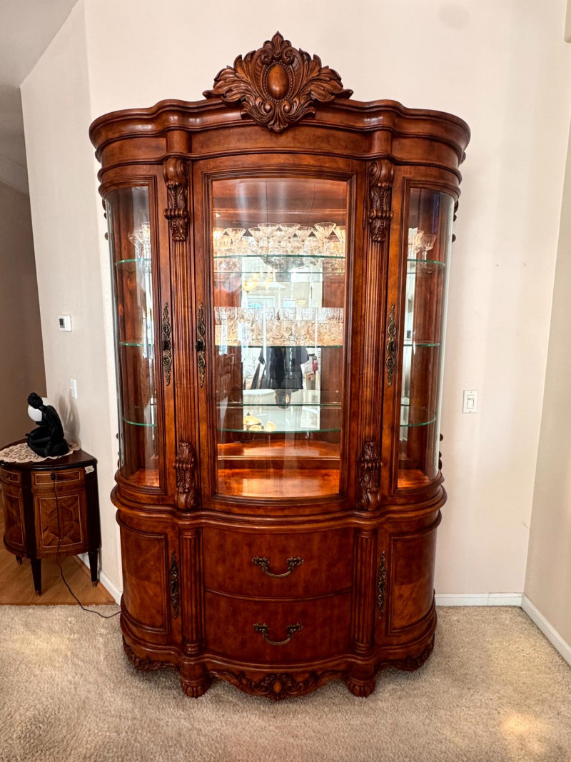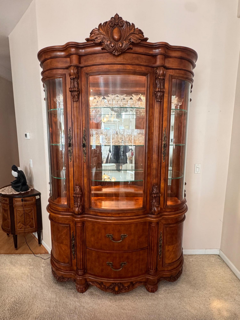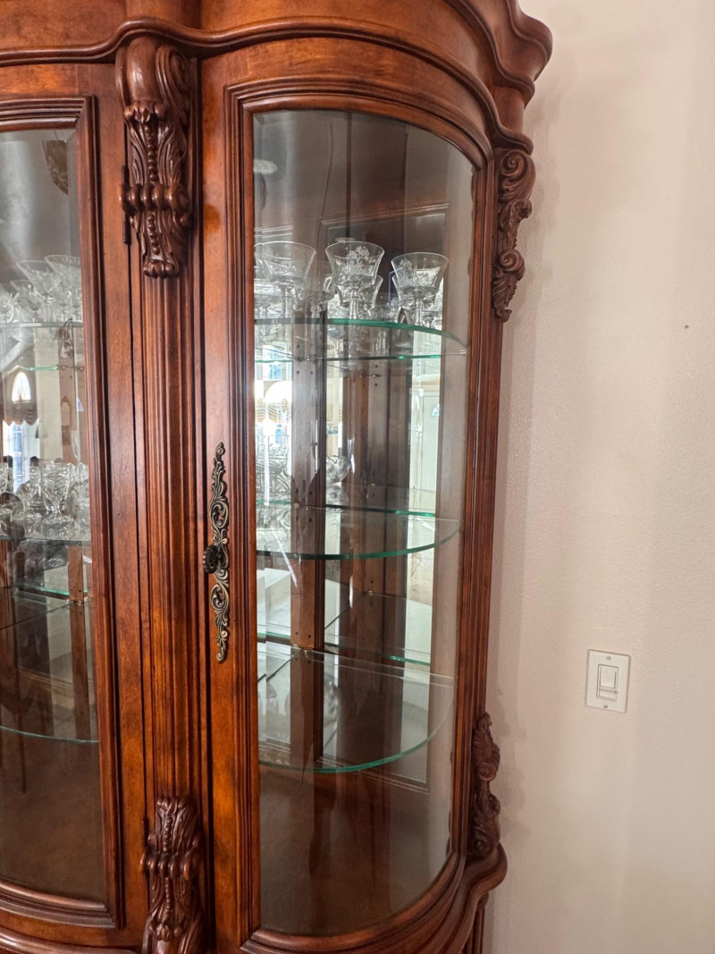 Large Carved China Hutch Curio Cabinet w/ Curved Glass & Drawers. Bidding on this lot is an agreement that: (1.) You will have at least 2 capable, able bodied persons to lift and load at a minimum. (2.) You will bring a hand truck and/or any other tools needed to remove this item. If these steps are not followed your item will be forfeit and no refund given.