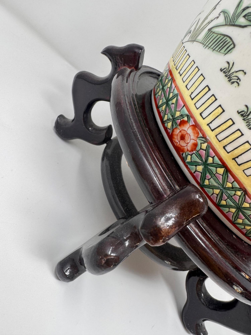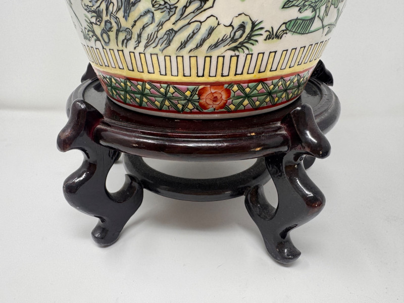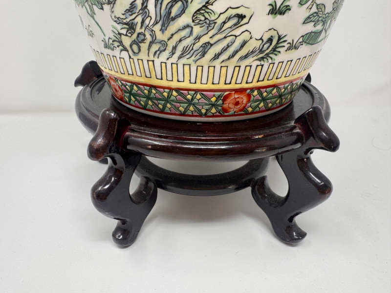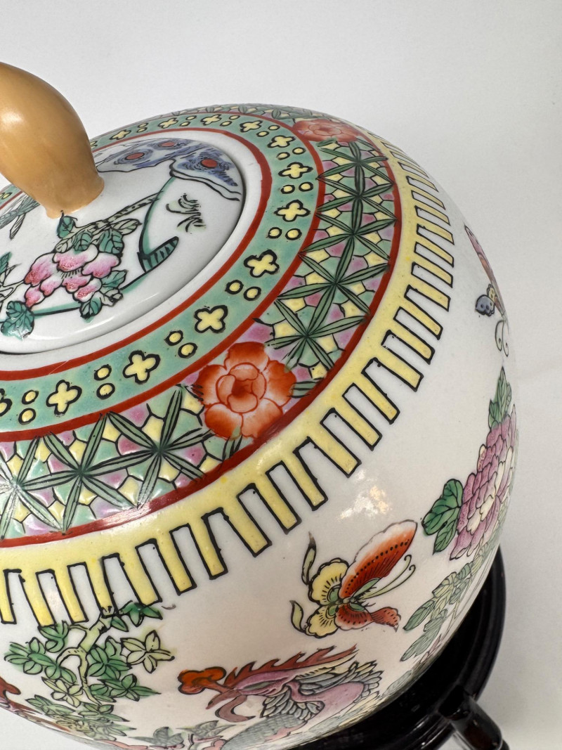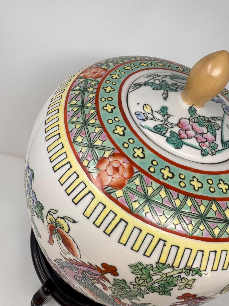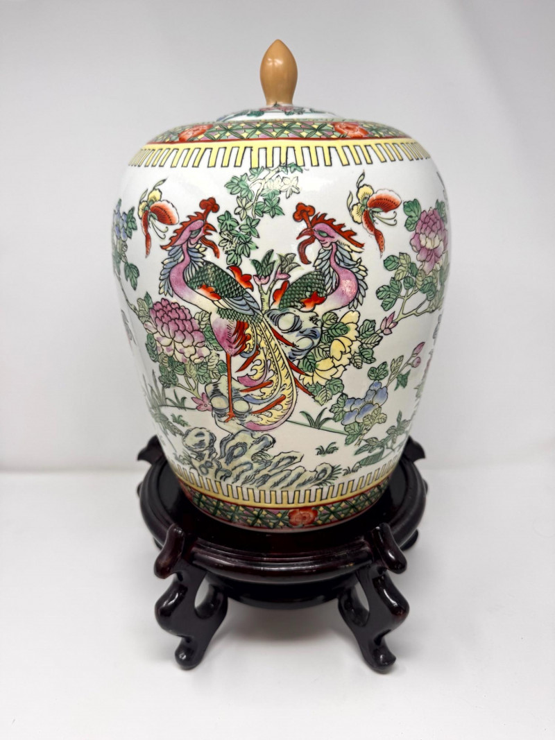 Hand-Painted Asian Porcelain Ginger Jar w/ Phoenix & Floral Motif.