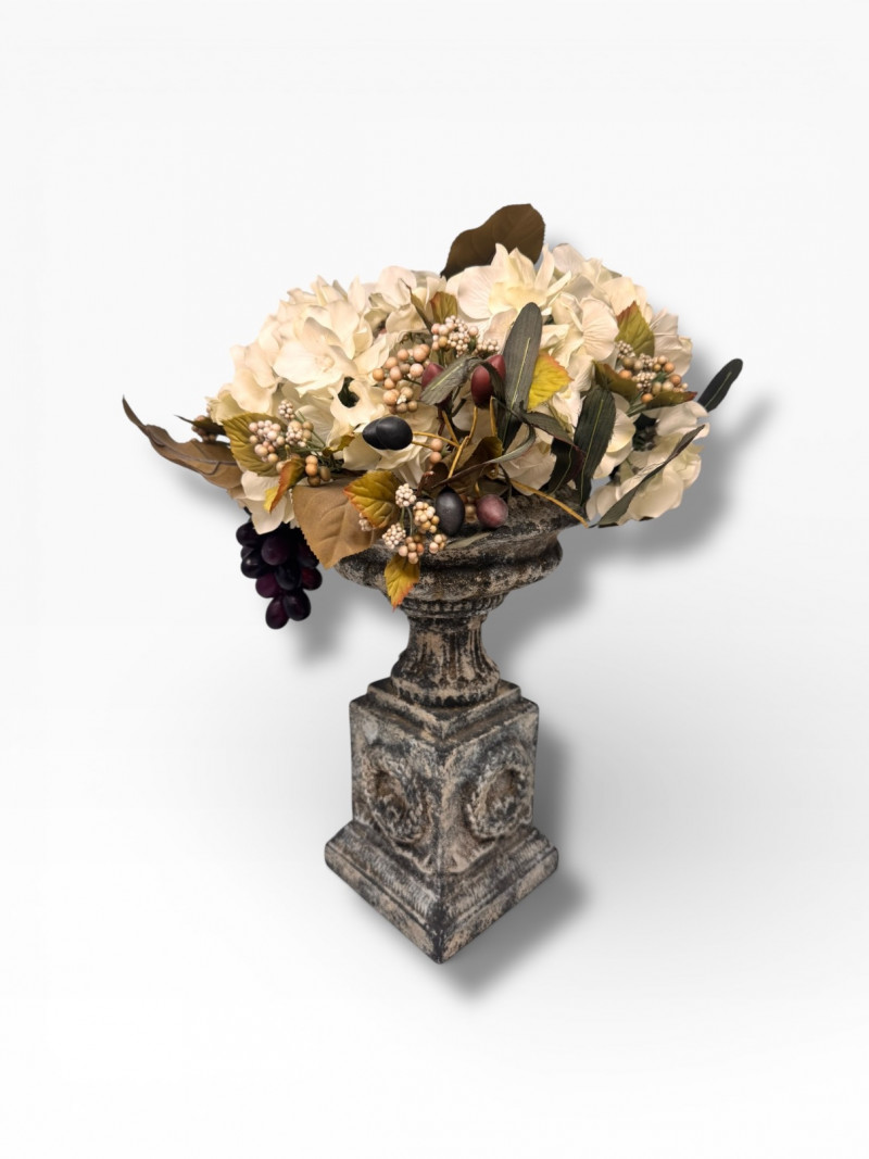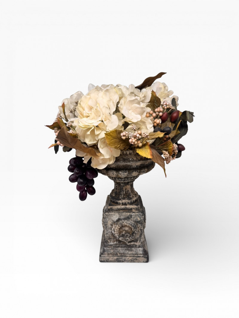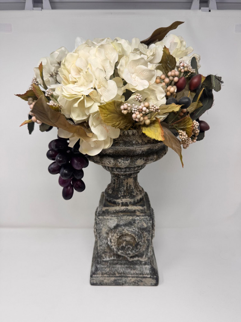 Faux Floral Arrangement w/ Grapes in Pedestal Stone Finish Urn.