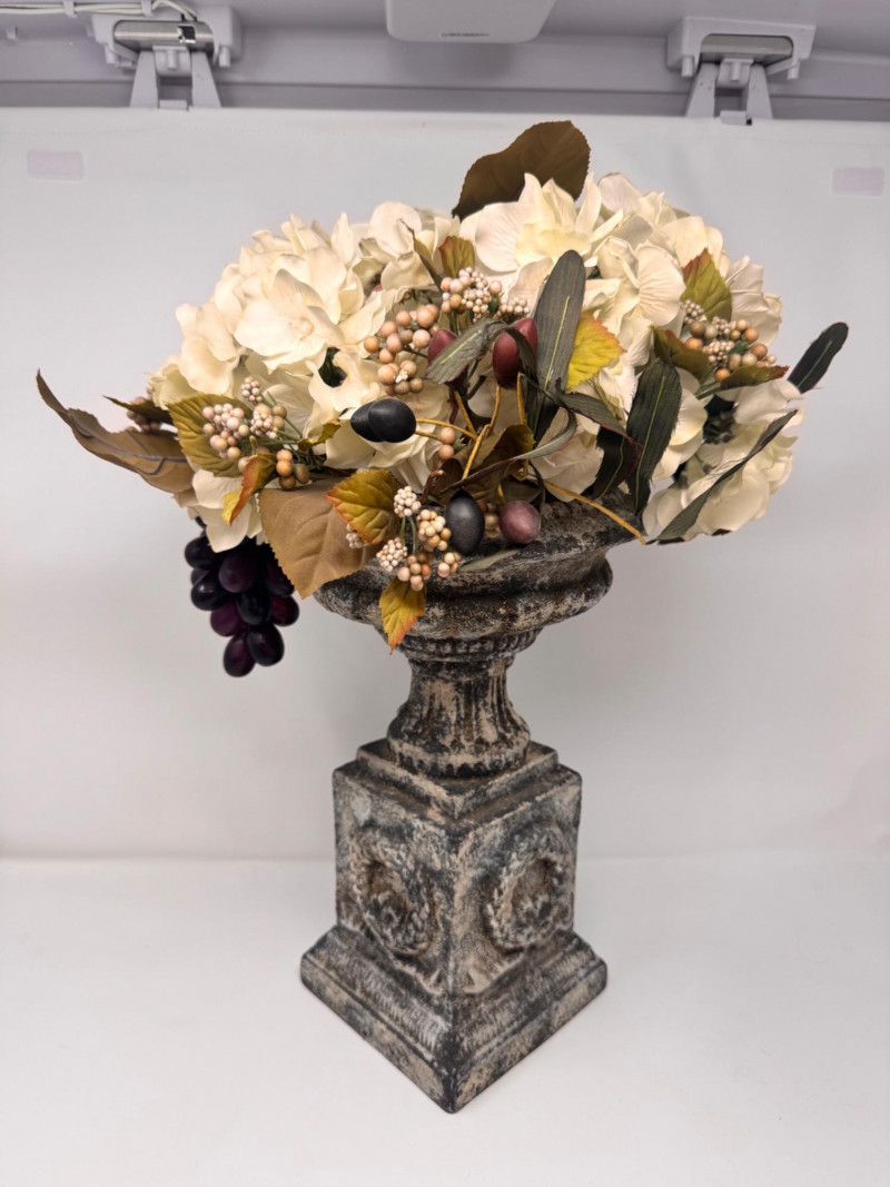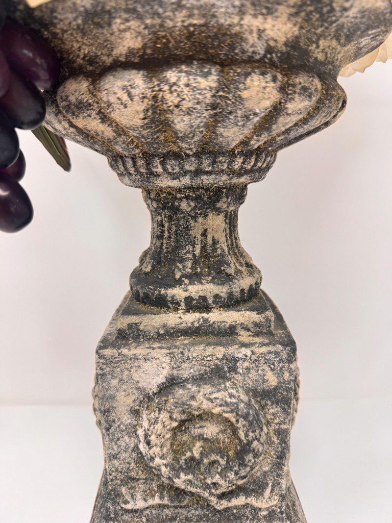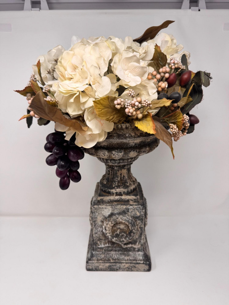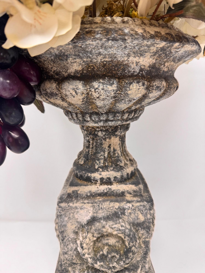 Lot # 44 - Faux Floral Arrangement w/ Grapes in Pedestal Stone Finish Urn