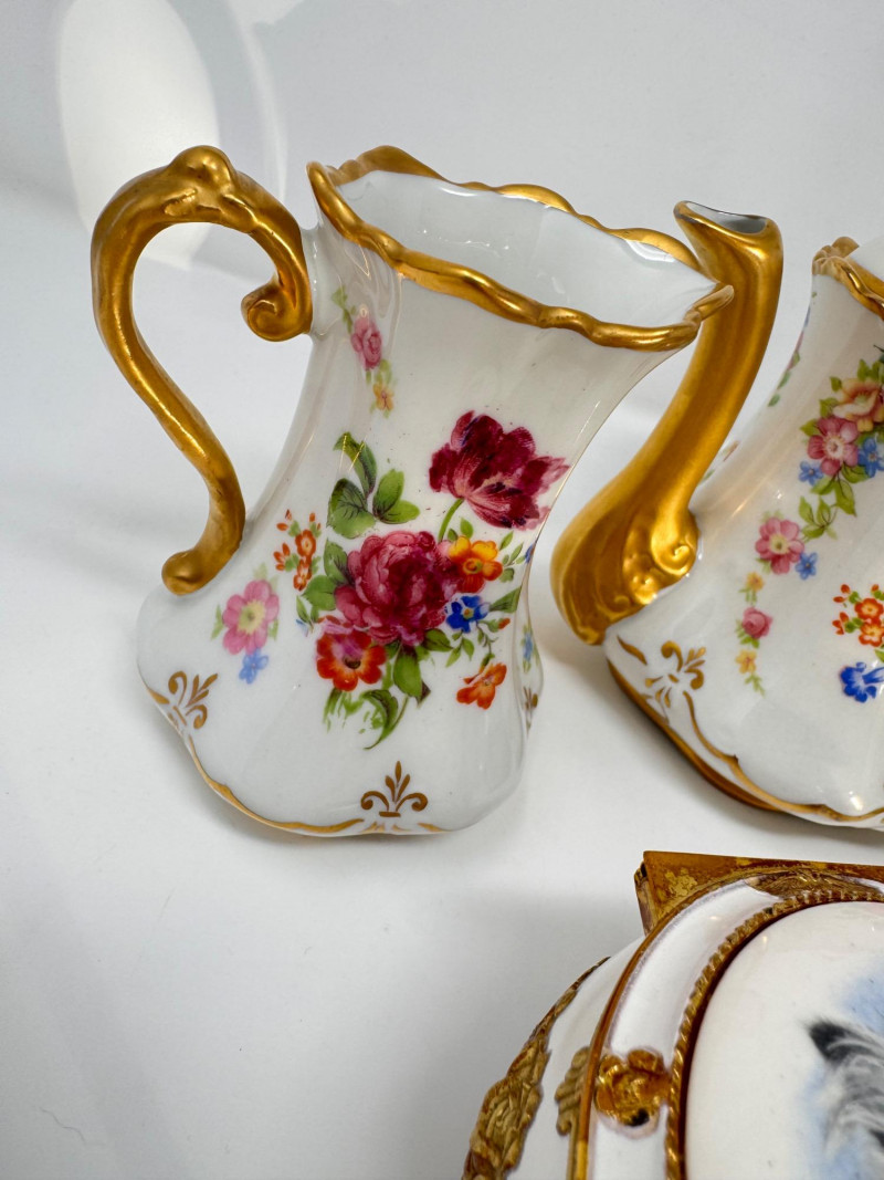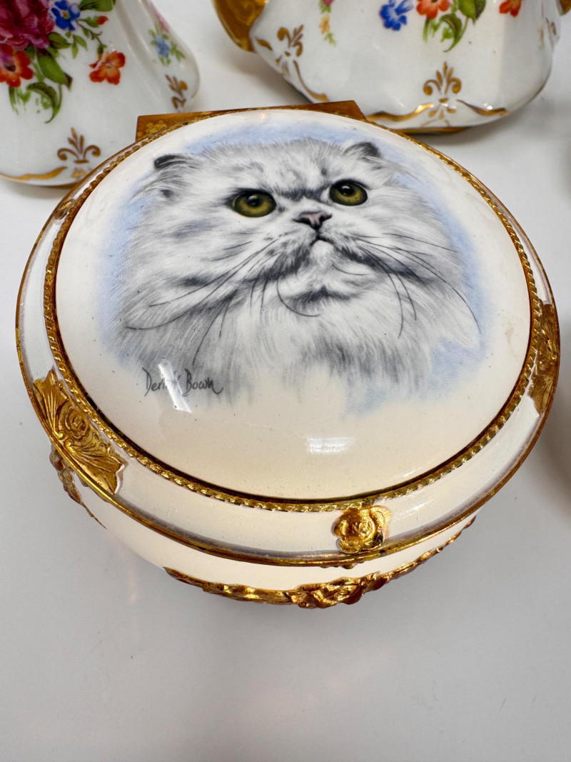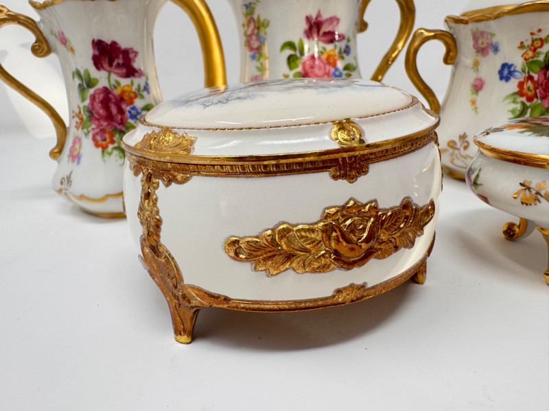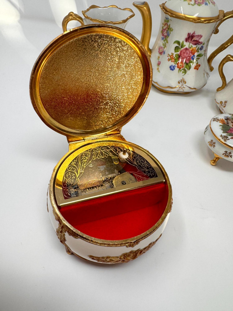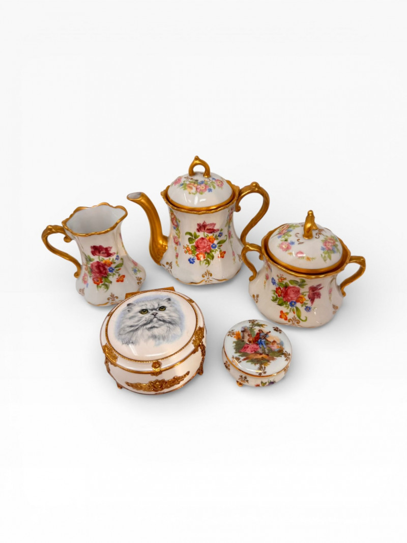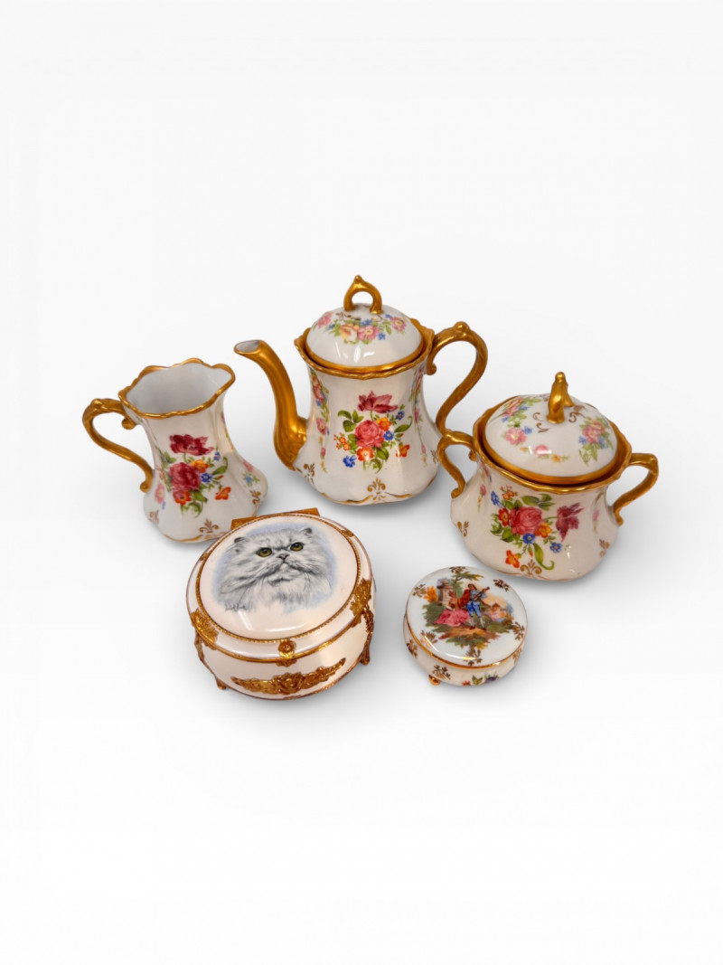 Limoges Porcelain, Cat Music Box & Floral Gilt Tea Set Collection.