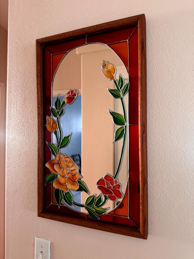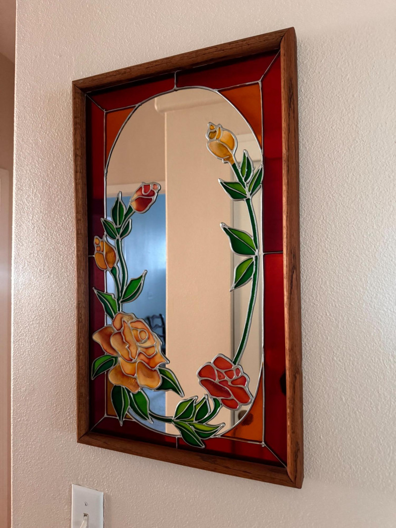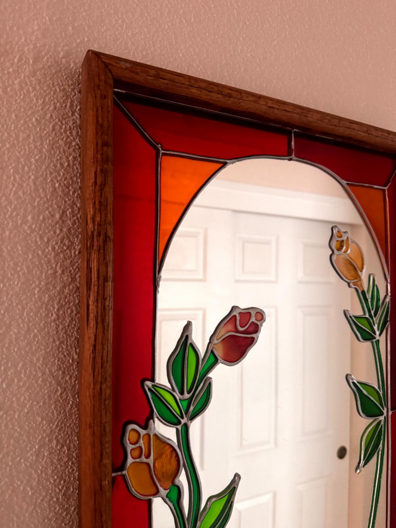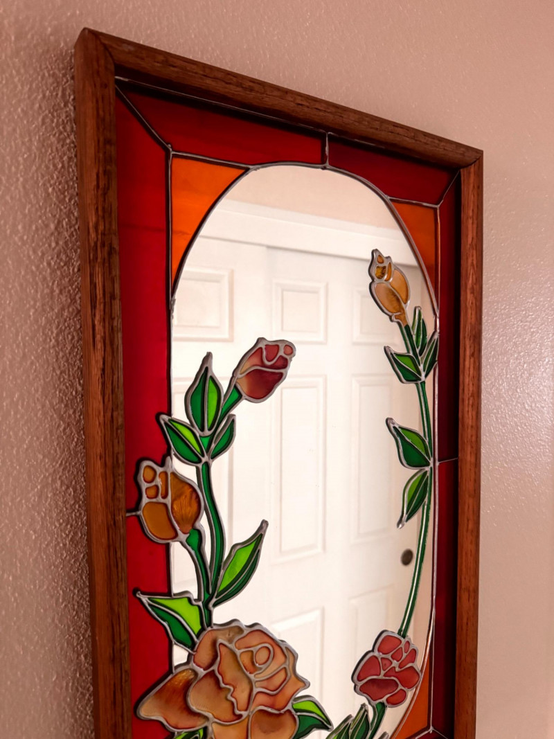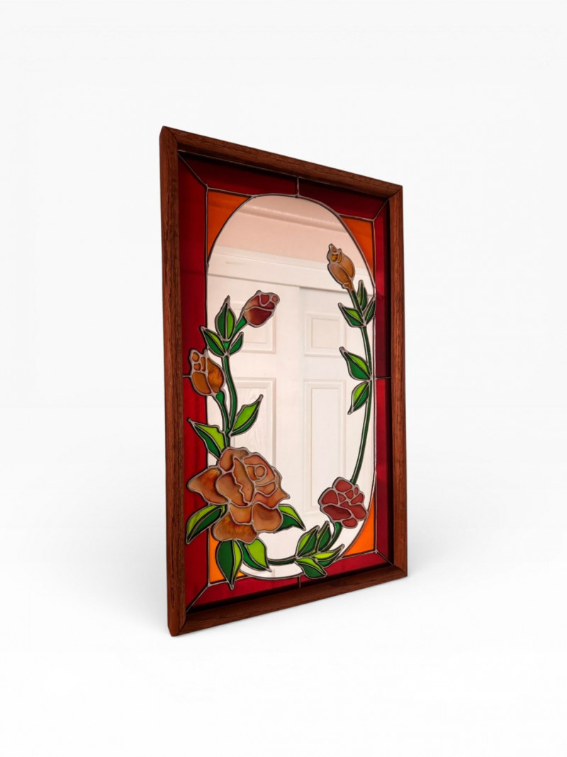 Vintage Stained Glass Floral Mirror Wood Frame.
