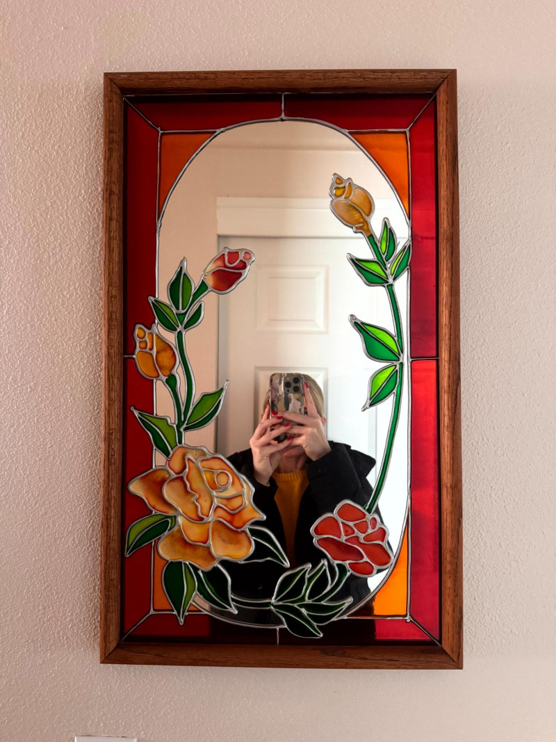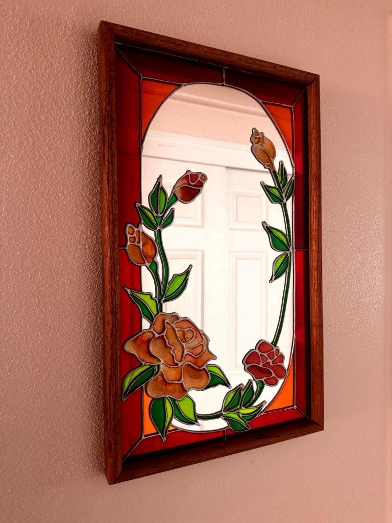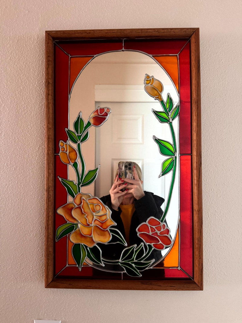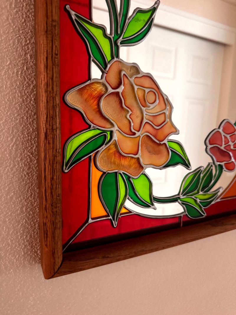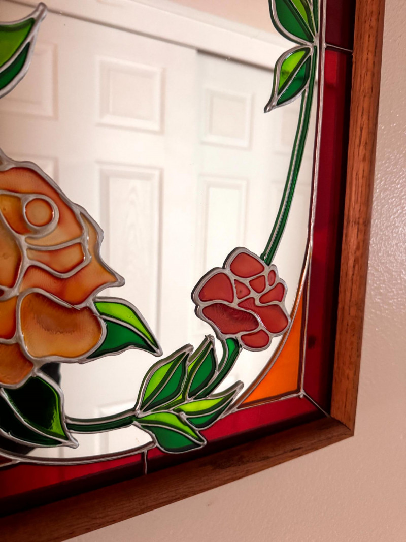 Vintage Stained Glass Floral Mirror Wood Frame.