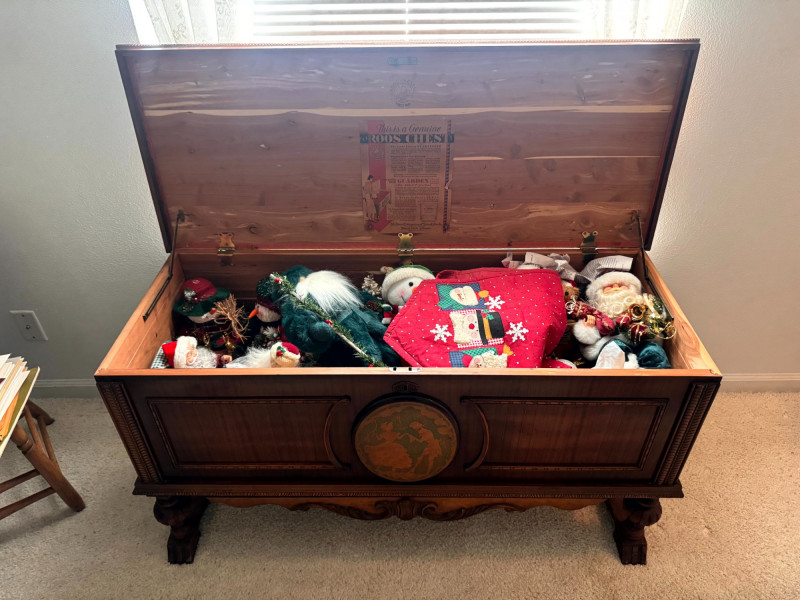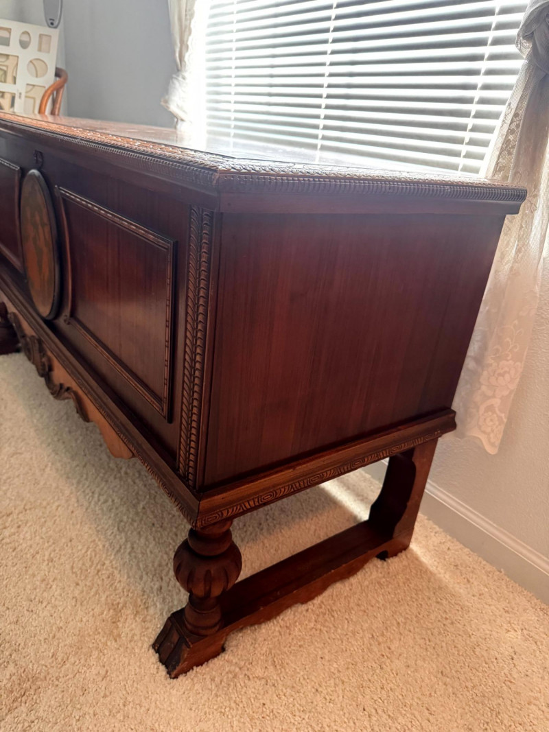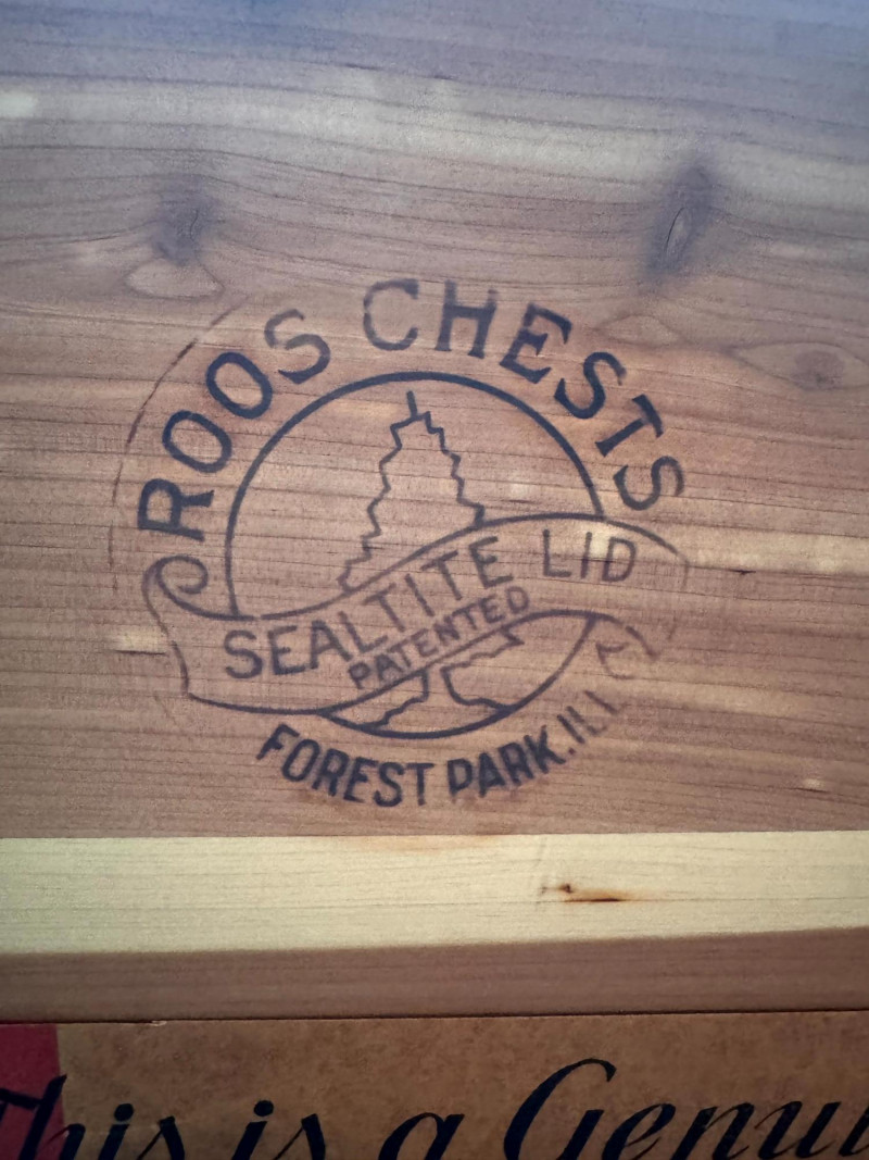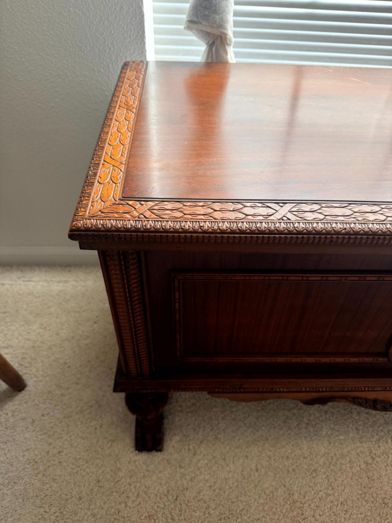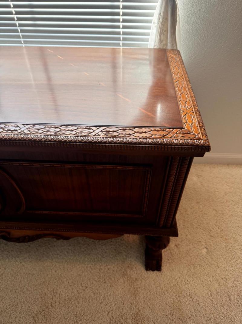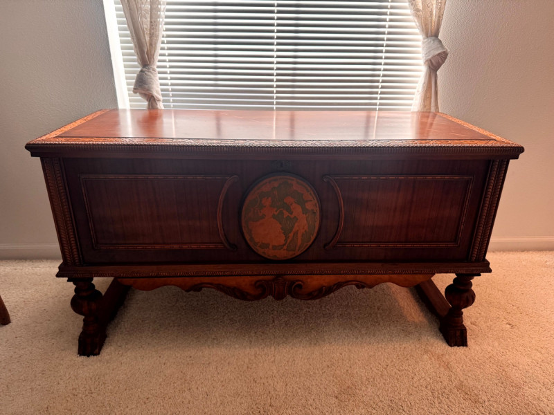 Vintage Roos Cedar Chest Dancing Inlay Carved Legs.
