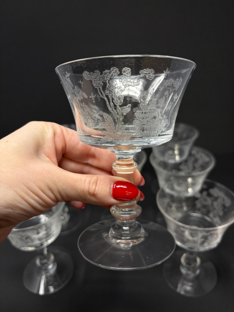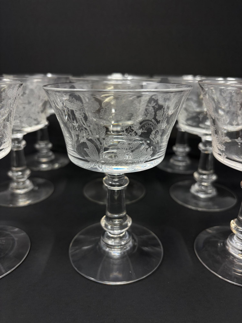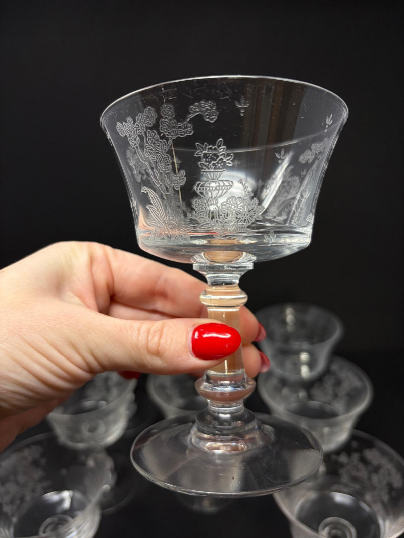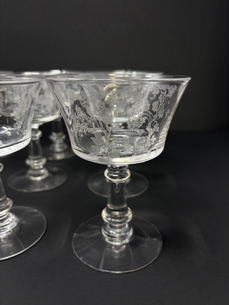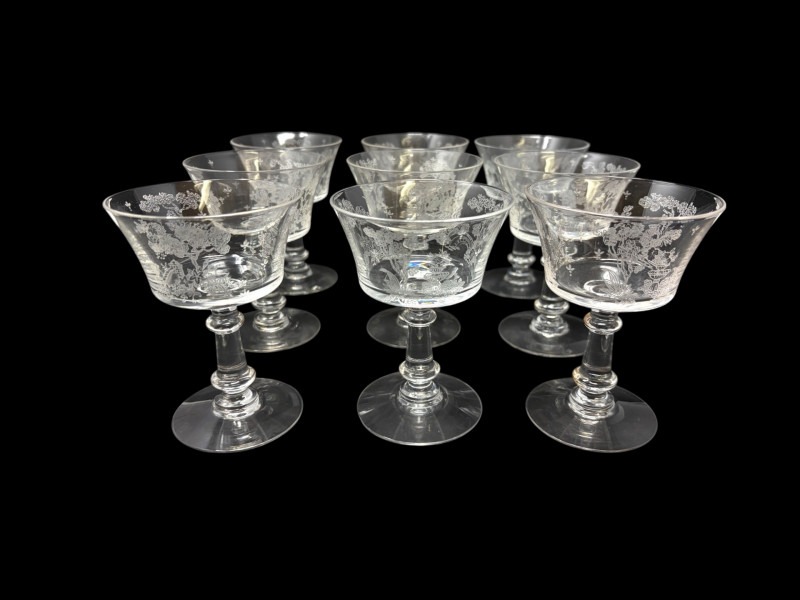 9 Fostoria Style Garden Scene Etched Cocktail Coupes.