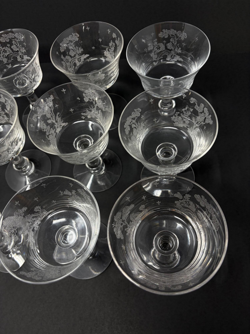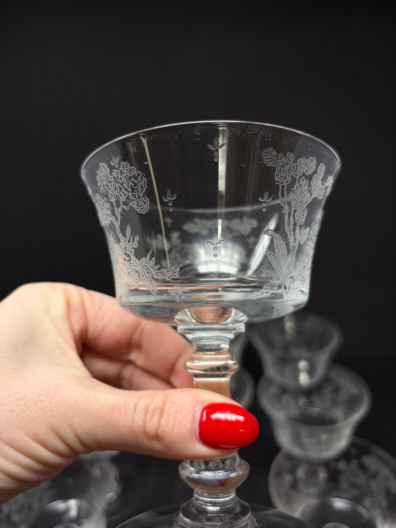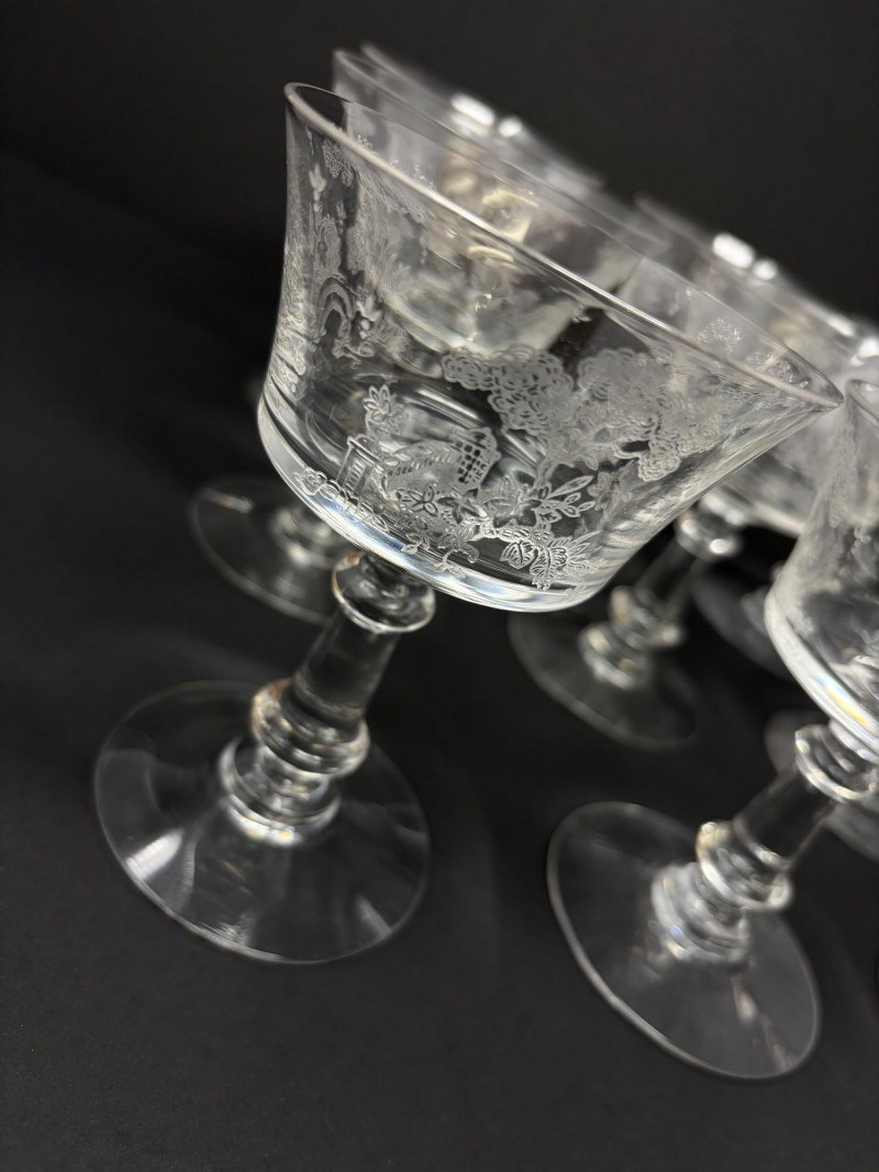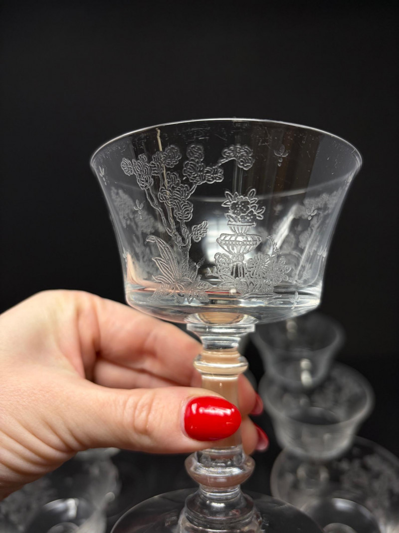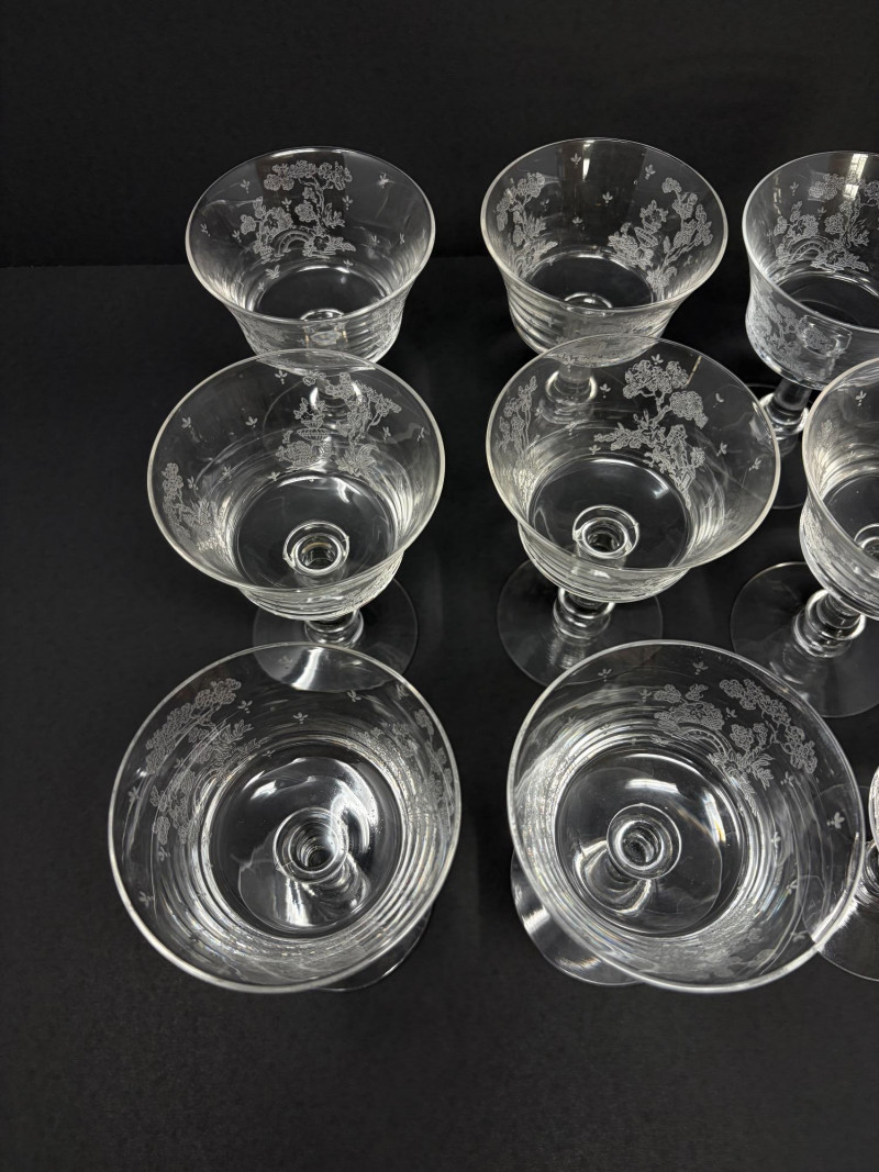 9 Fostoria Style Garden Scene Etched Cocktail Coupes.