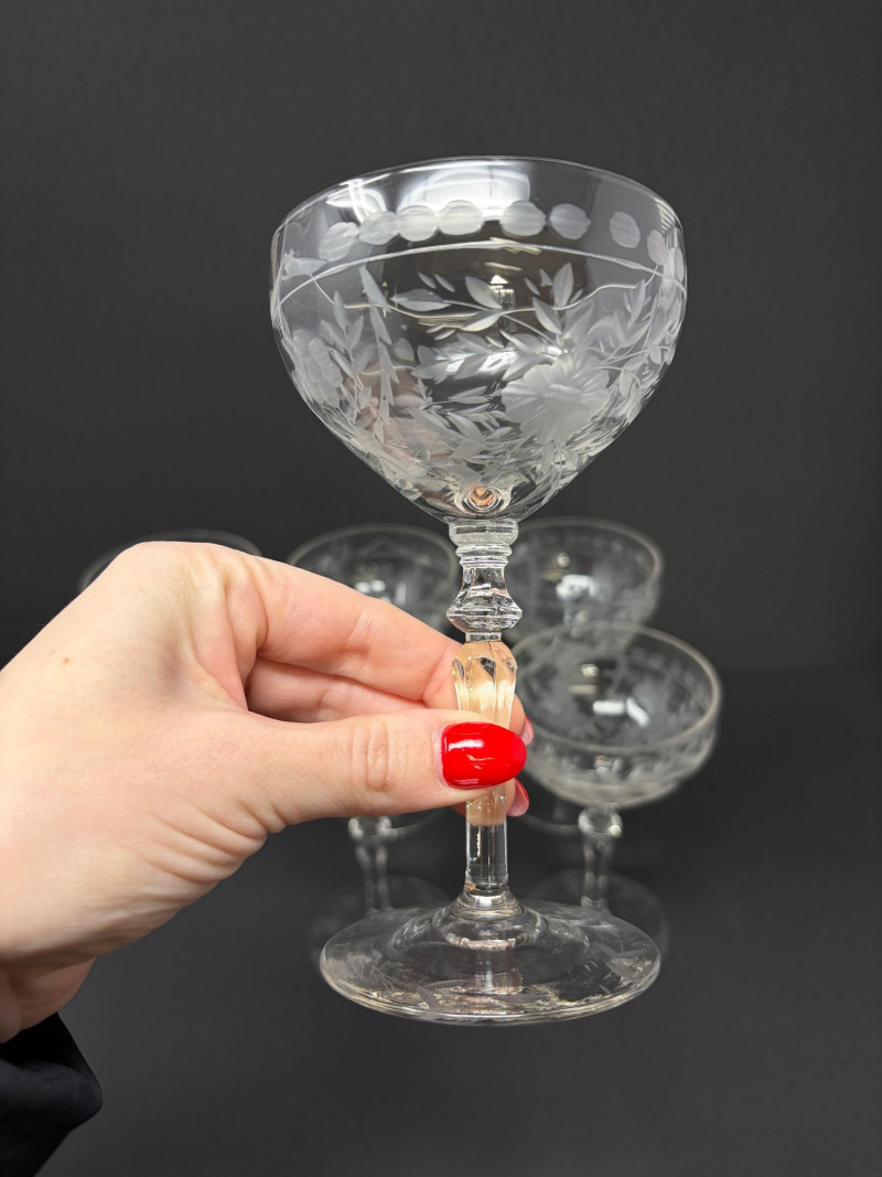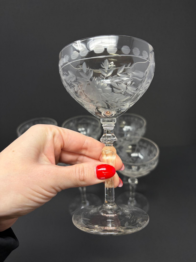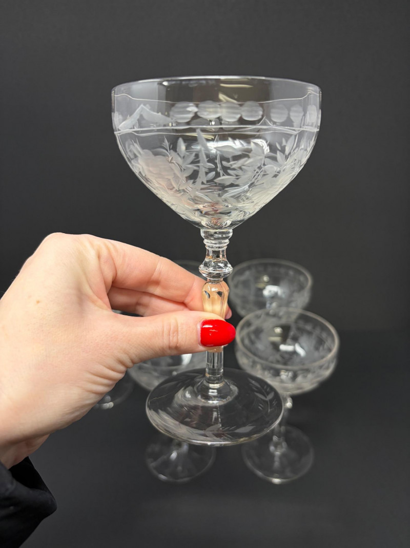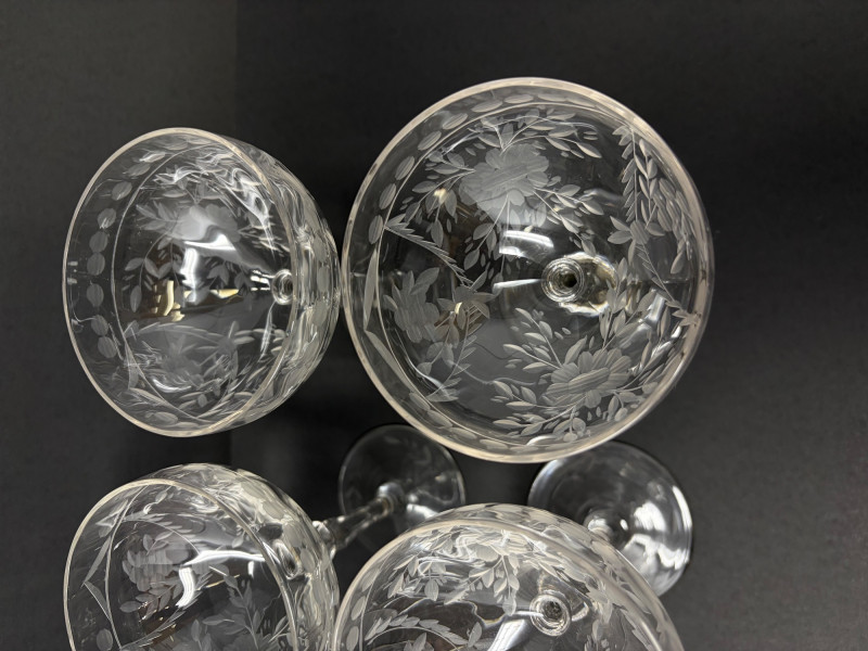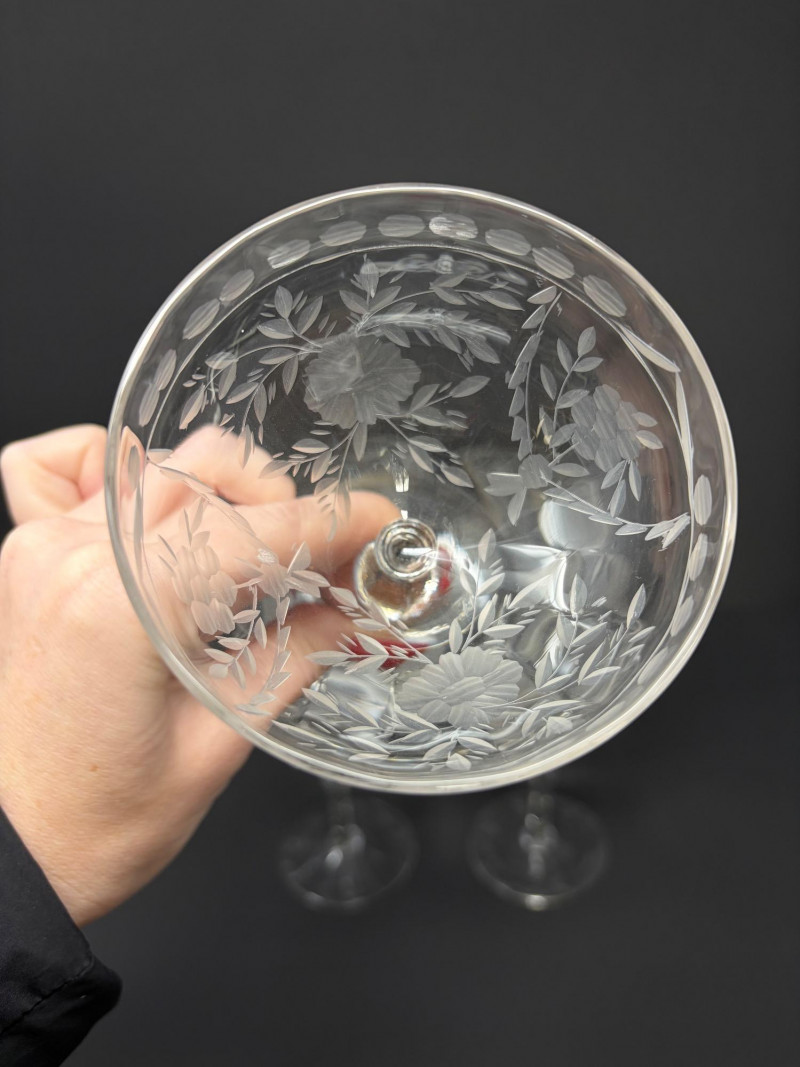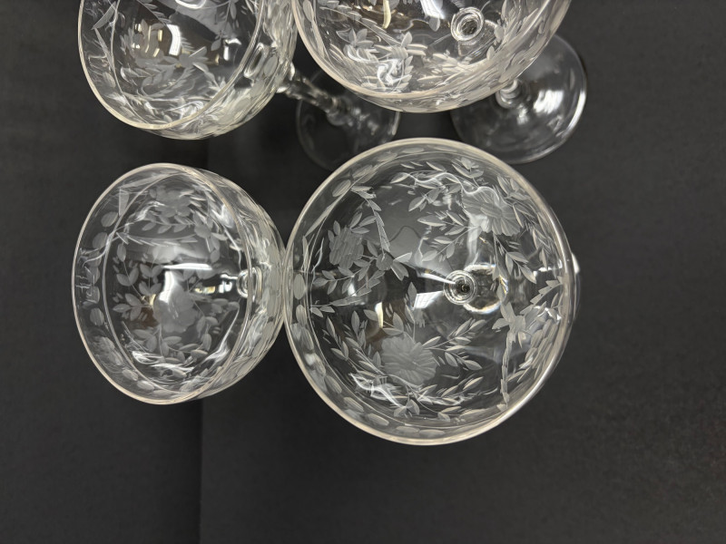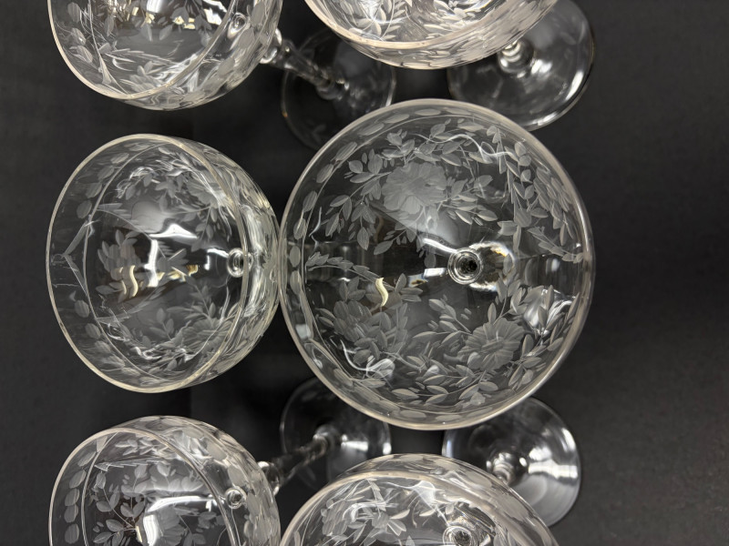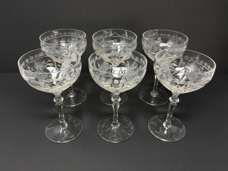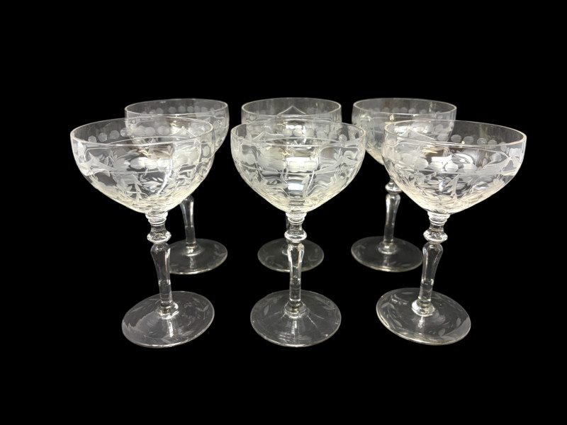 Set of 6 Etched Floral Crystal Stemmed Cocktail Glasses.