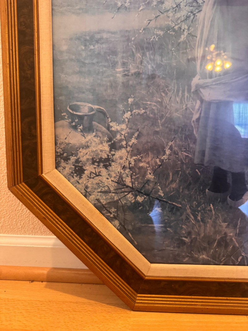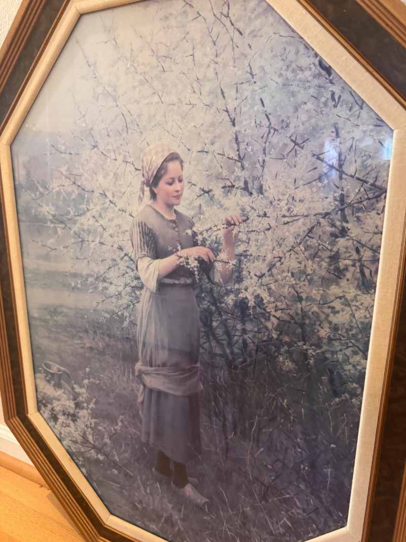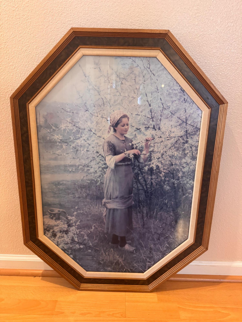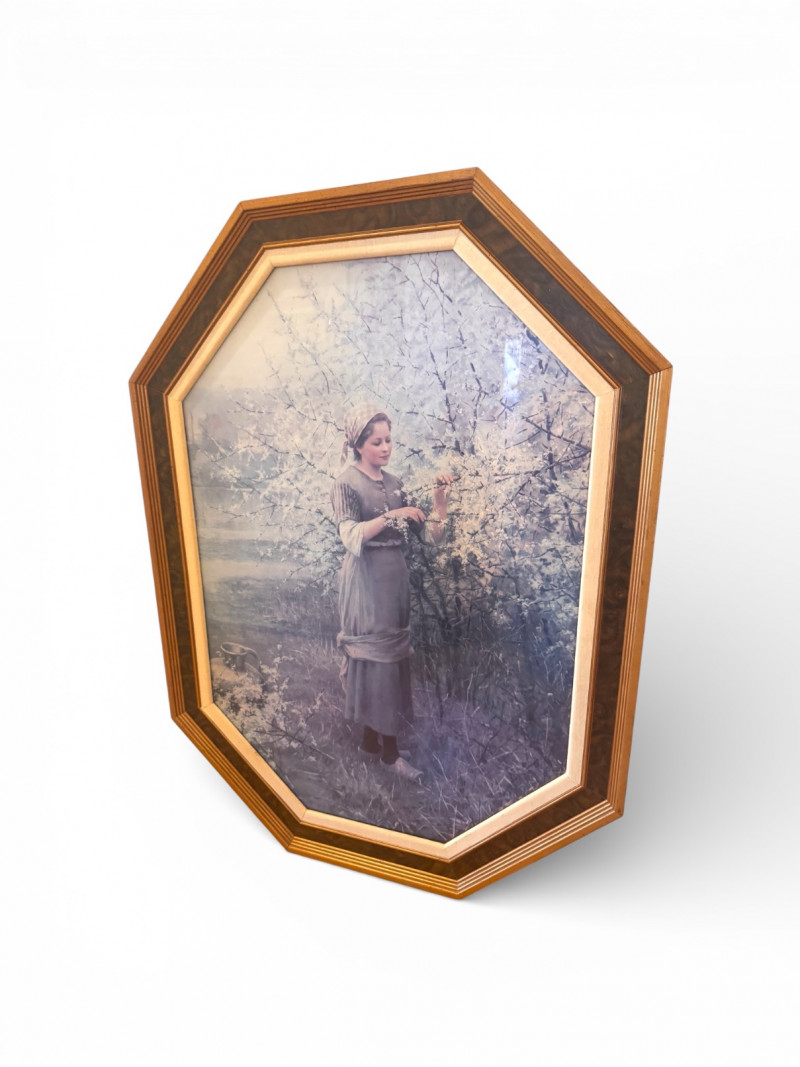 Large Vintage Lady In Blossom Print in Octagonal Wood Frame.