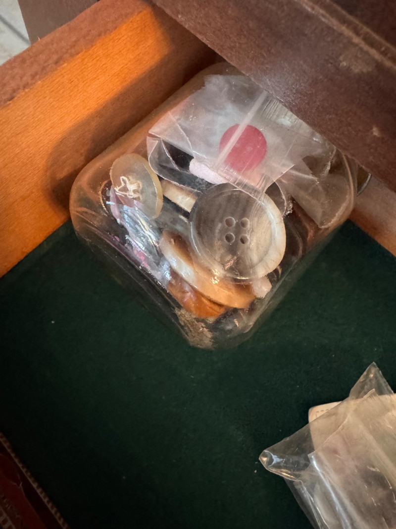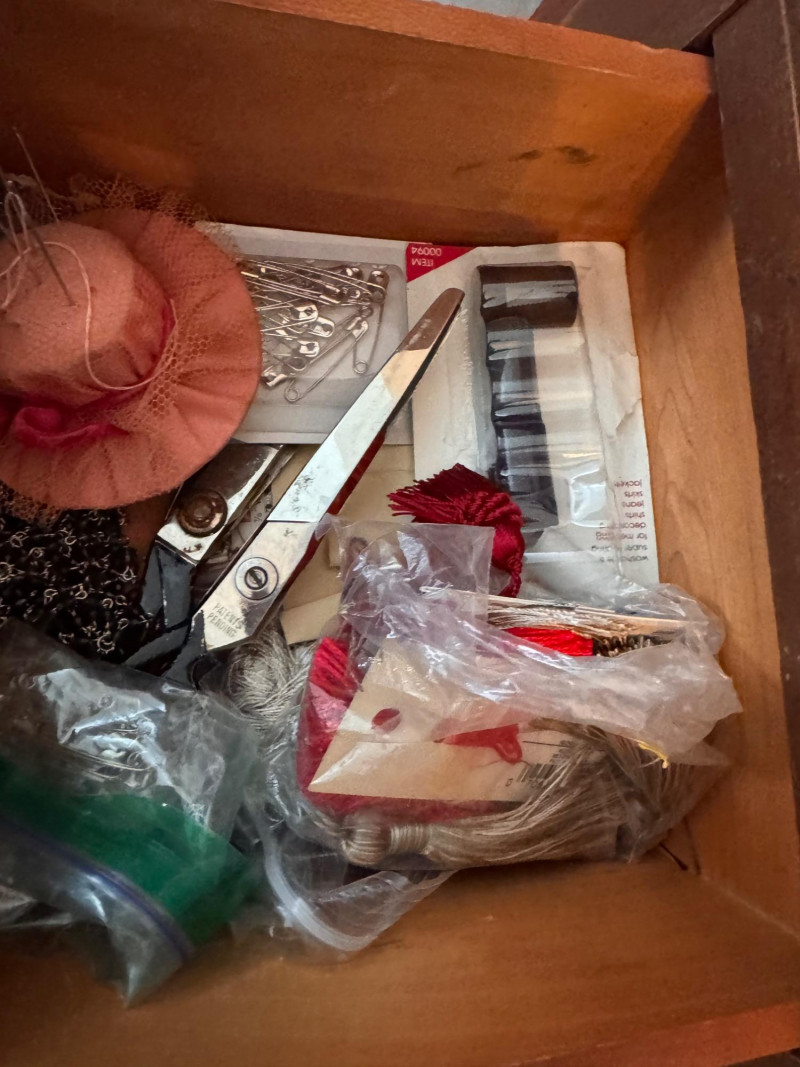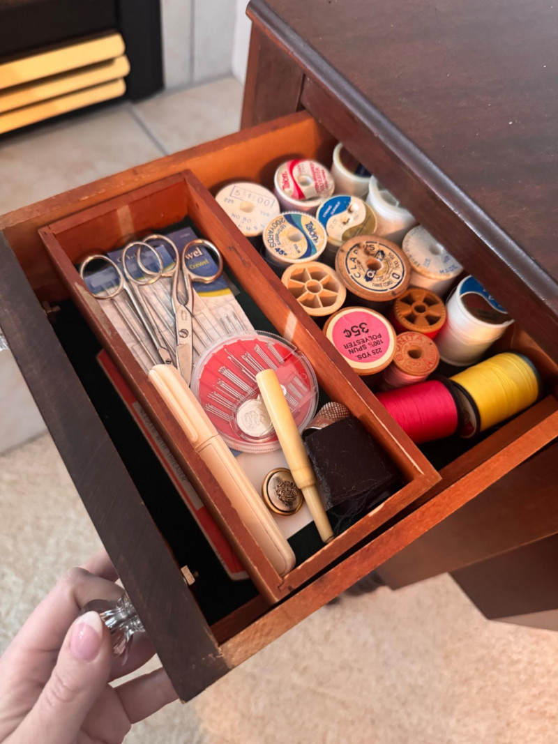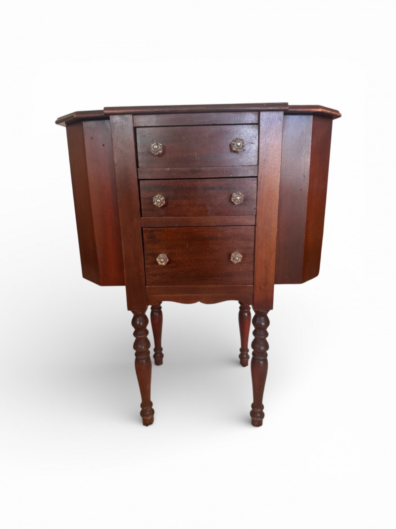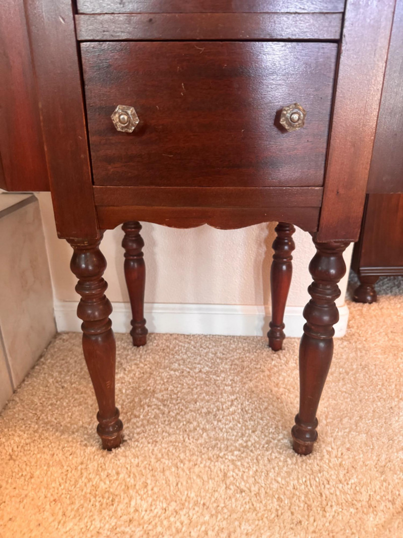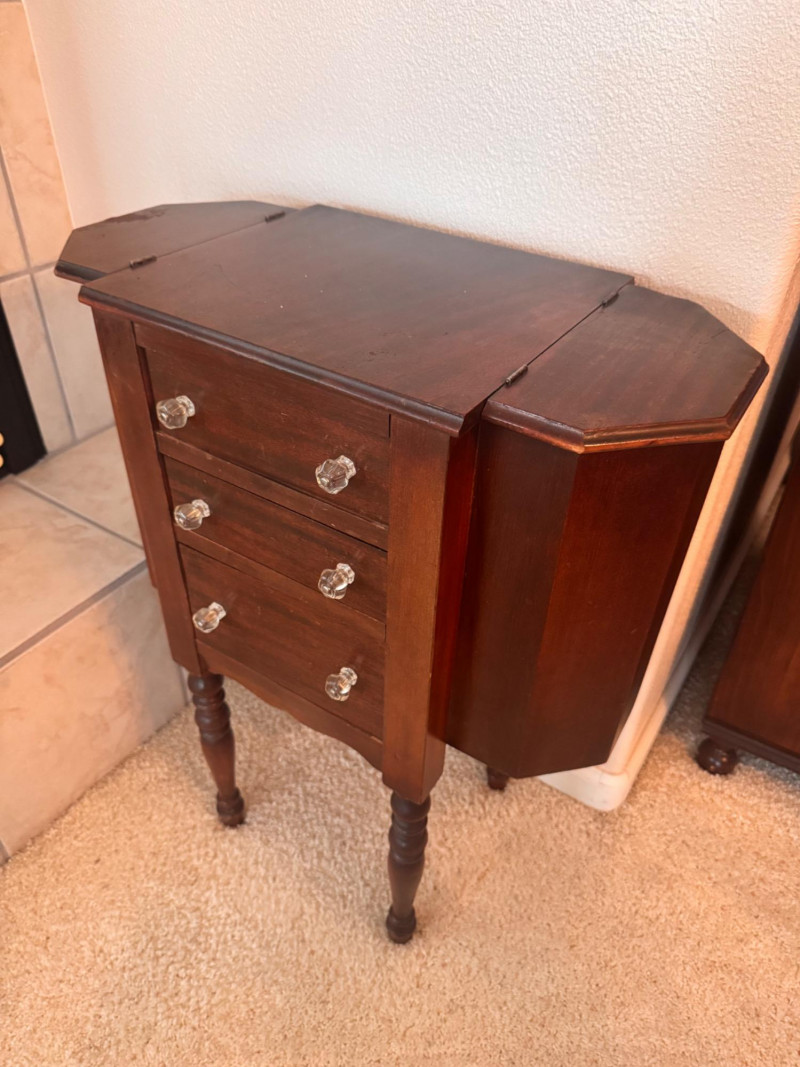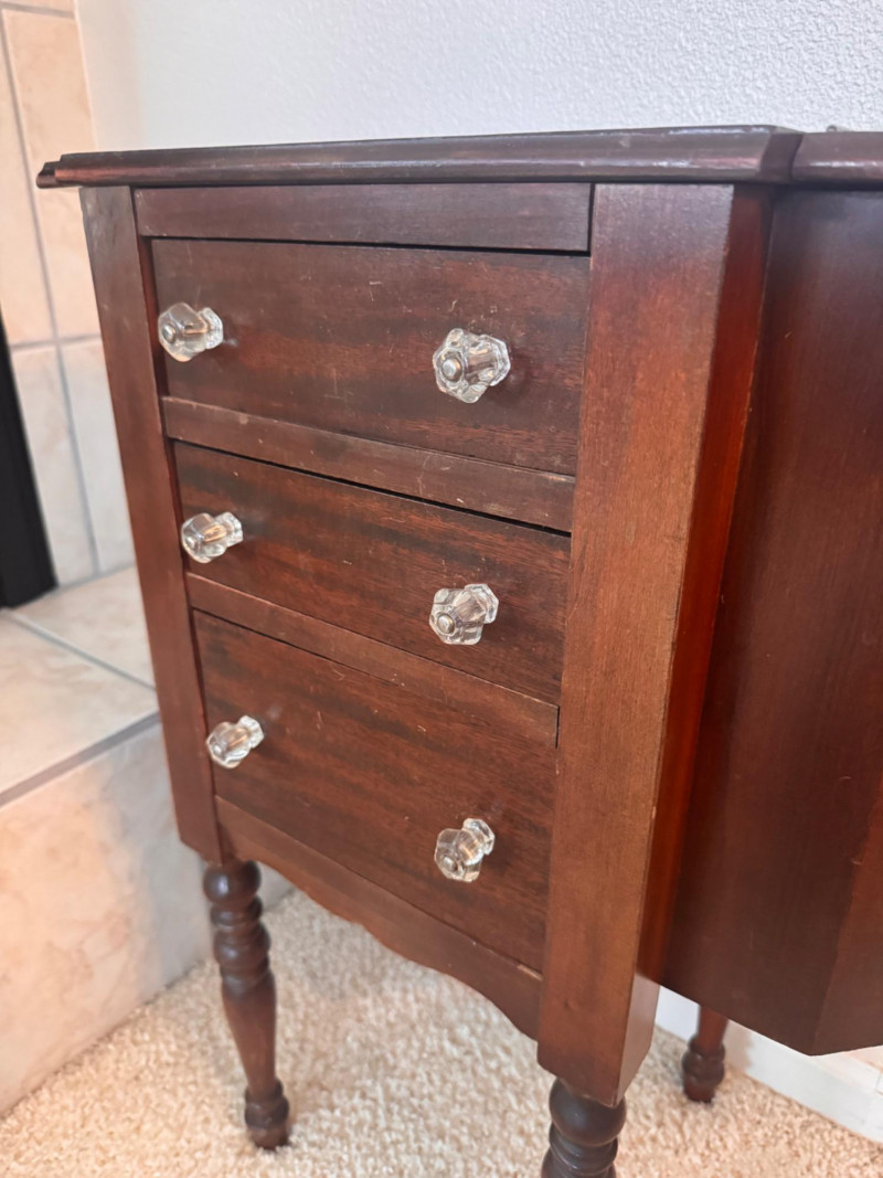 Martha Washington Style Vintage Sewing Cabinet w/ Glass Pulls.