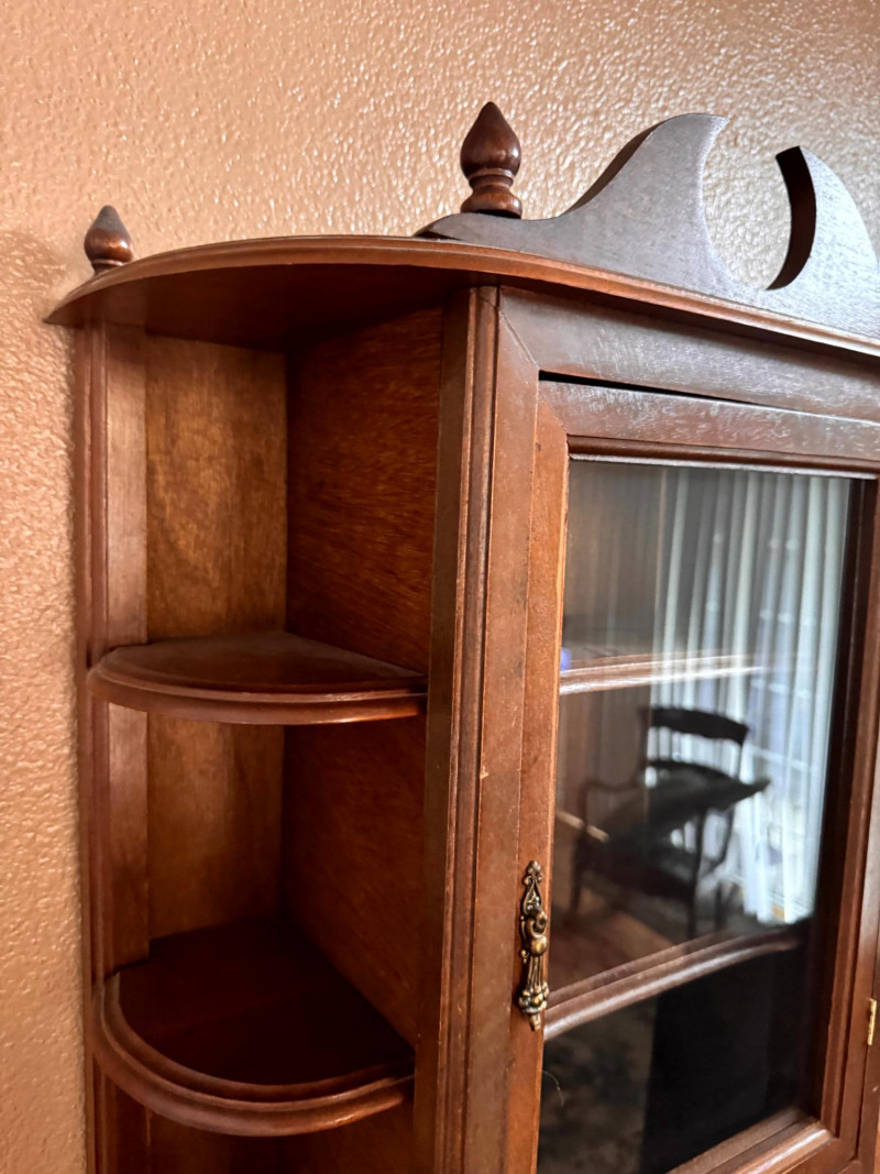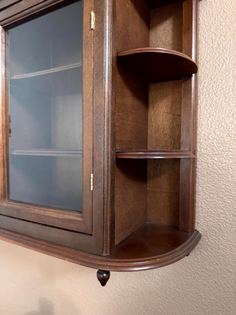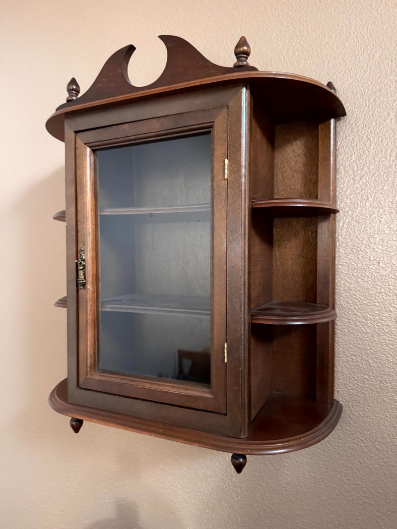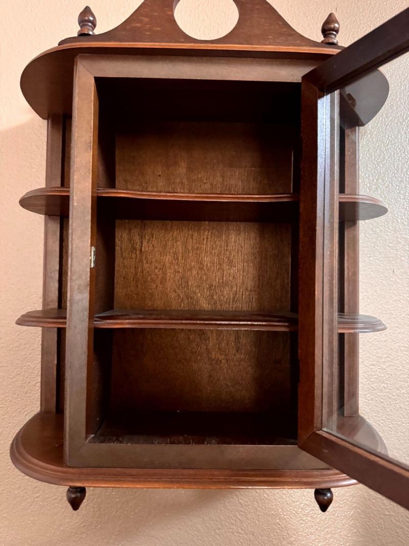 Vintage Wood Wall Curio Cabinet w/ Glass Door.