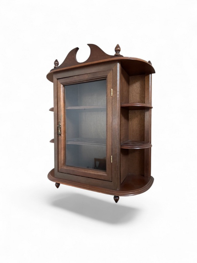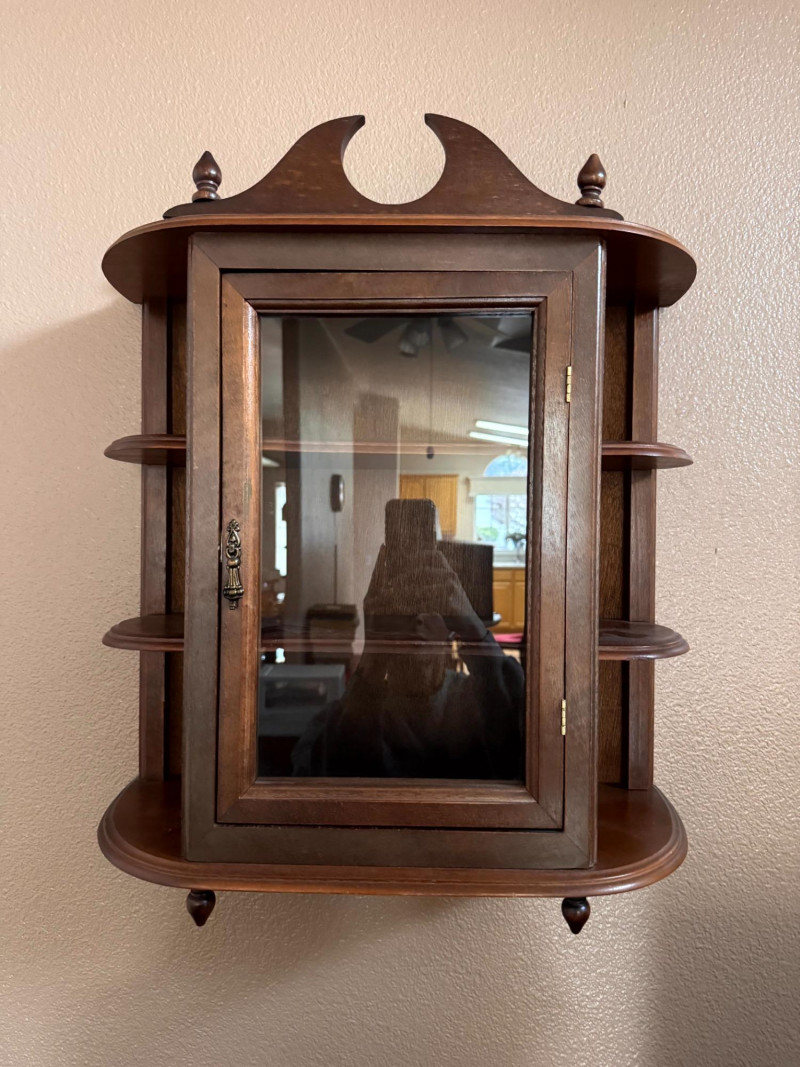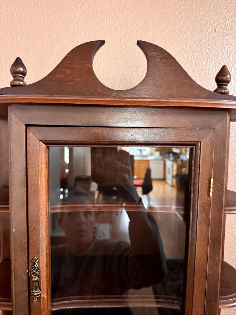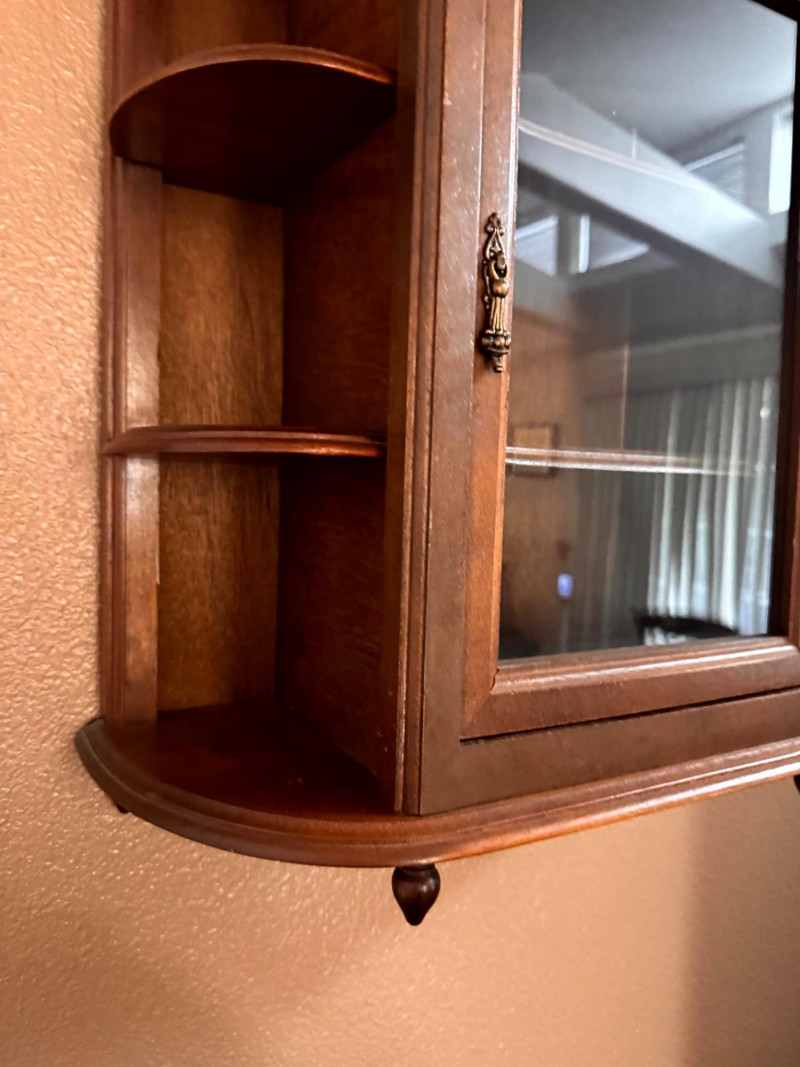 Vintage Wood Wall Curio Cabinet w/ Glass Door.