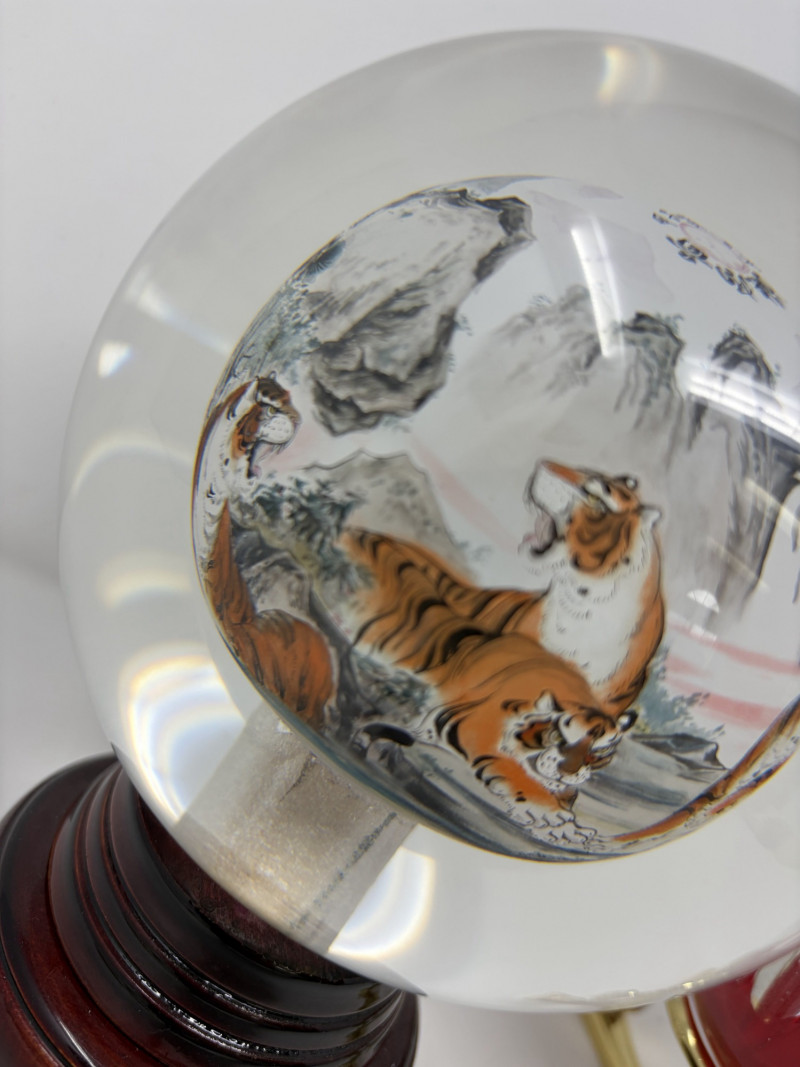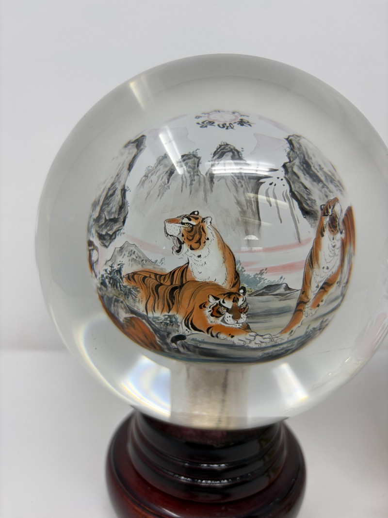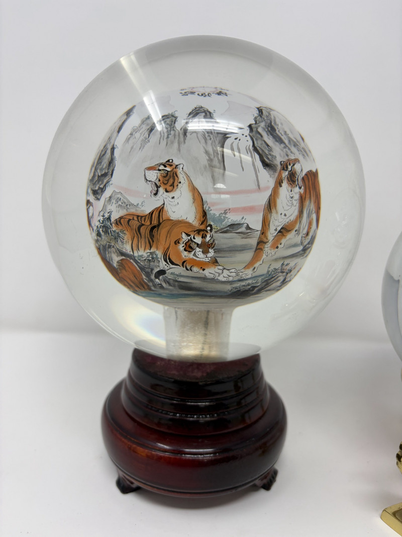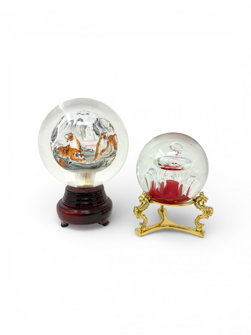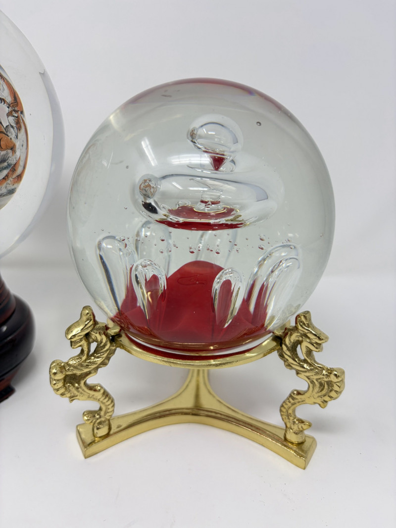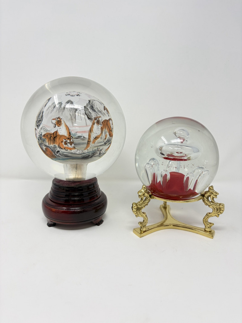 Large Asian Style Tiger Glass Globe & Red Bubble Orb on Stands.