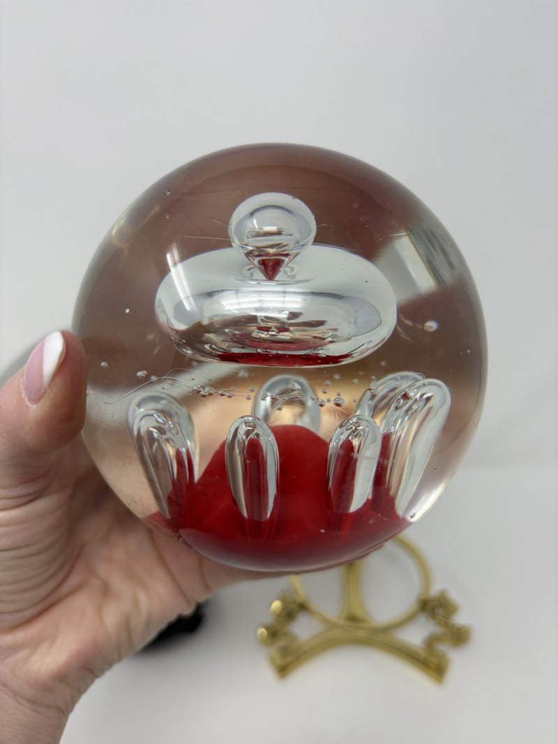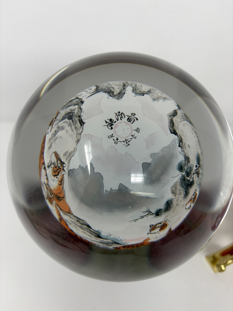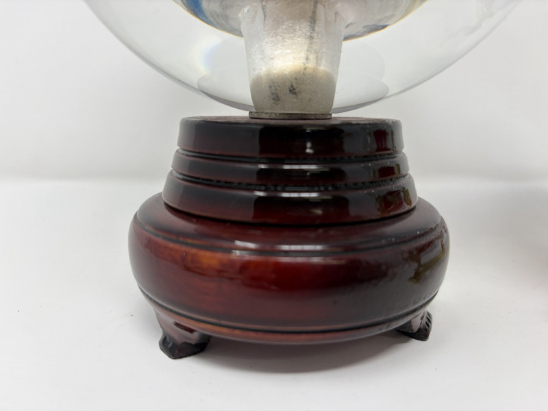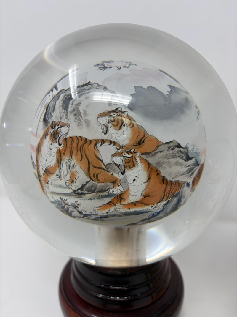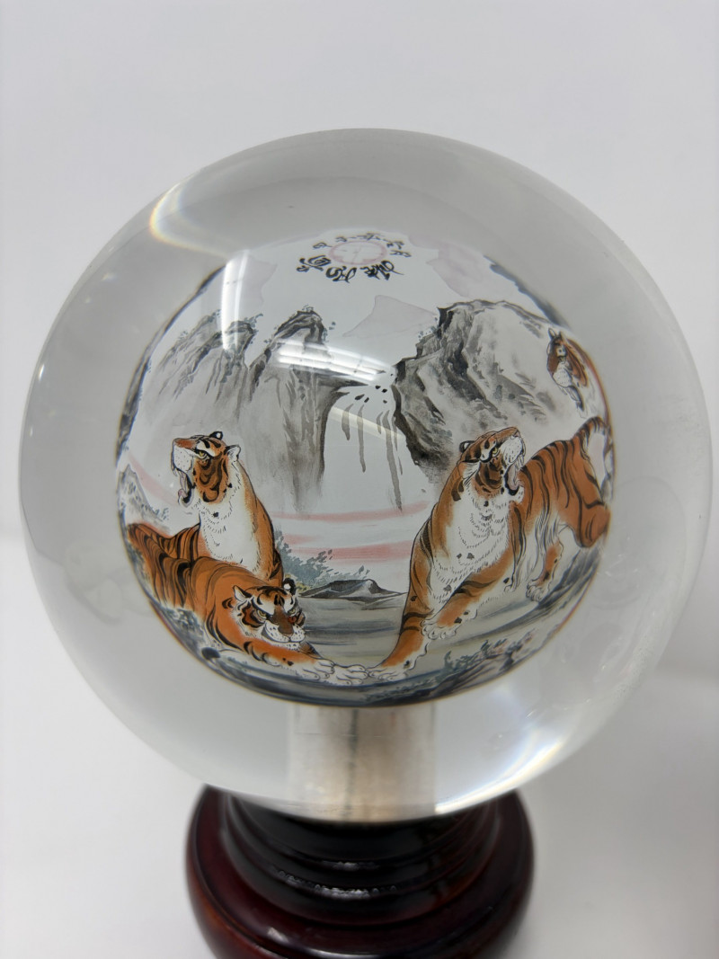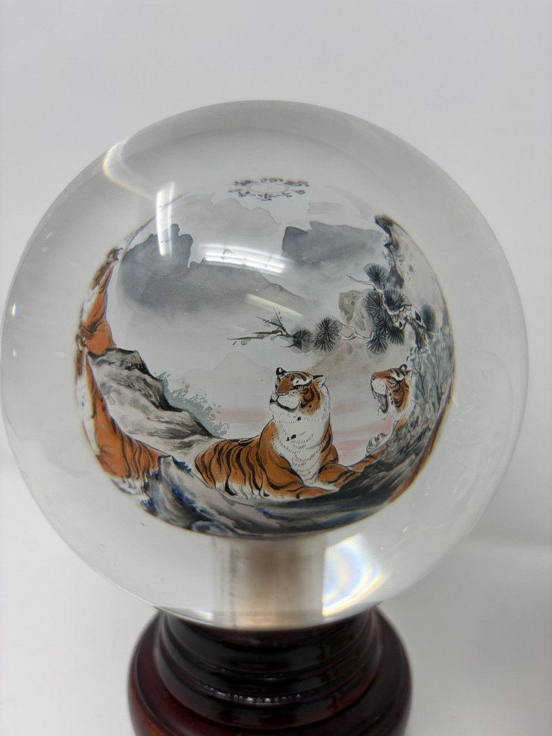 Large Asian Style Tiger Glass Globe & Red Bubble Orb on Stands.