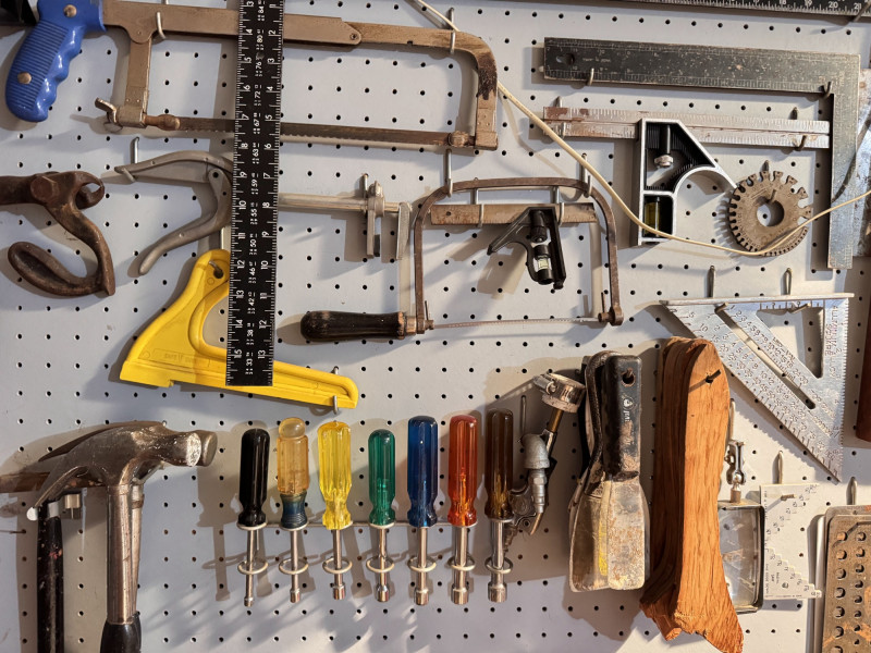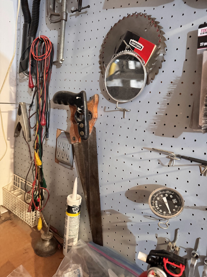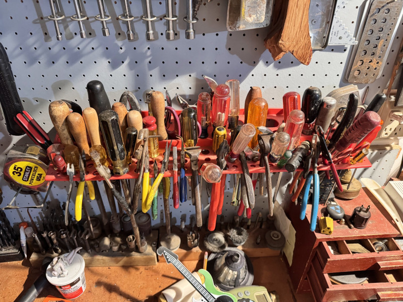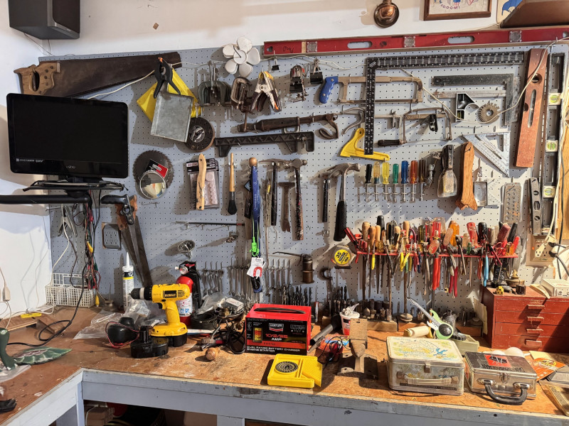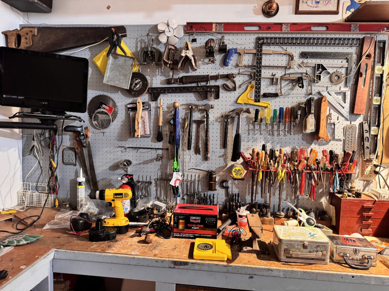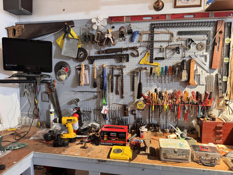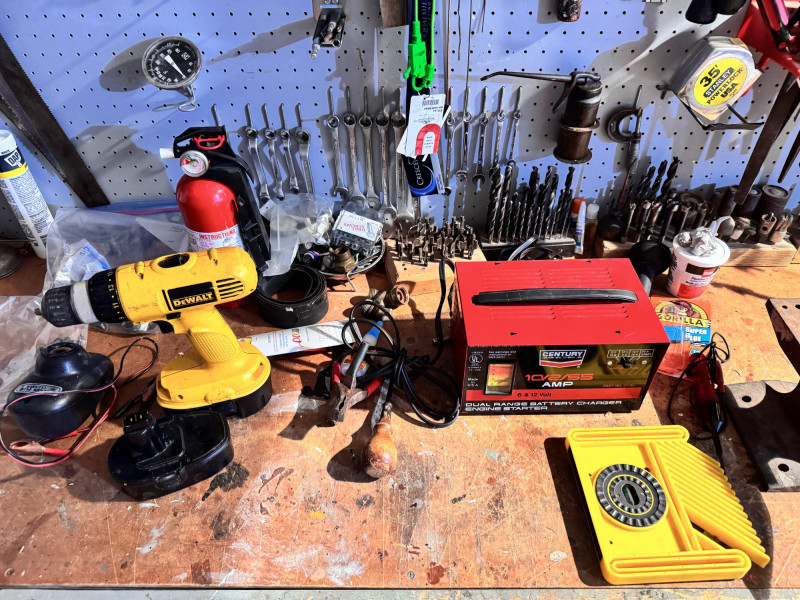 Large Wall-Mounted Tool Assortment w/ Charger, Drill & Anvil.