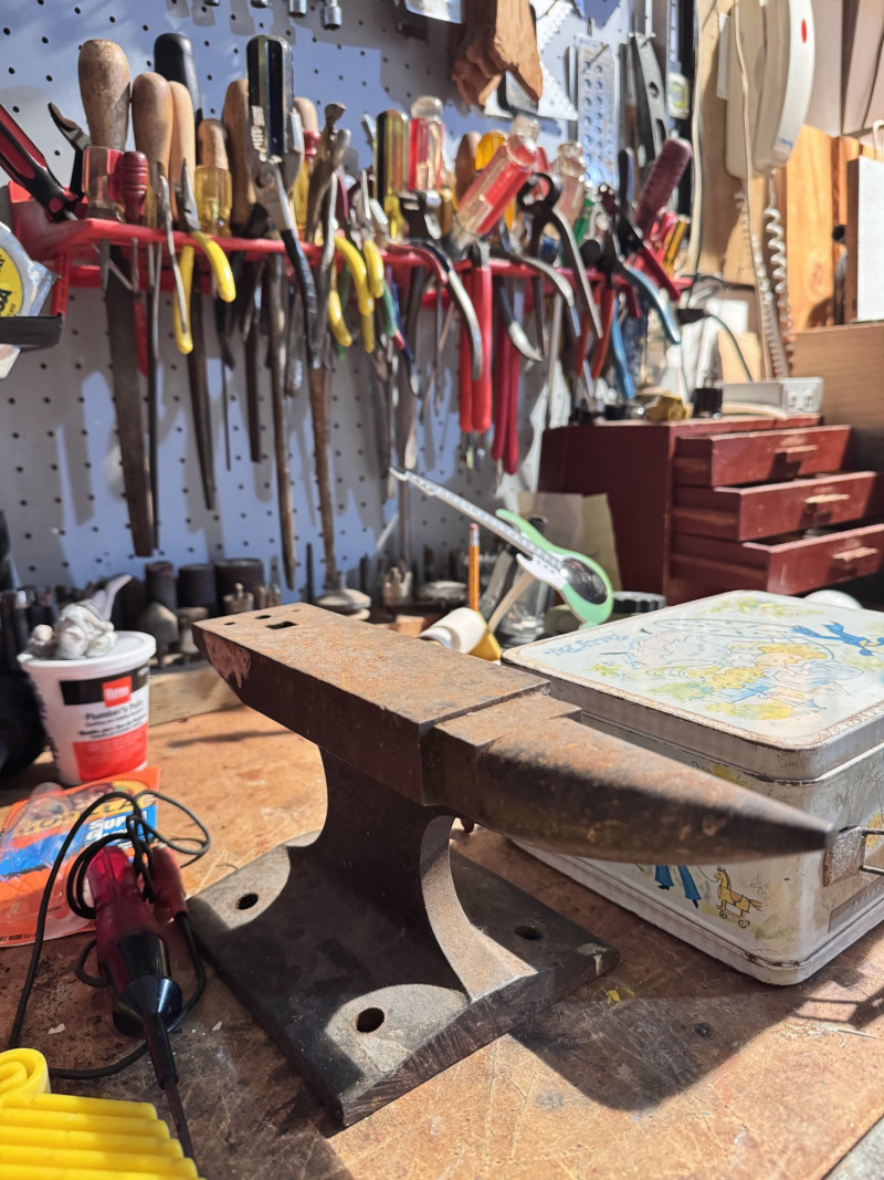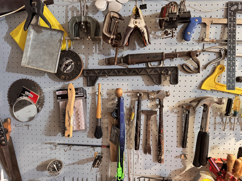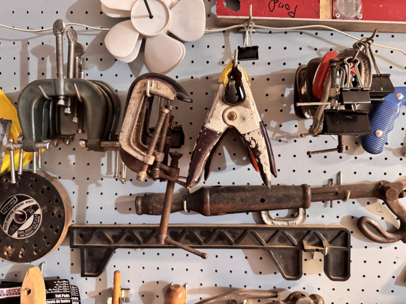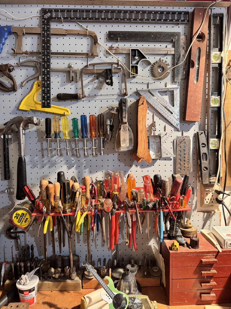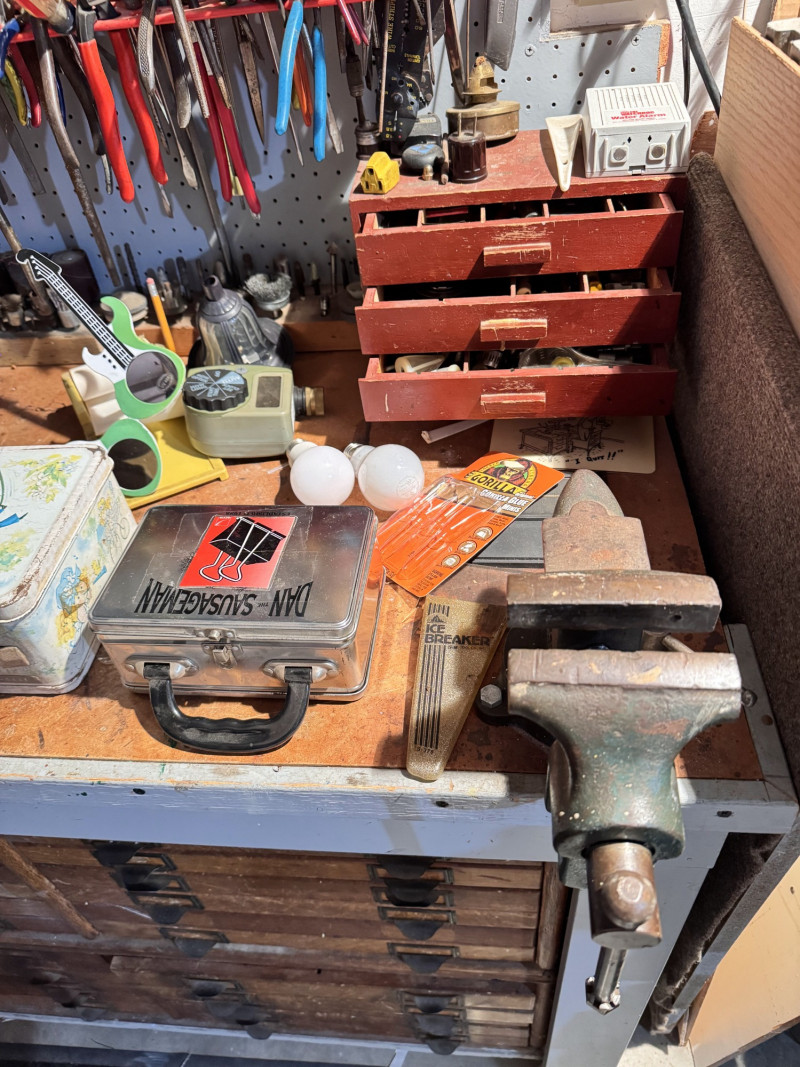Large Wall-Mounted Tool Assortment w/ Charger, Drill & Anvil.