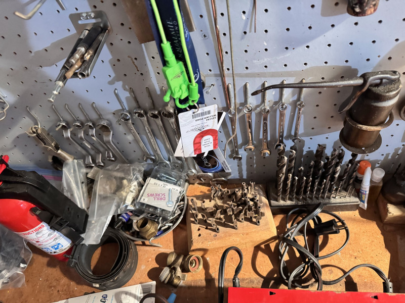 Lot # 139 - Large Wall-Mounted Tool Assortment w/ Charger, Drill & Anvil
