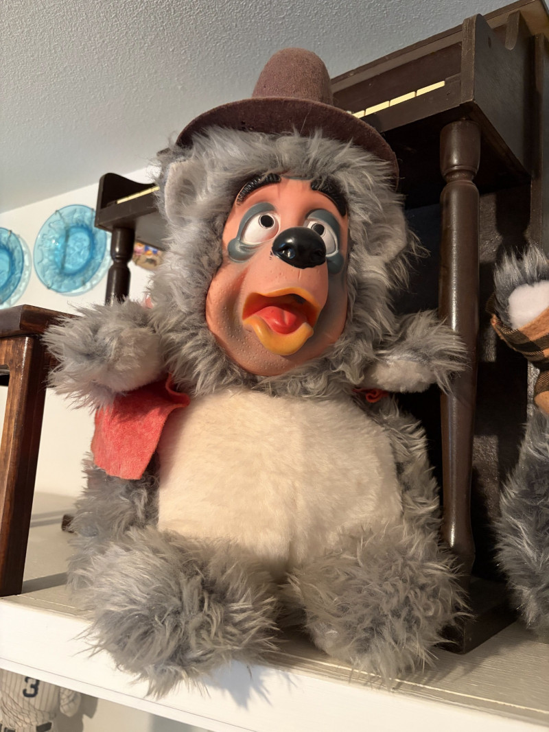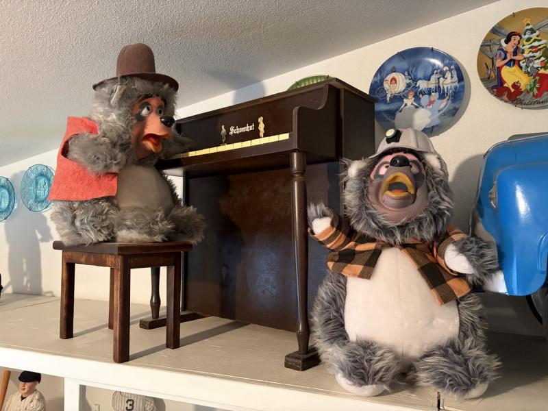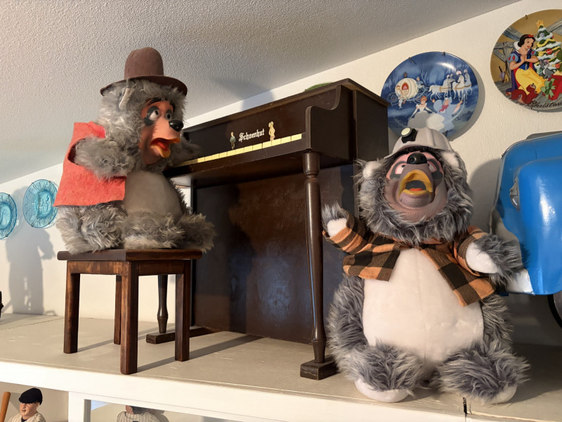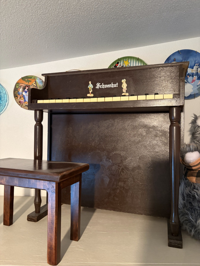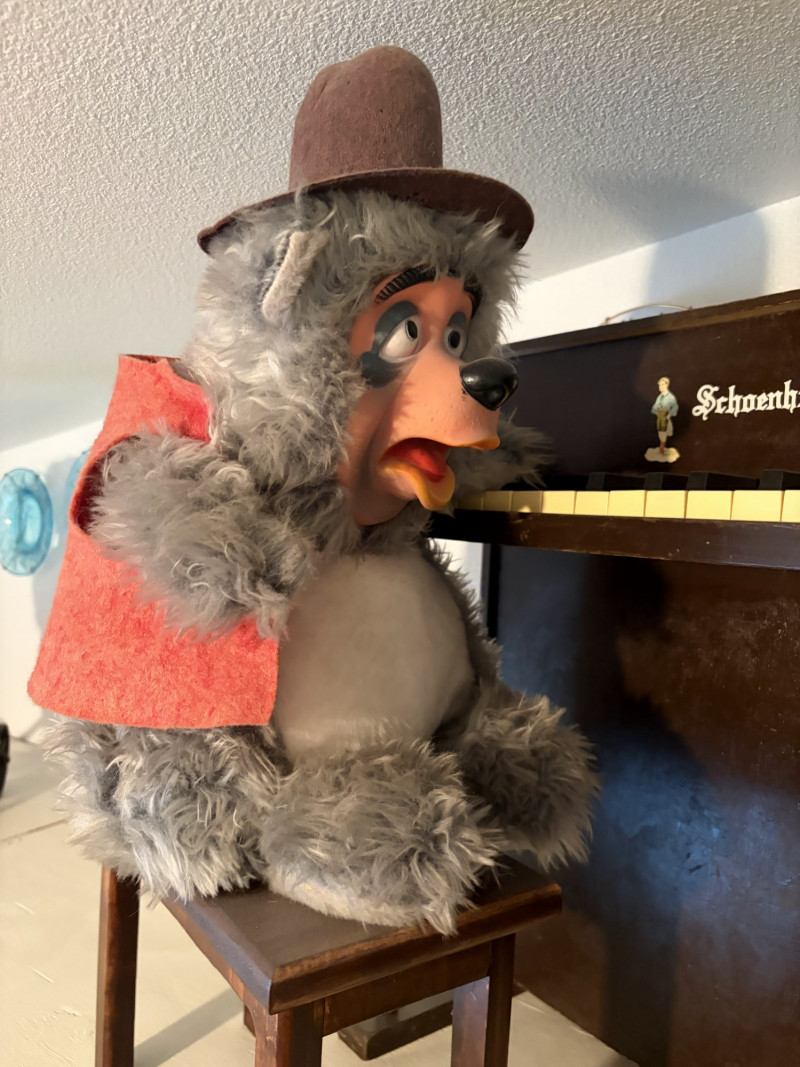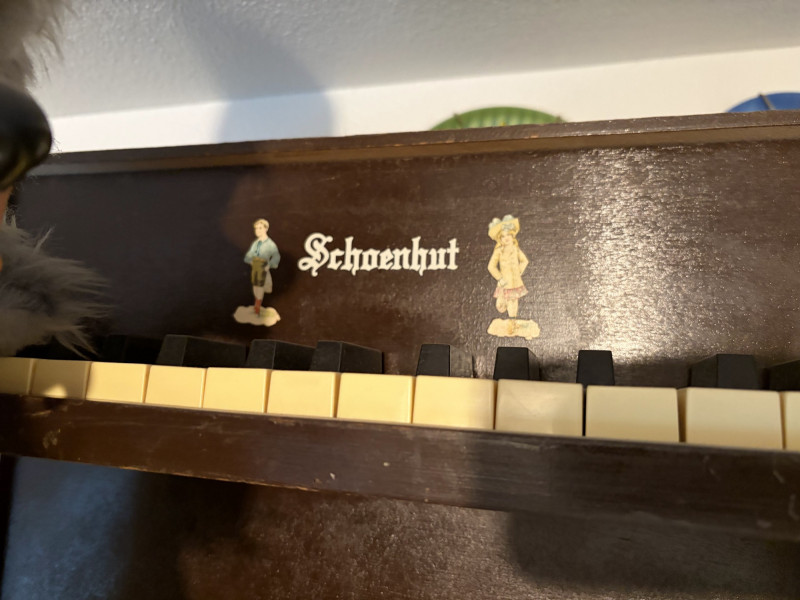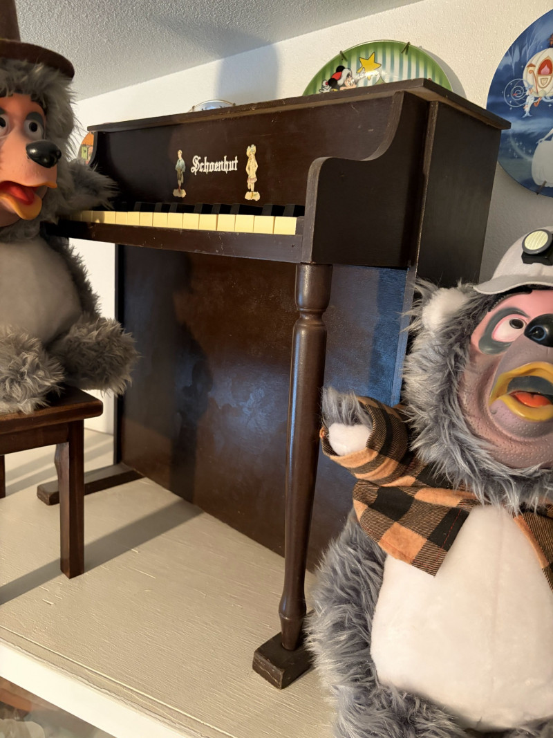 Vintage Schoenhut Upright Toy Piano w/ Vintage Disney Plush Bears.