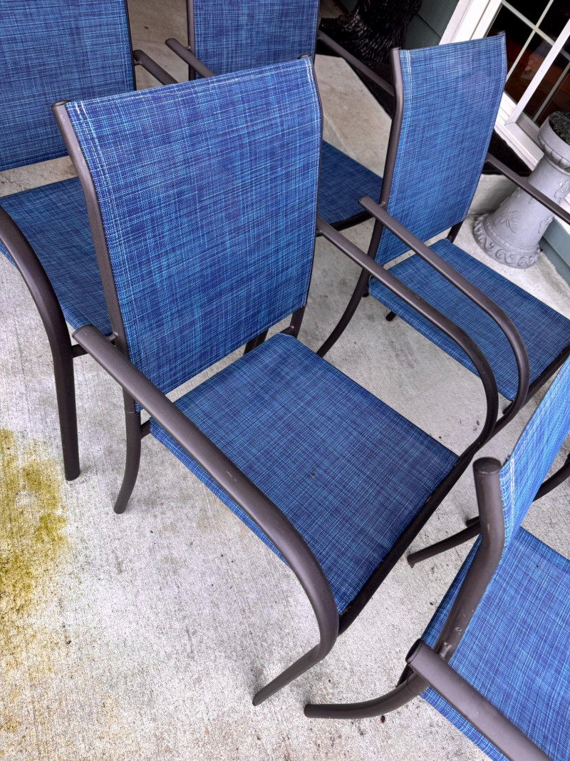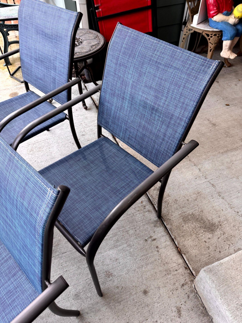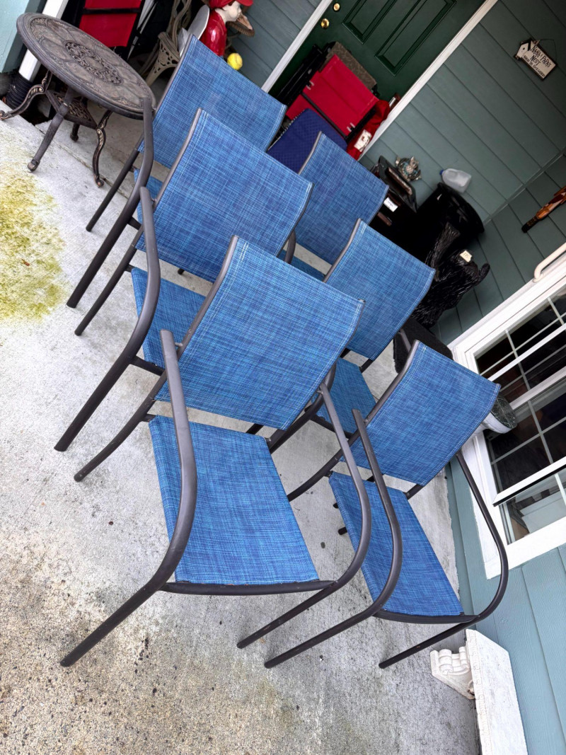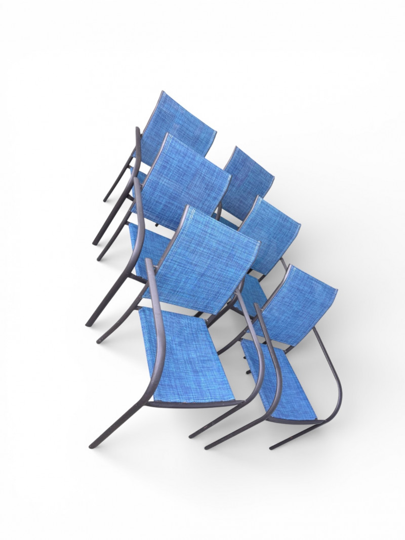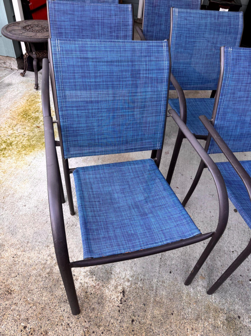 Set of 6 Blue Woven Fabric Metal Frame Patio Chairs - Great Condition.