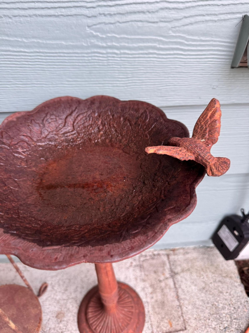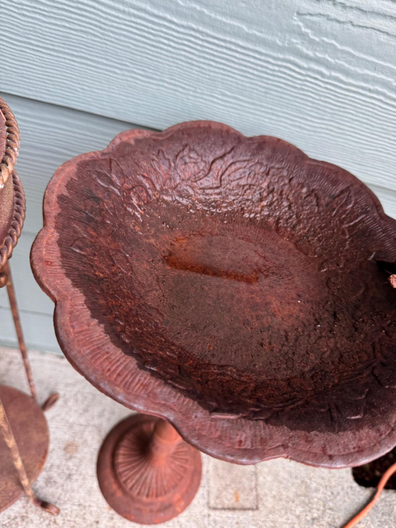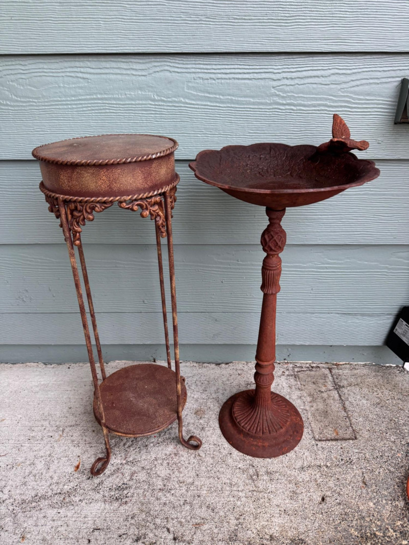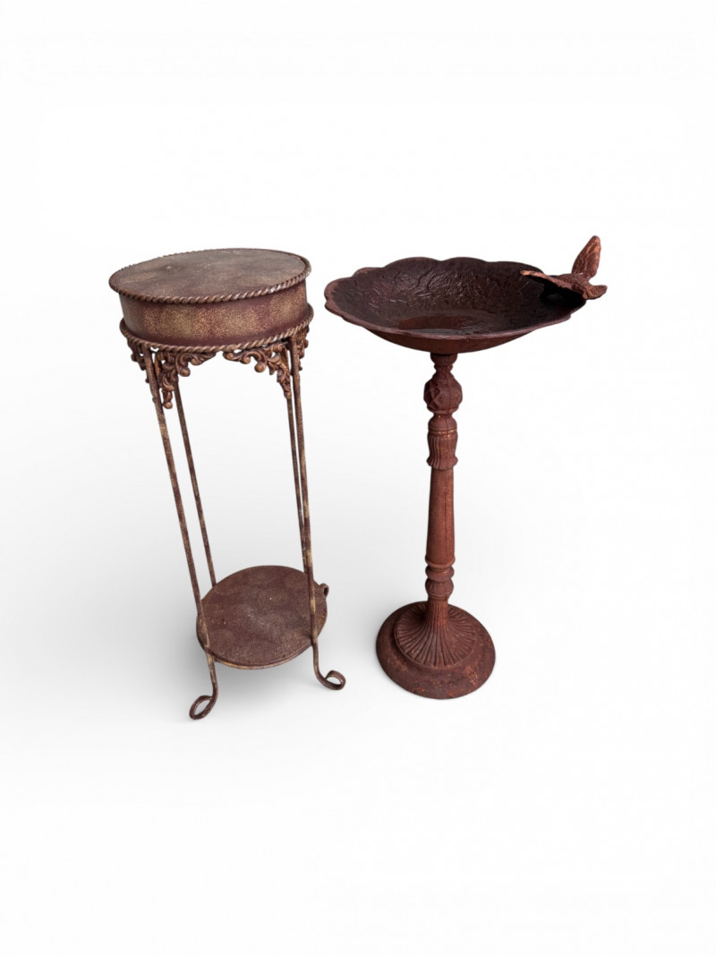 Iron Bird Bath w/ Bird Detail & Metal Plant Stand Scrollwork Design.
