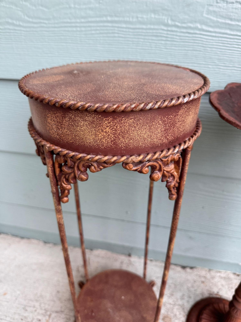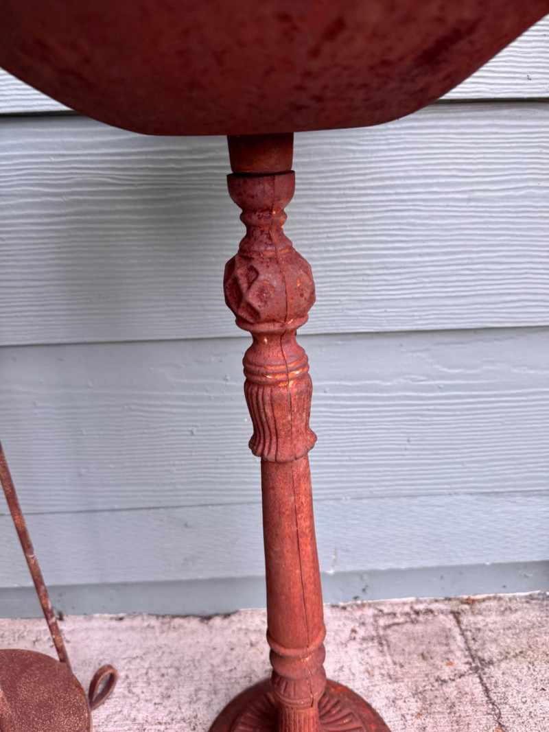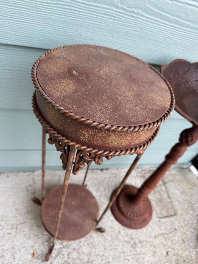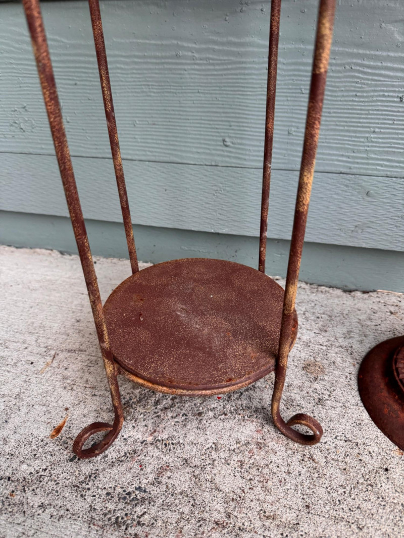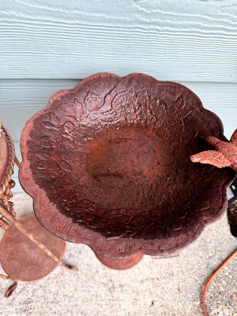 Iron Bird Bath w/ Bird Detail & Metal Plant Stand Scrollwork Design.