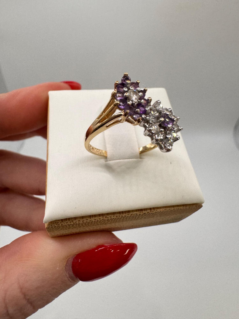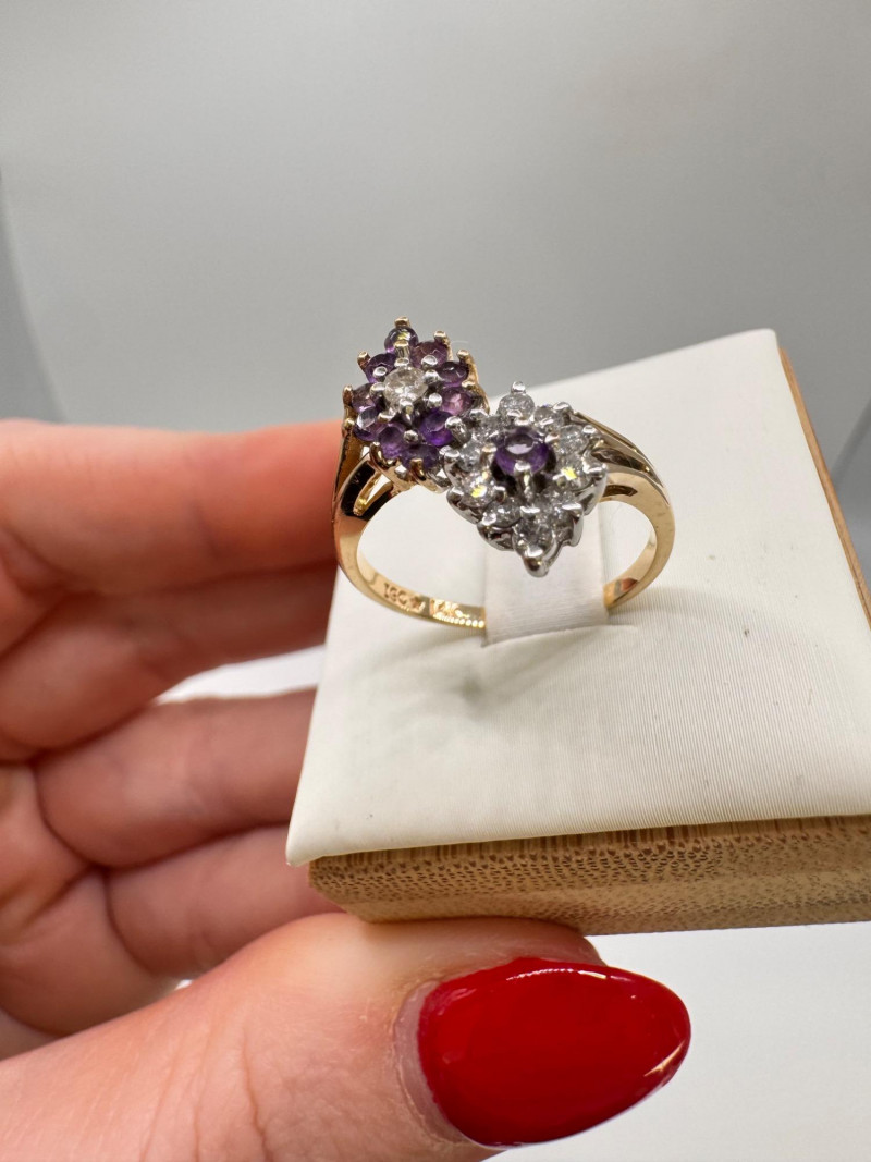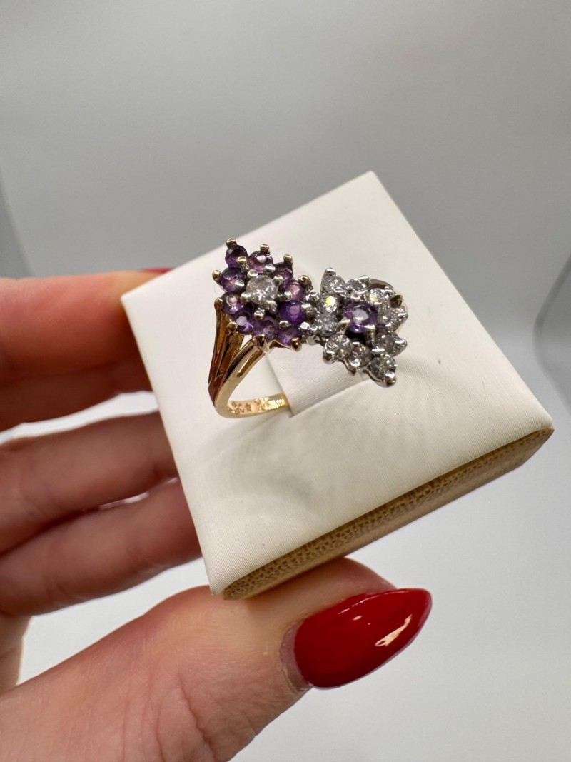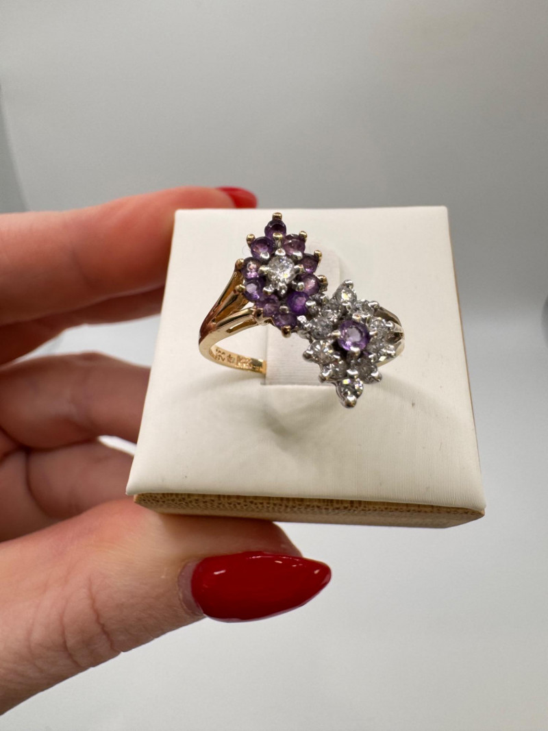 14K Gold Amethyst & Diamond Two Cluster Ring 2.49g.