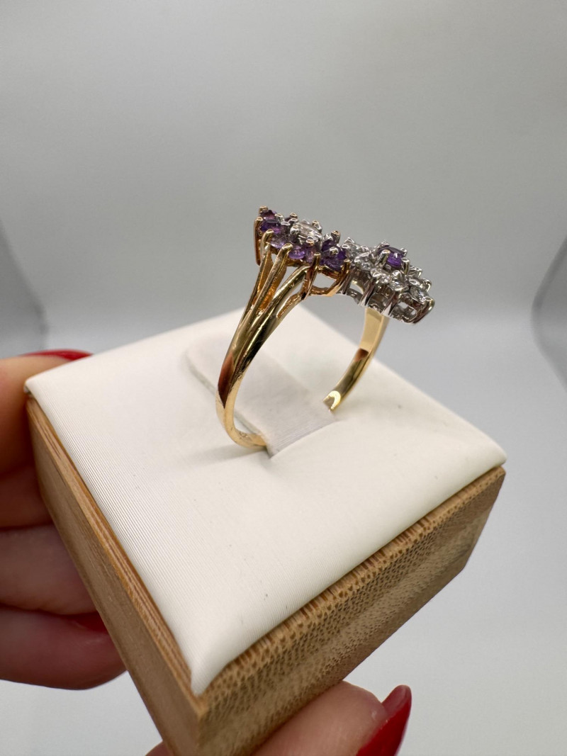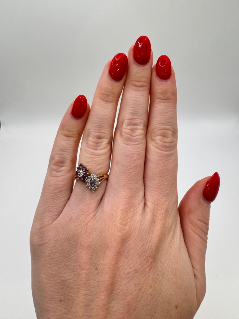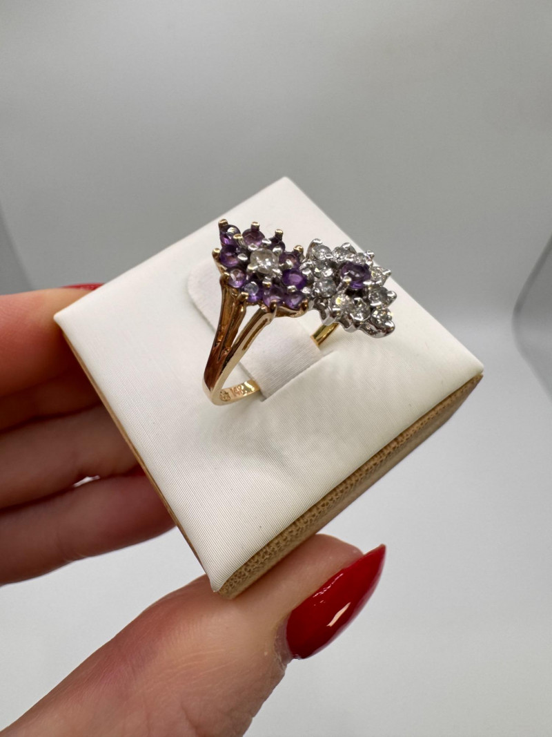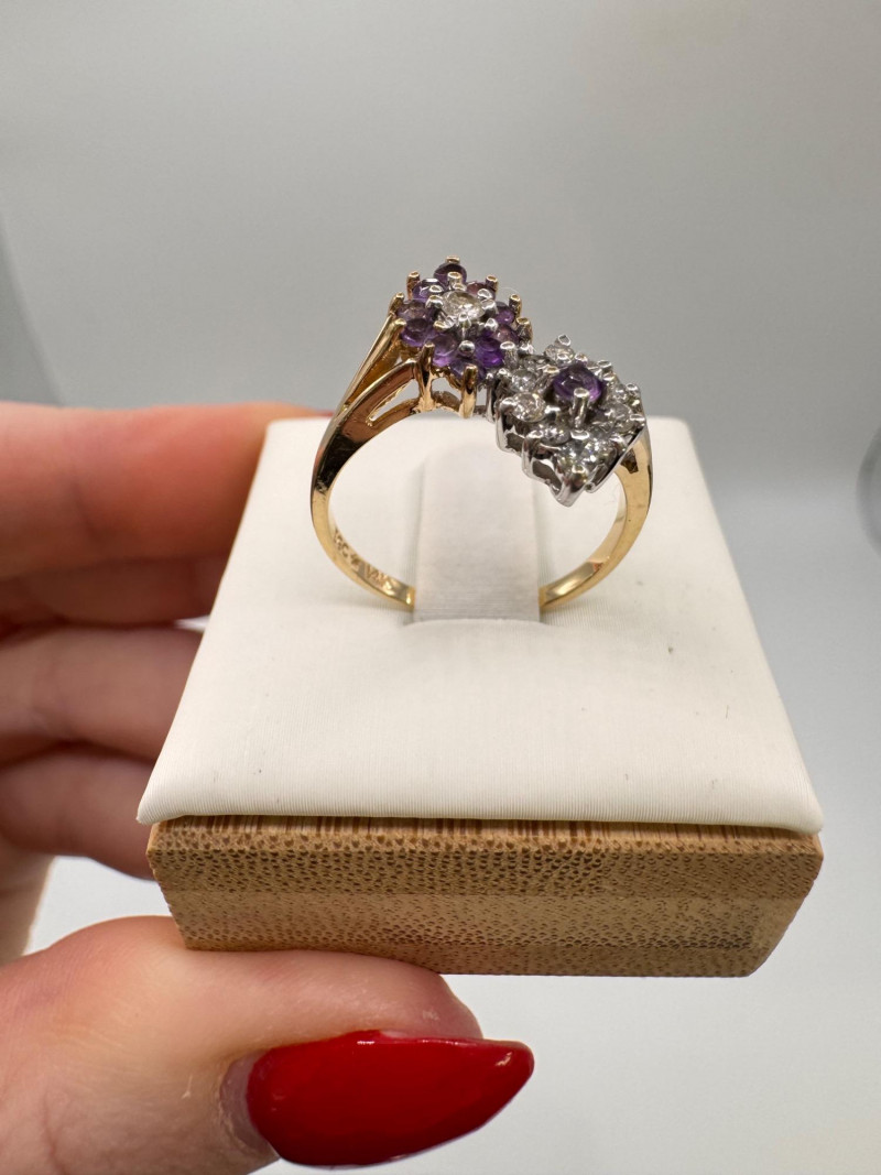 14K Gold Amethyst & Diamond Two Cluster Ring 2.49g.