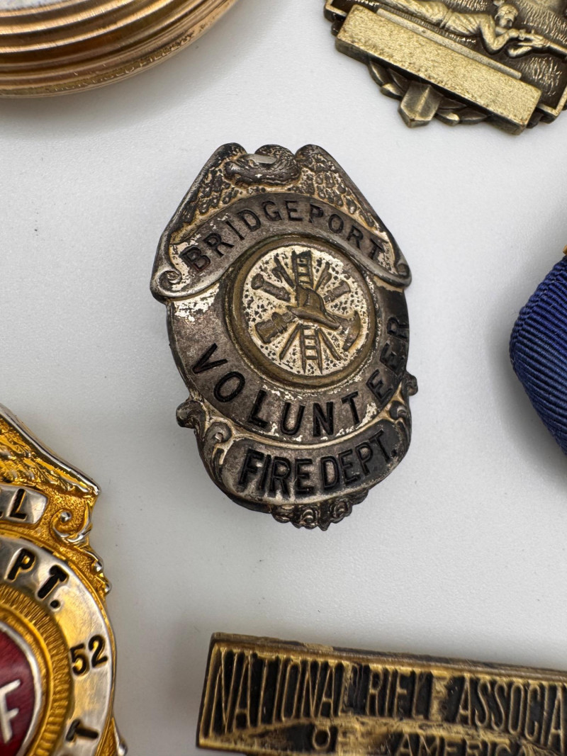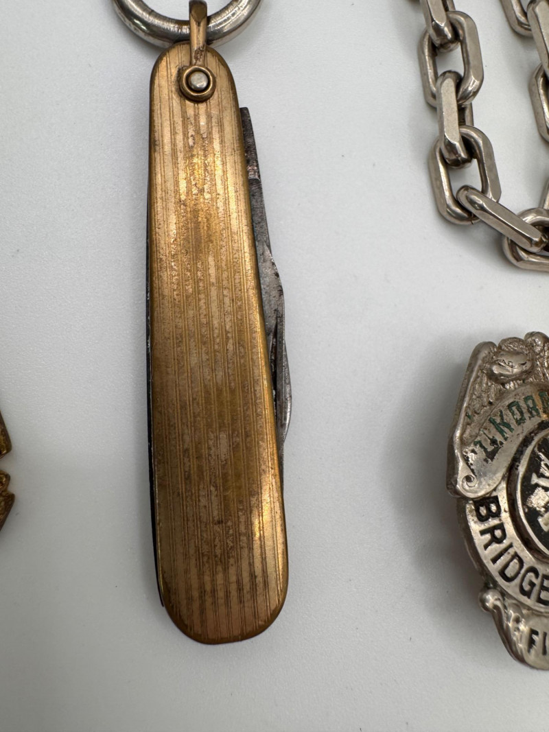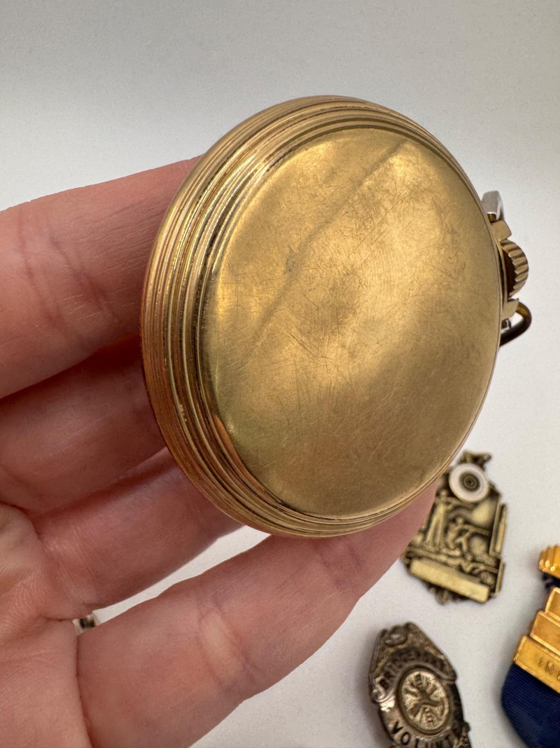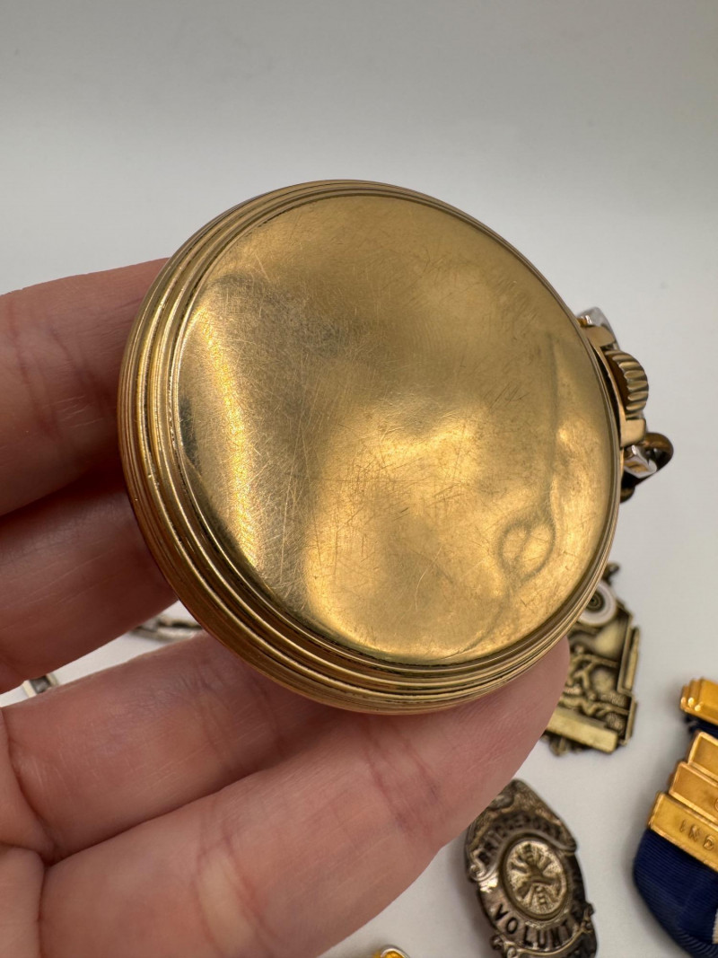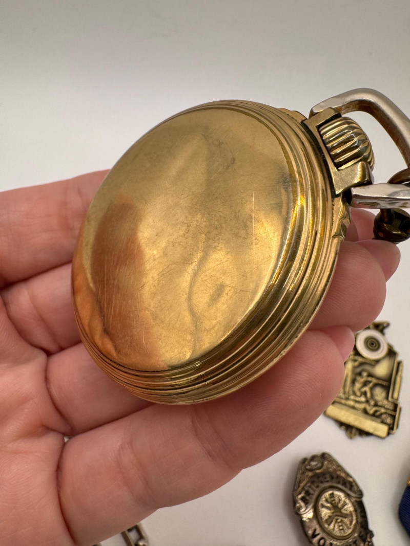 Lot # 54 - Vintage Waltham large Pocket Watch & Fraternal / Fire Dept Badges