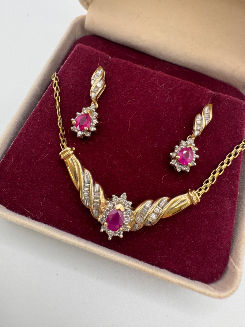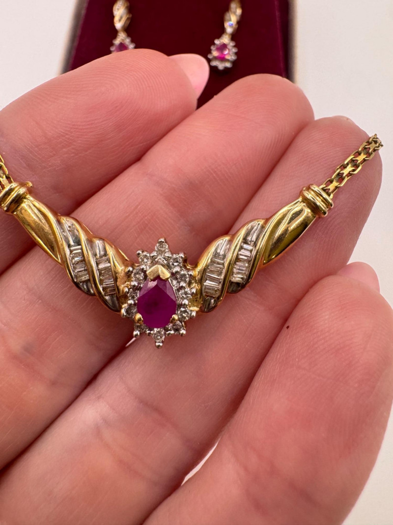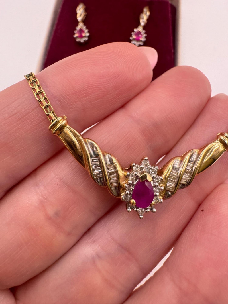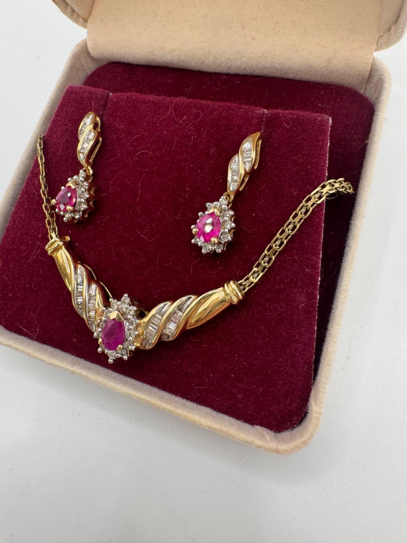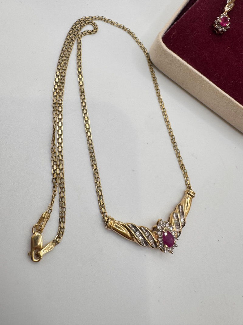 Lot # 1 - 14k Chain 10k Ruby Diamond Necklace Earring Set 8.07g