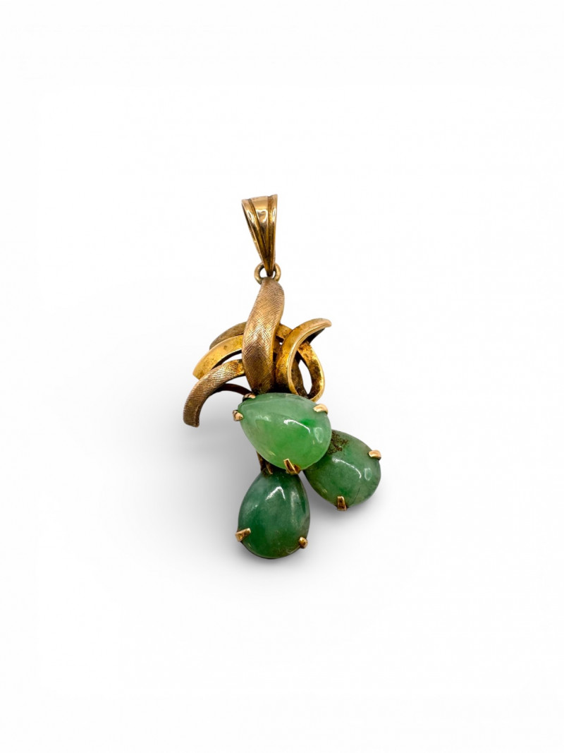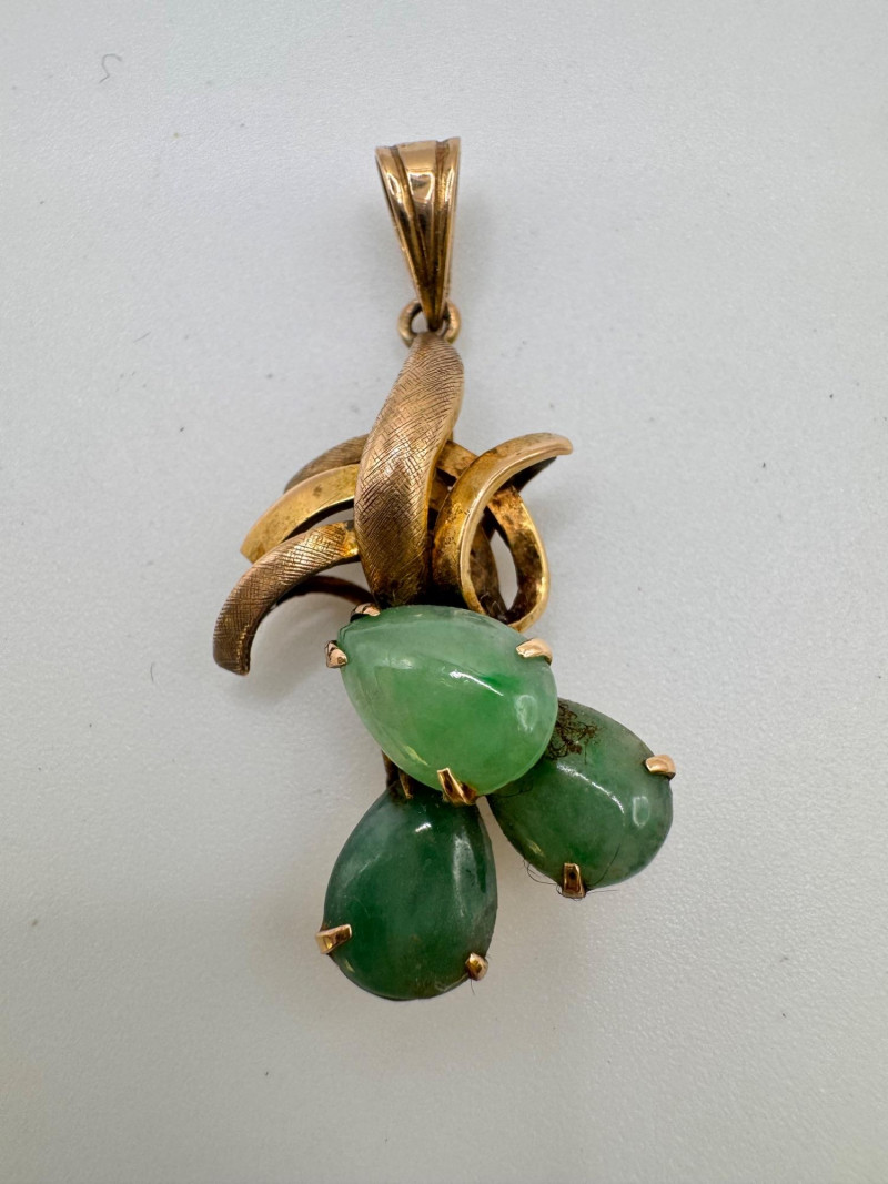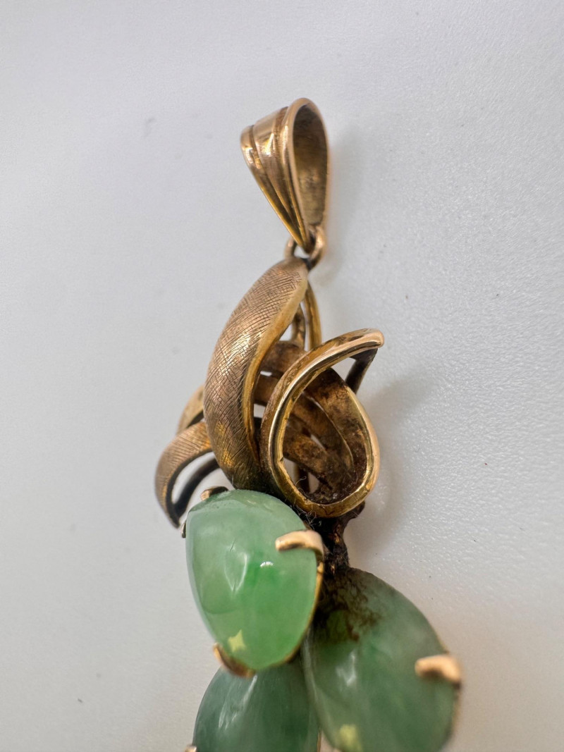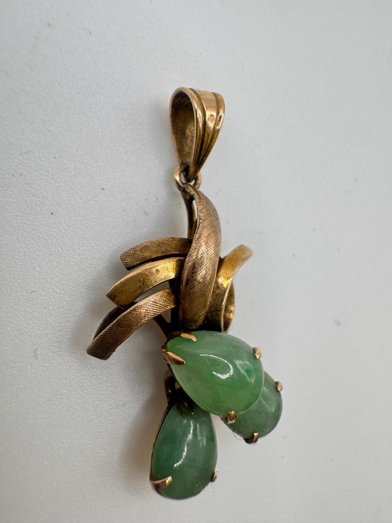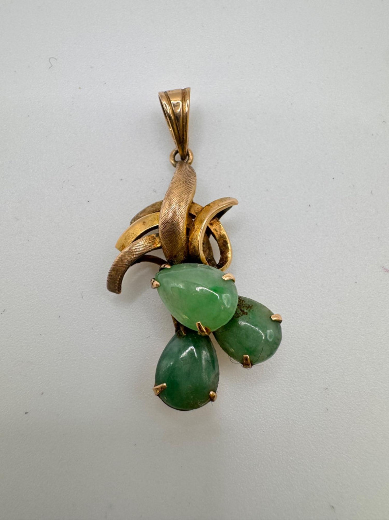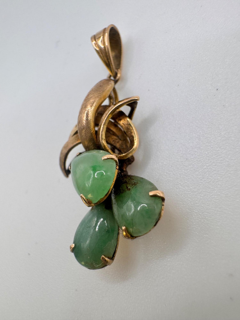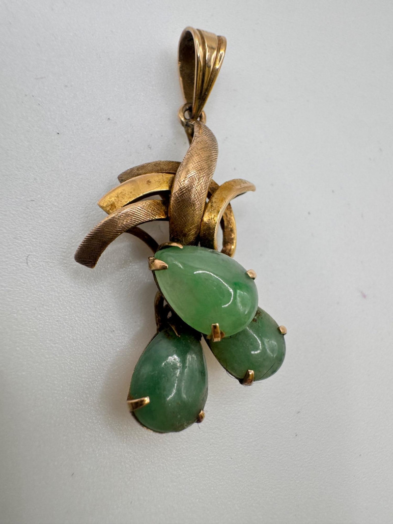 Vintage 14K Gold Carved Jade Drop Pendant 3g. Disclaimer: This item has not been tested and is sold as is with no guarantees regarding metal quality, purity, gemstone authenticity, or composition. By placing a bid, you acknowledge and agree to these terms. No refunds will be issued based on these factors.