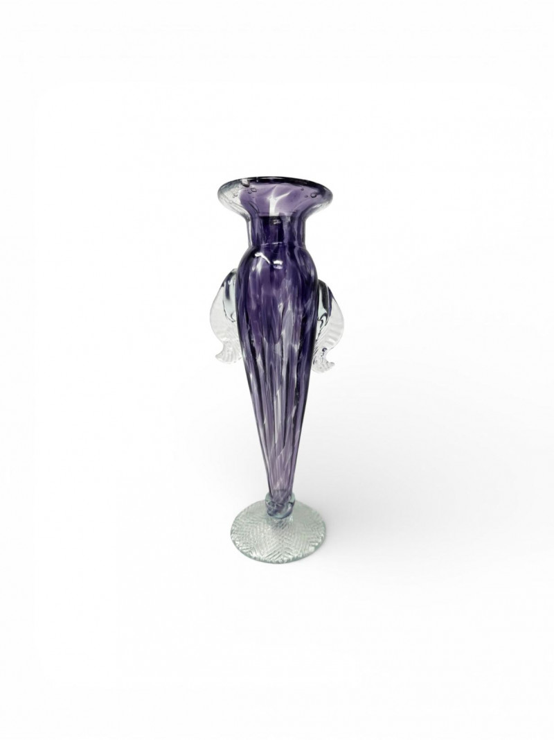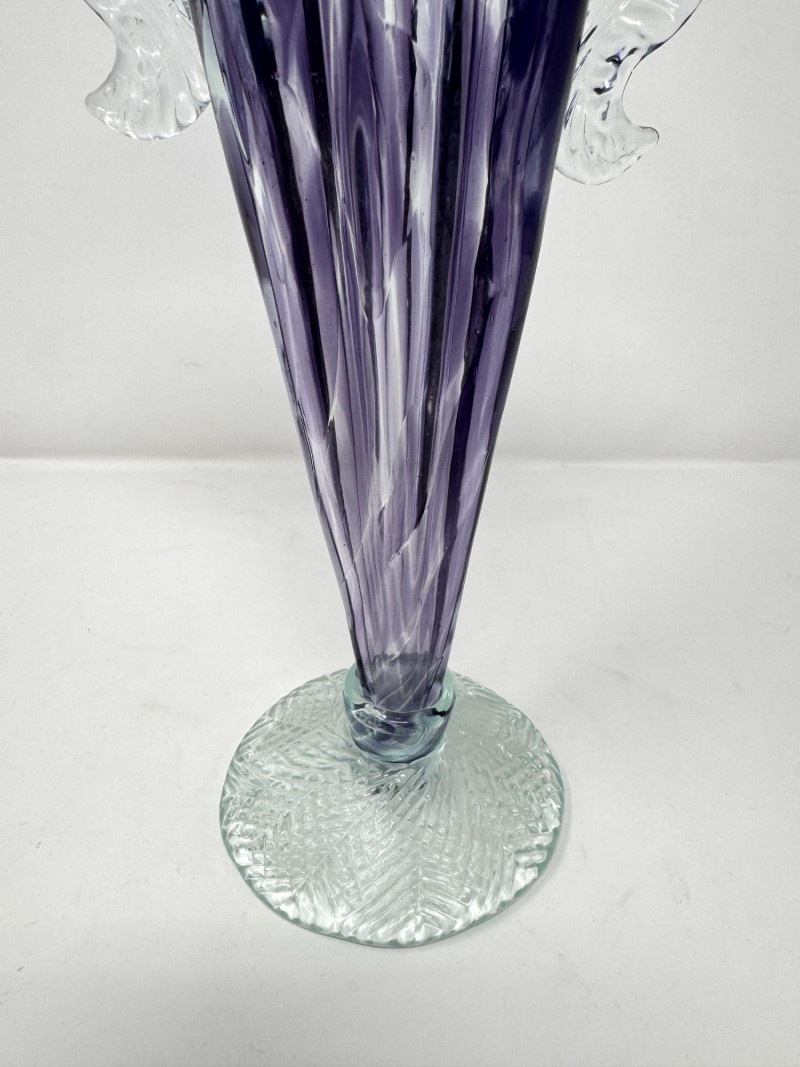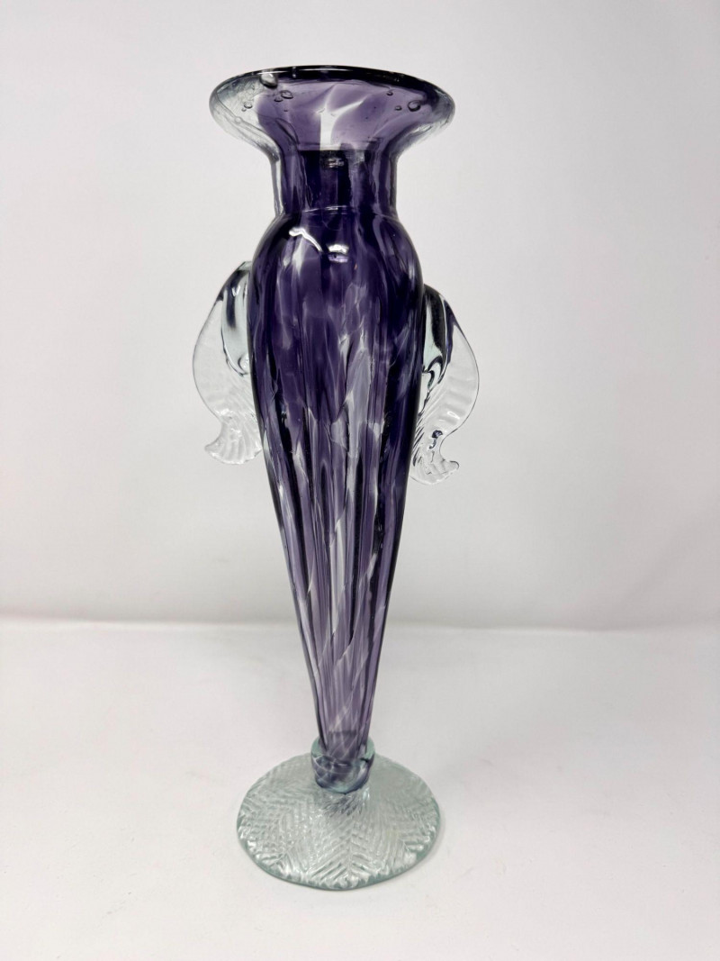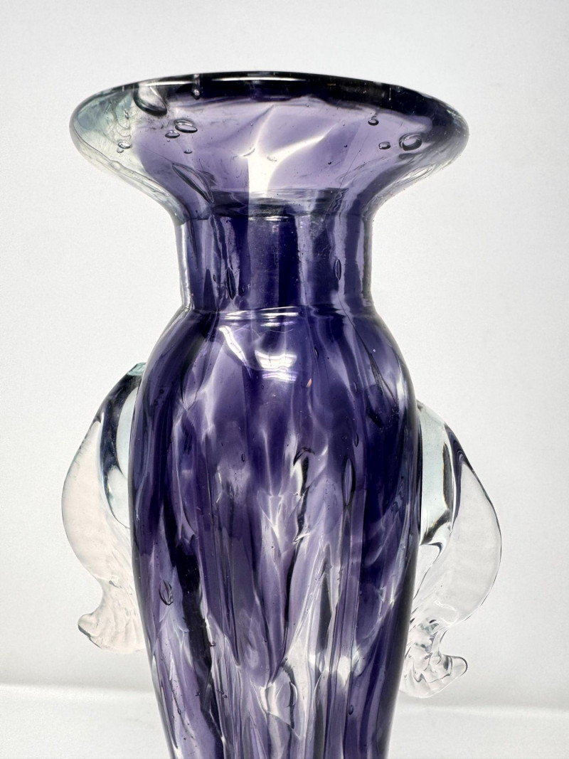Lot # 26 - Blown Art Glass Vase Purple Swirl w/ Clear Applied Handles