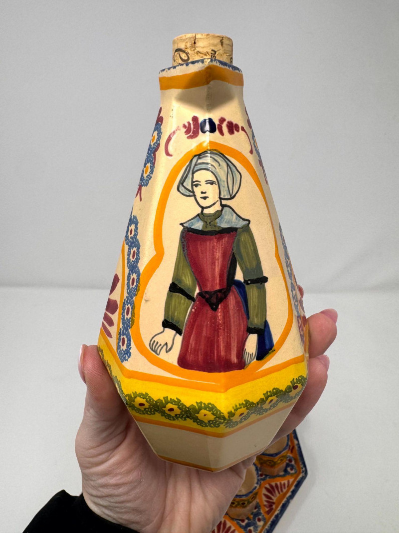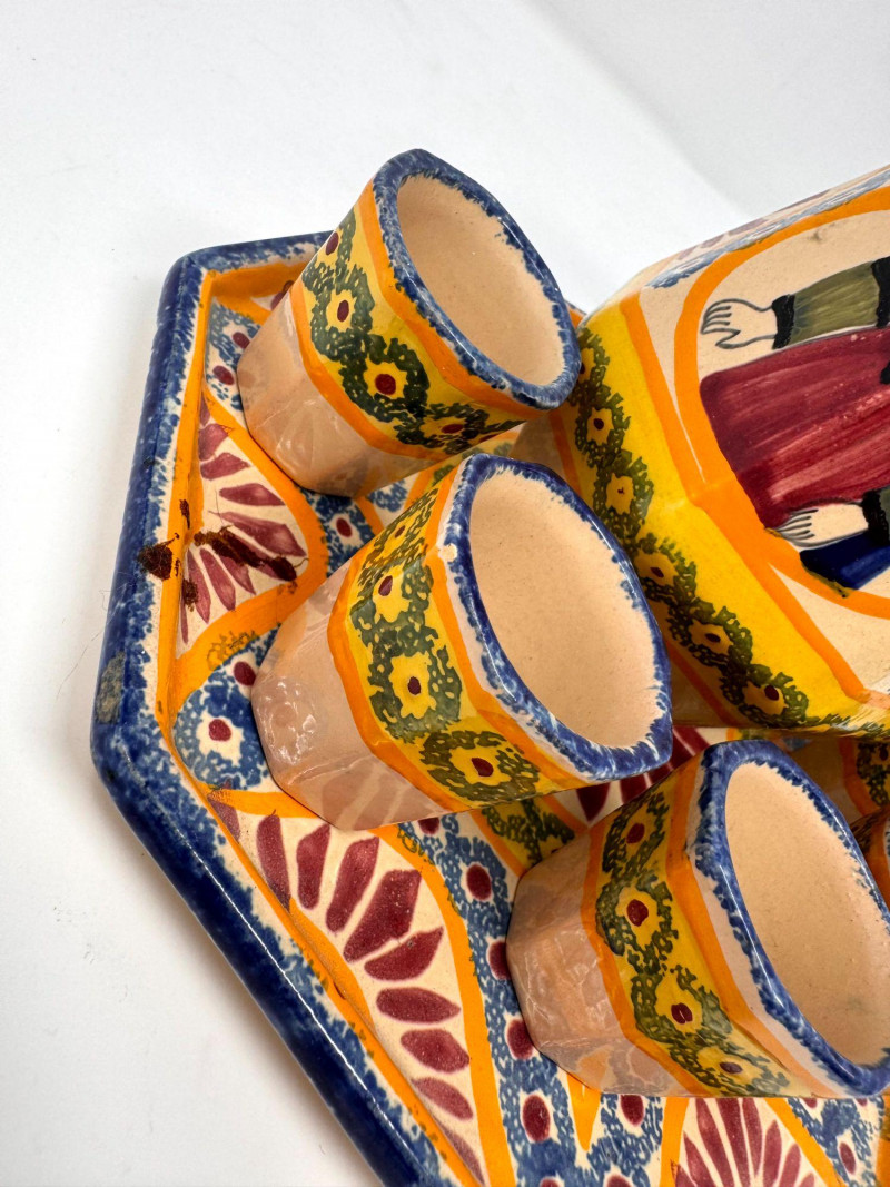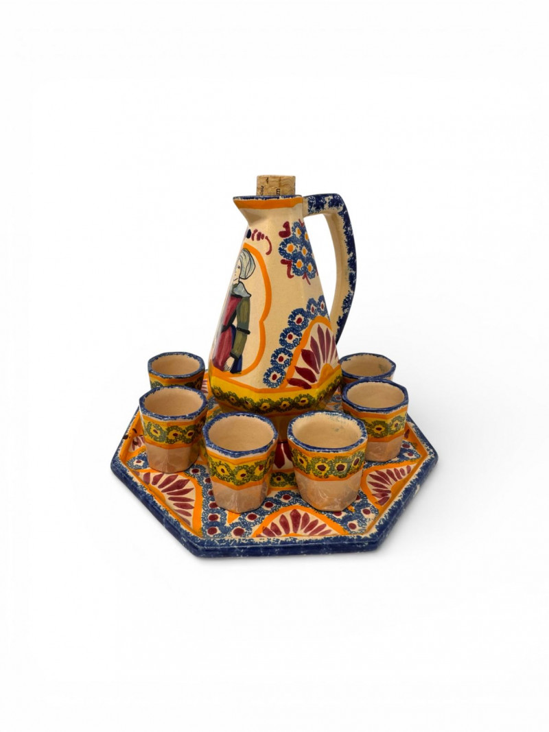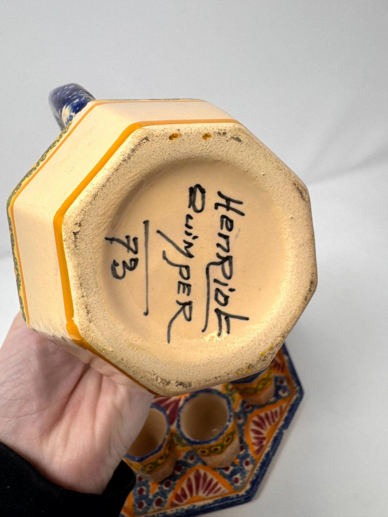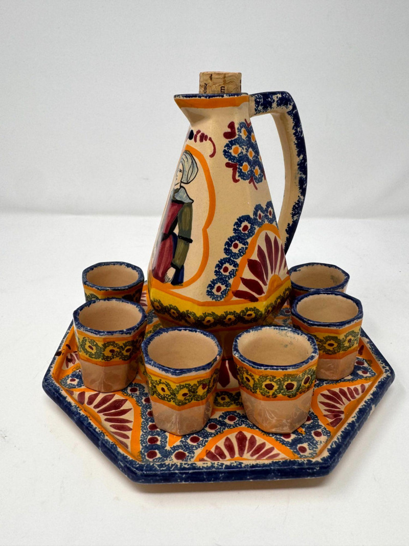 Henriot Quimper French Pottery Liqueur Set – Bottle, 6 Cups & Tray. Includes hand-painted bottle with cork, six matching cups, and serving tray.