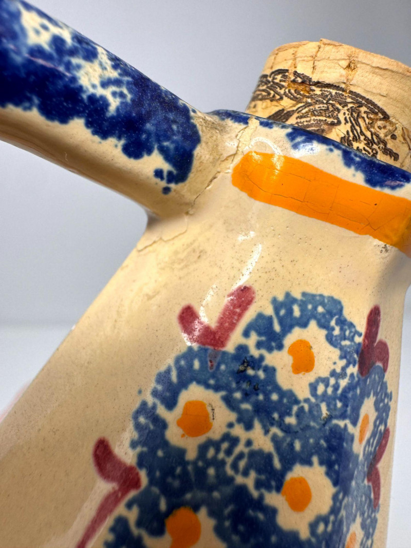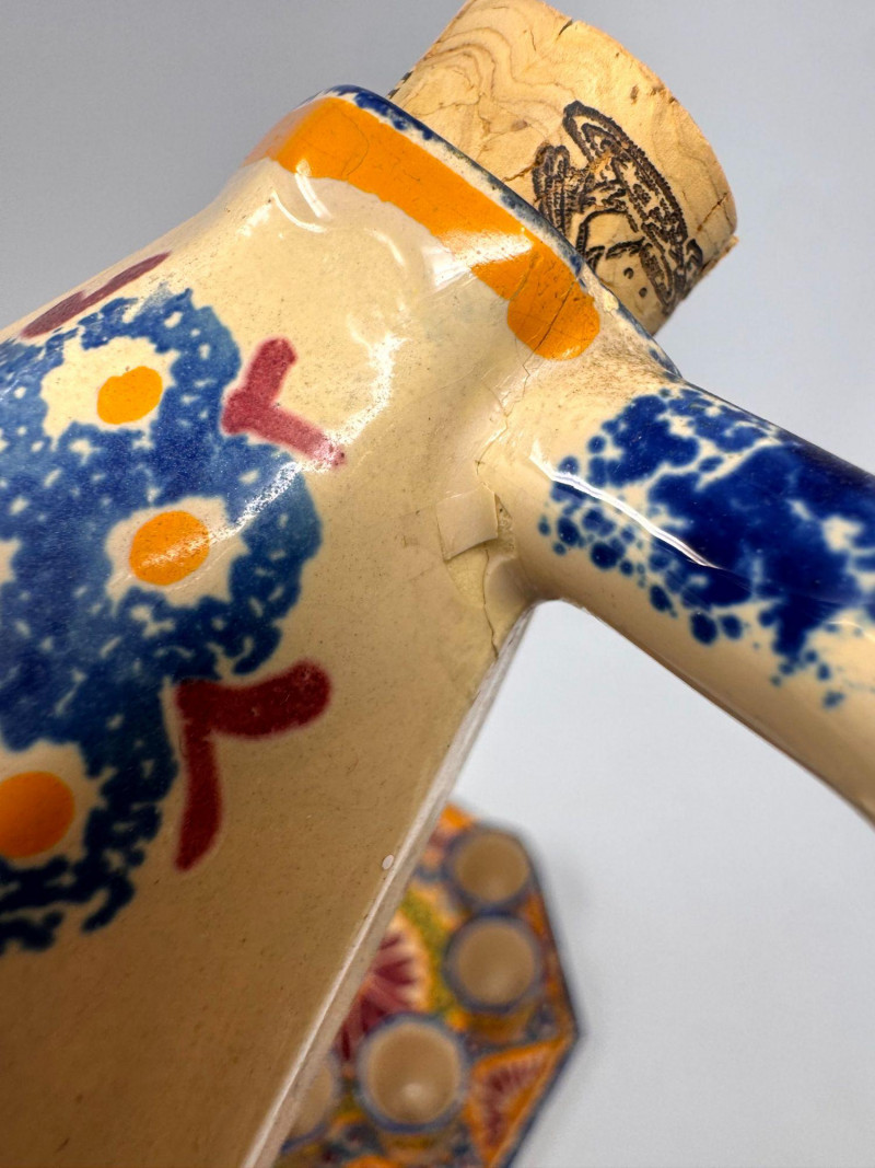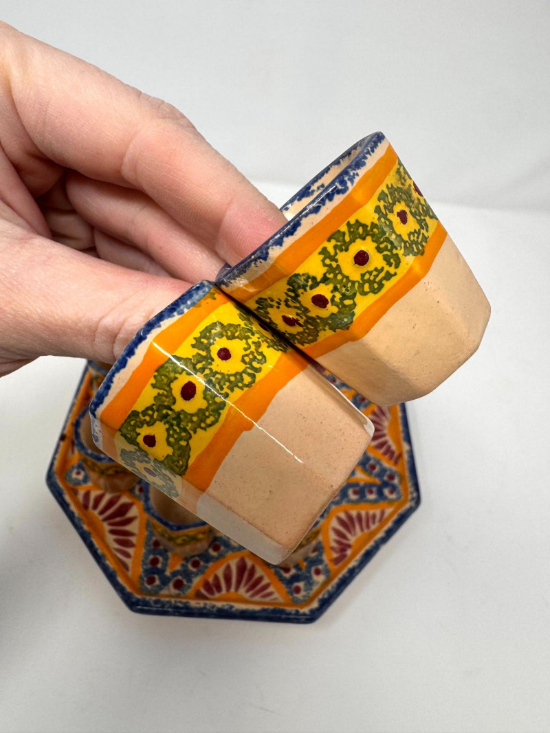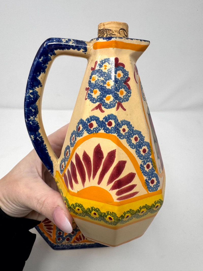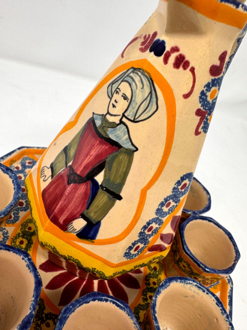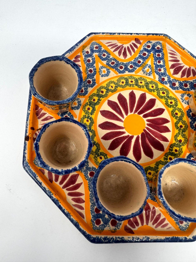 Henriot Quimper French Pottery Liqueur Set – Bottle, 6 Cups & Tray. Includes hand-painted bottle with cork, six matching cups, and serving tray.