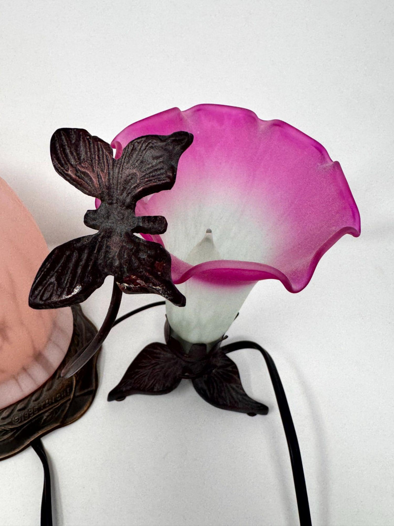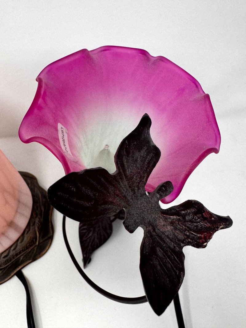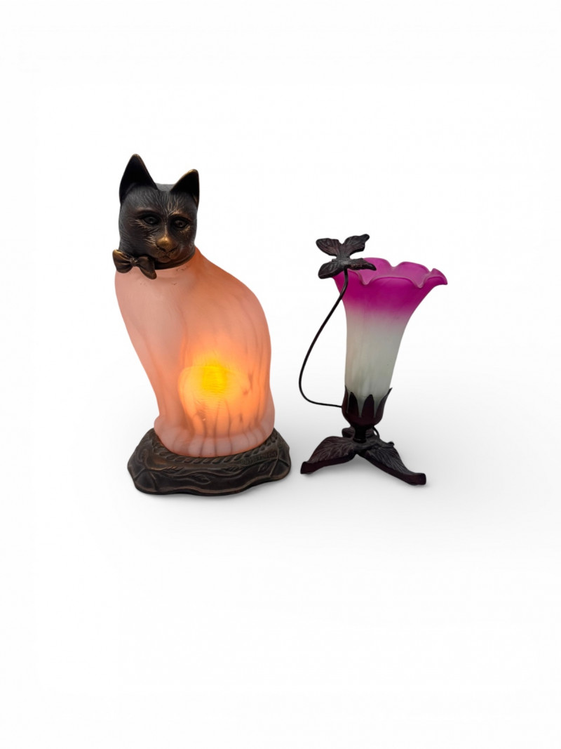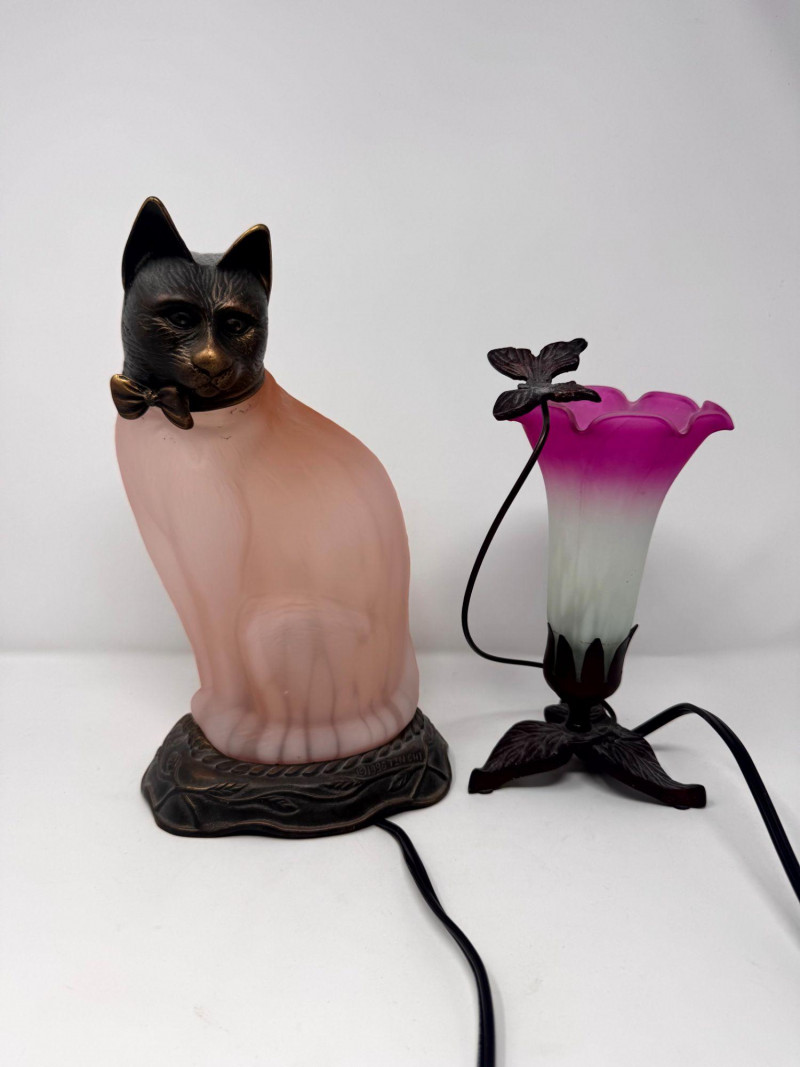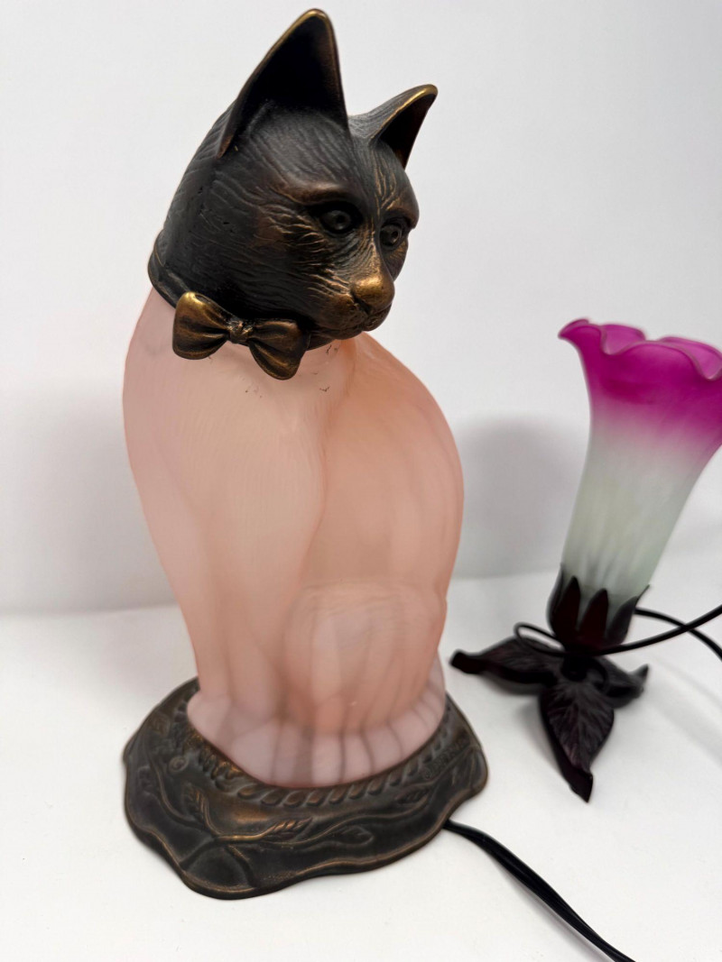 Pink Frosted Glass Cat Lamp Bronze Head Base & Lily Shade Lamp.