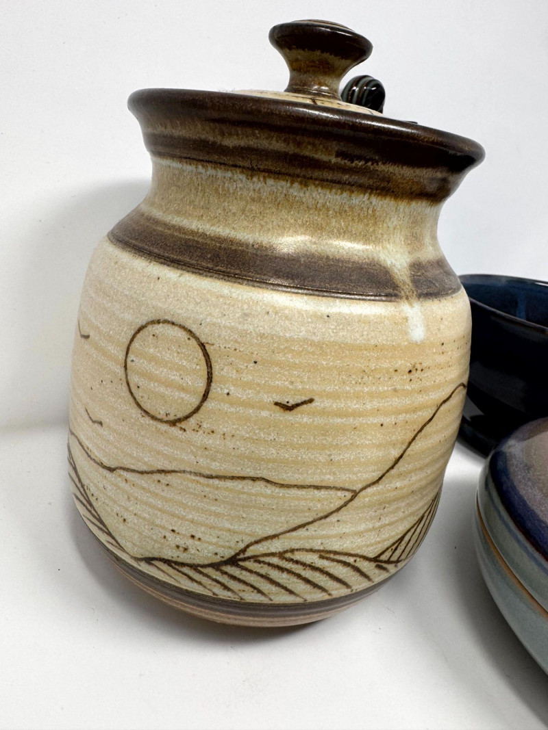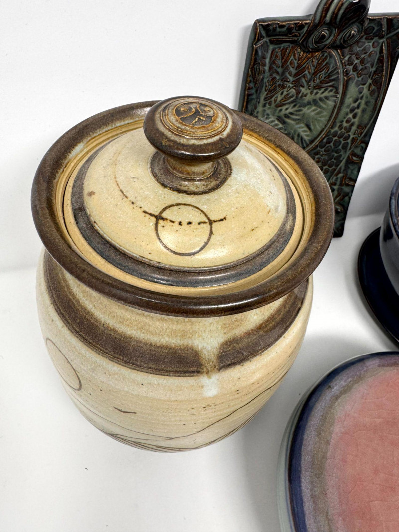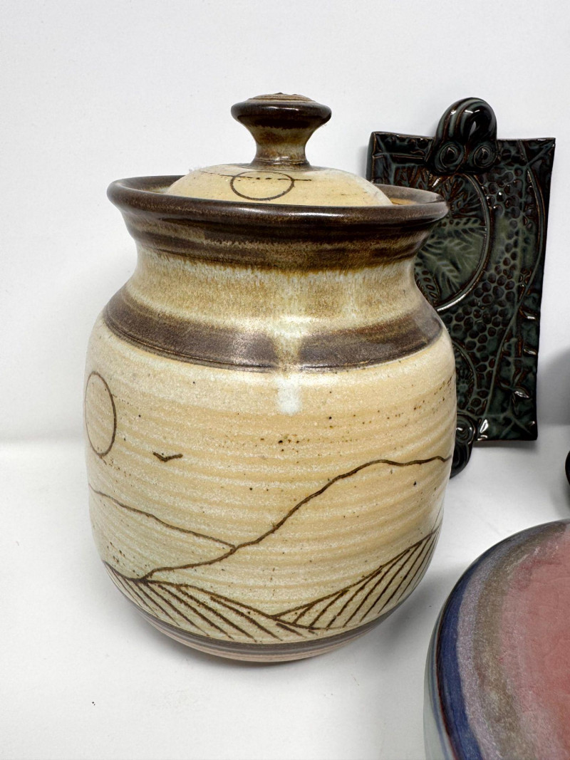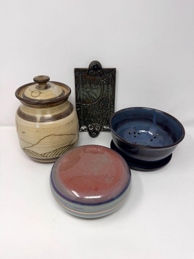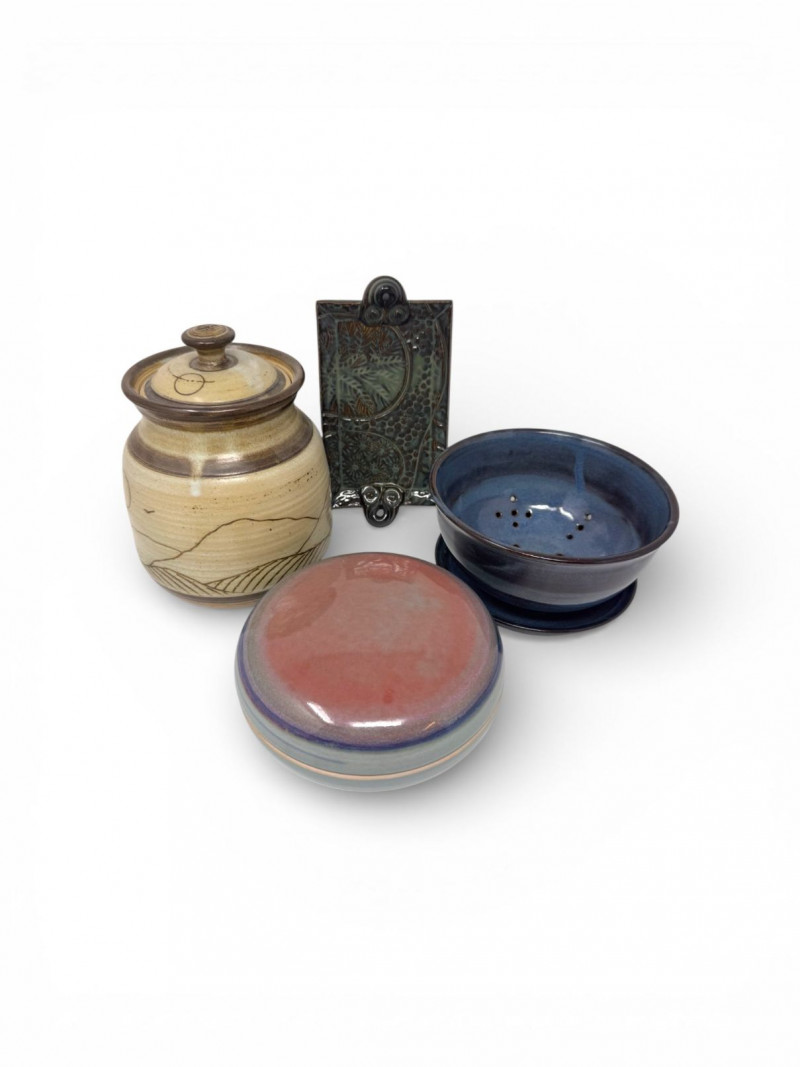 Lot # 106 - Studio Pottery – Barbara Childs Jar, Lidded Dish, Colander Bowl & Tile