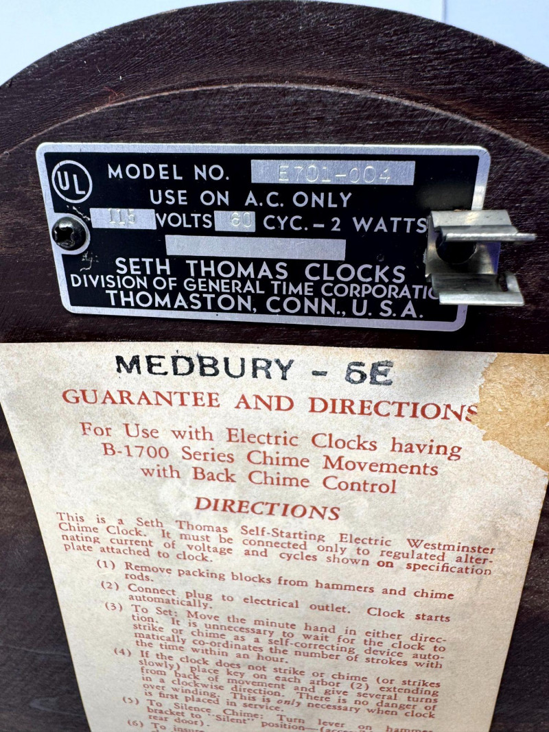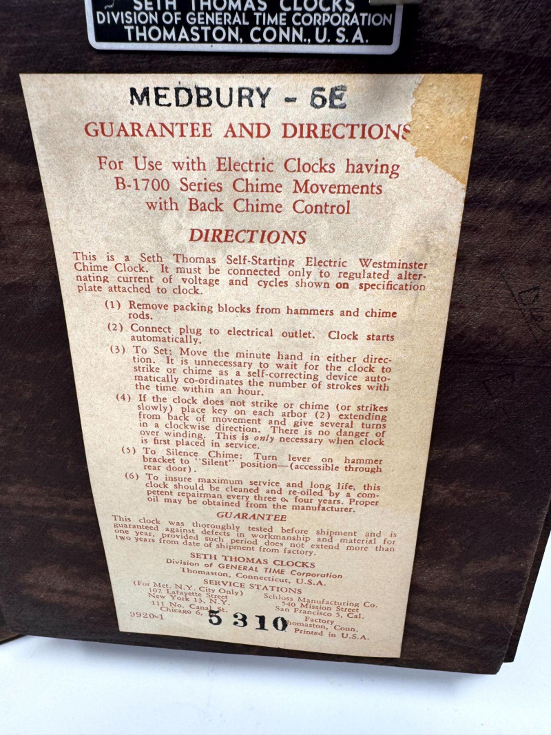 1950s Seth Thomas Medbury Electric Mantel Clock w/ Westminster Chime.