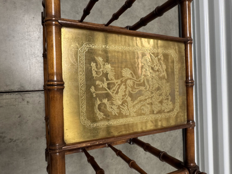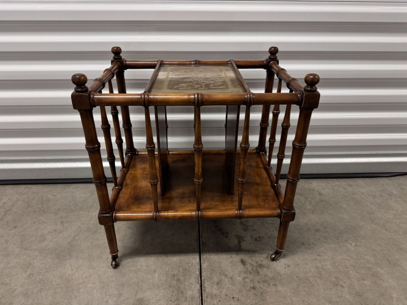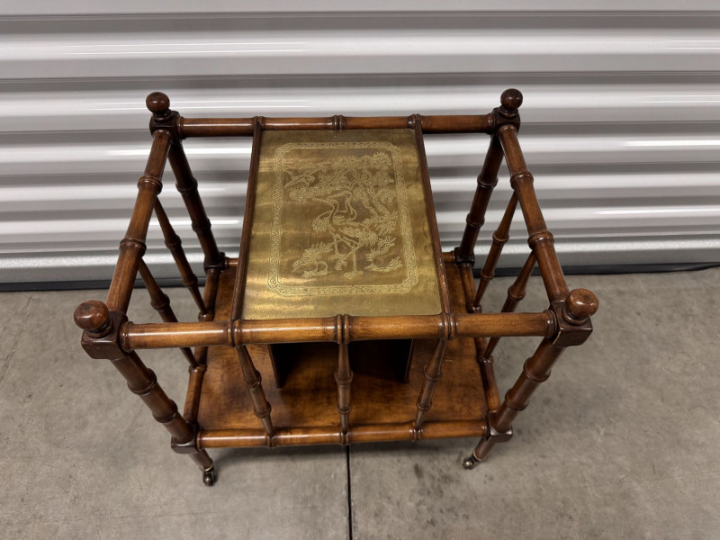 Vintage Faux Bamboo Wood Magazine Rack Table w/ Brass Panel.