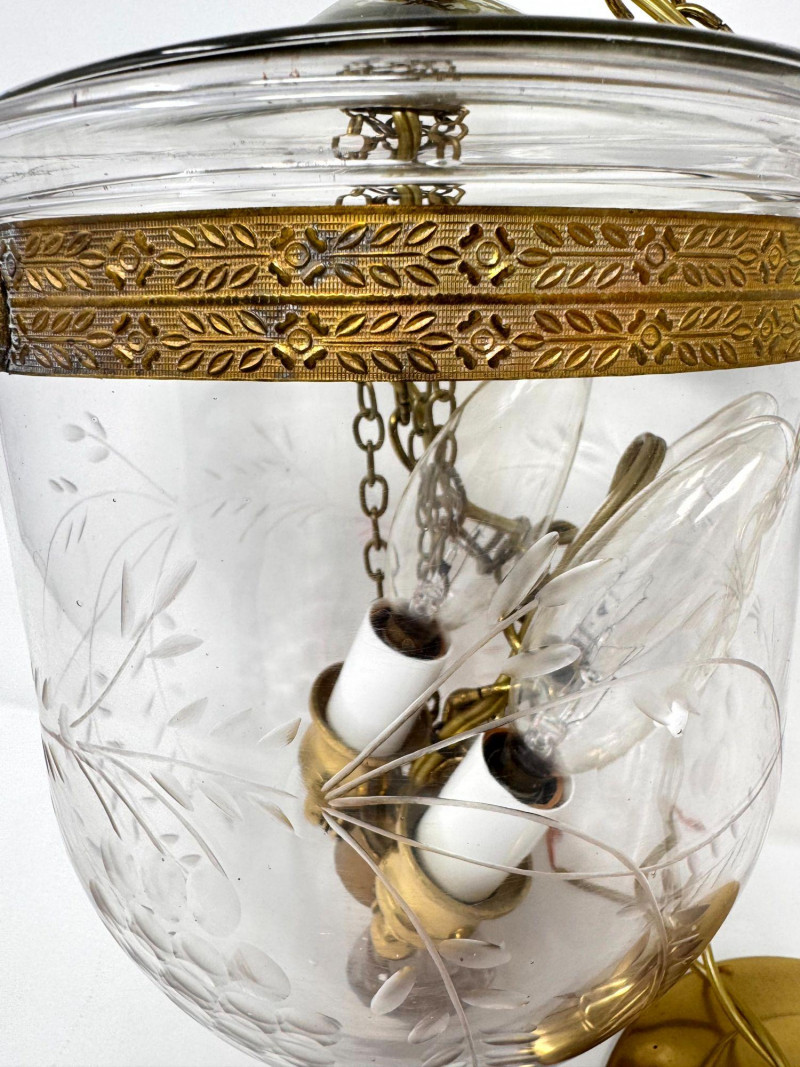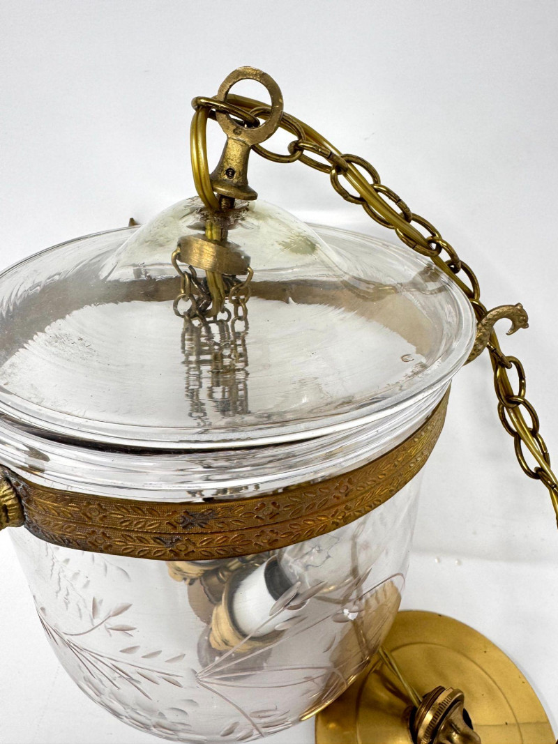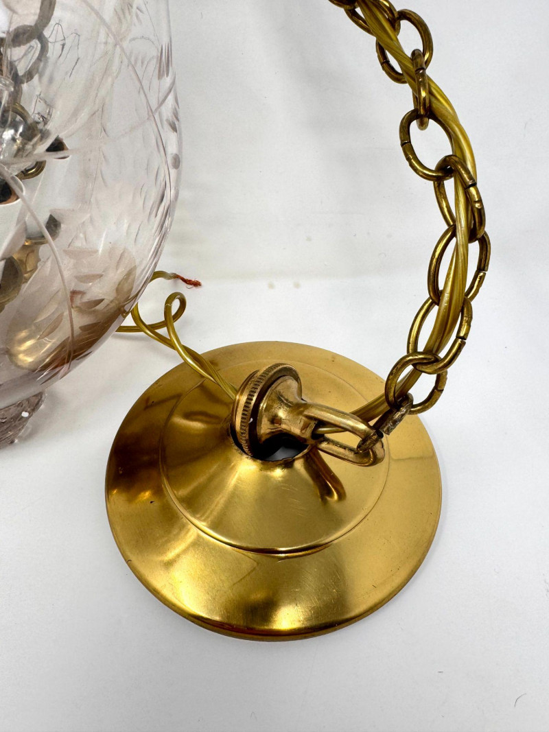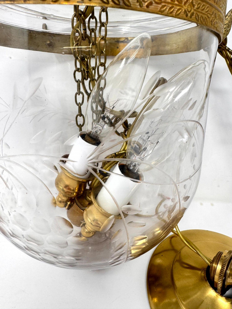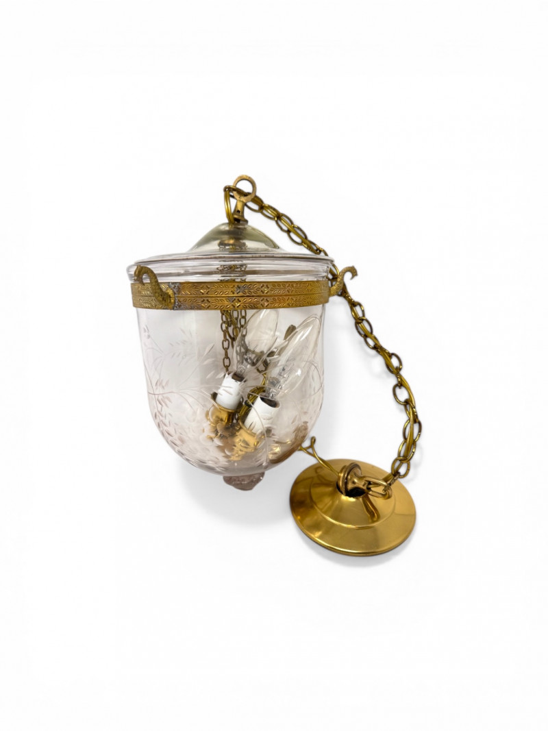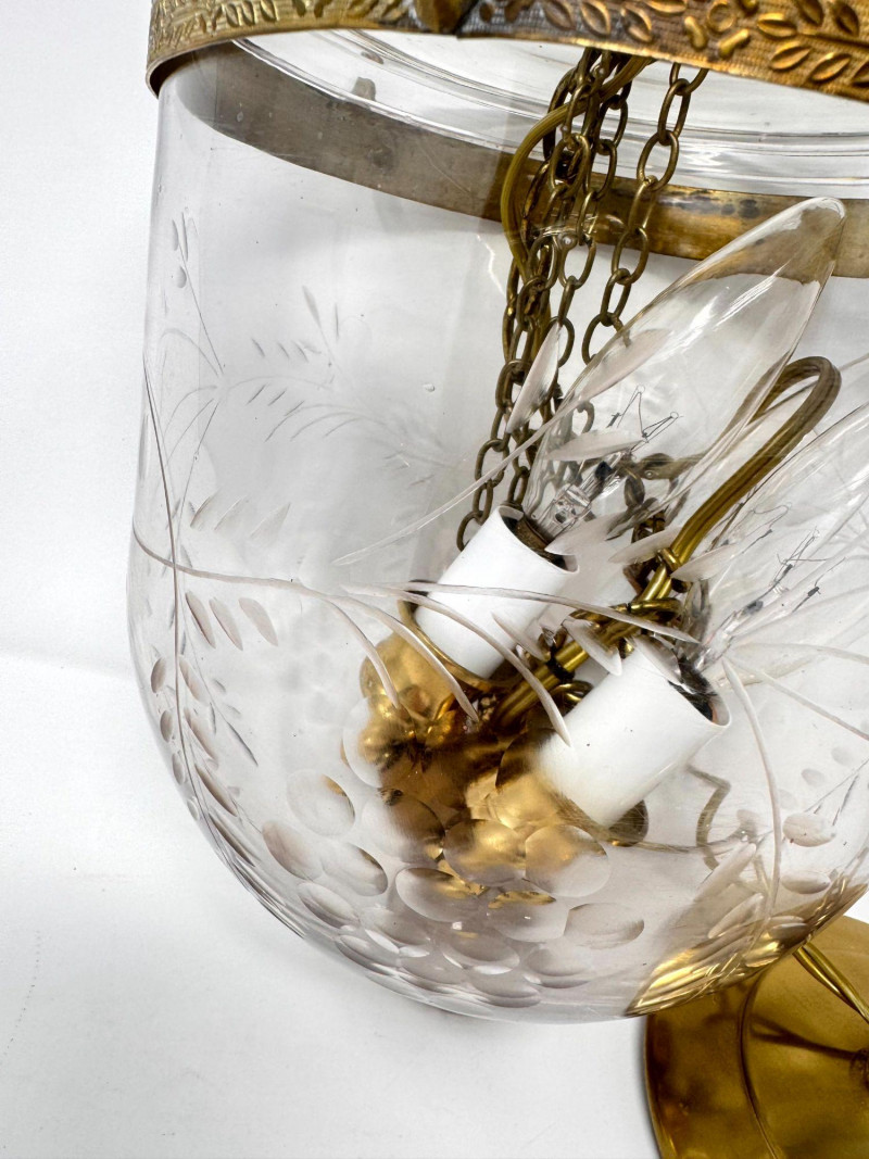 Lot # 37 - Vintage Style Bell Jar Hanging Light w/ Brass Details & Etched Glass