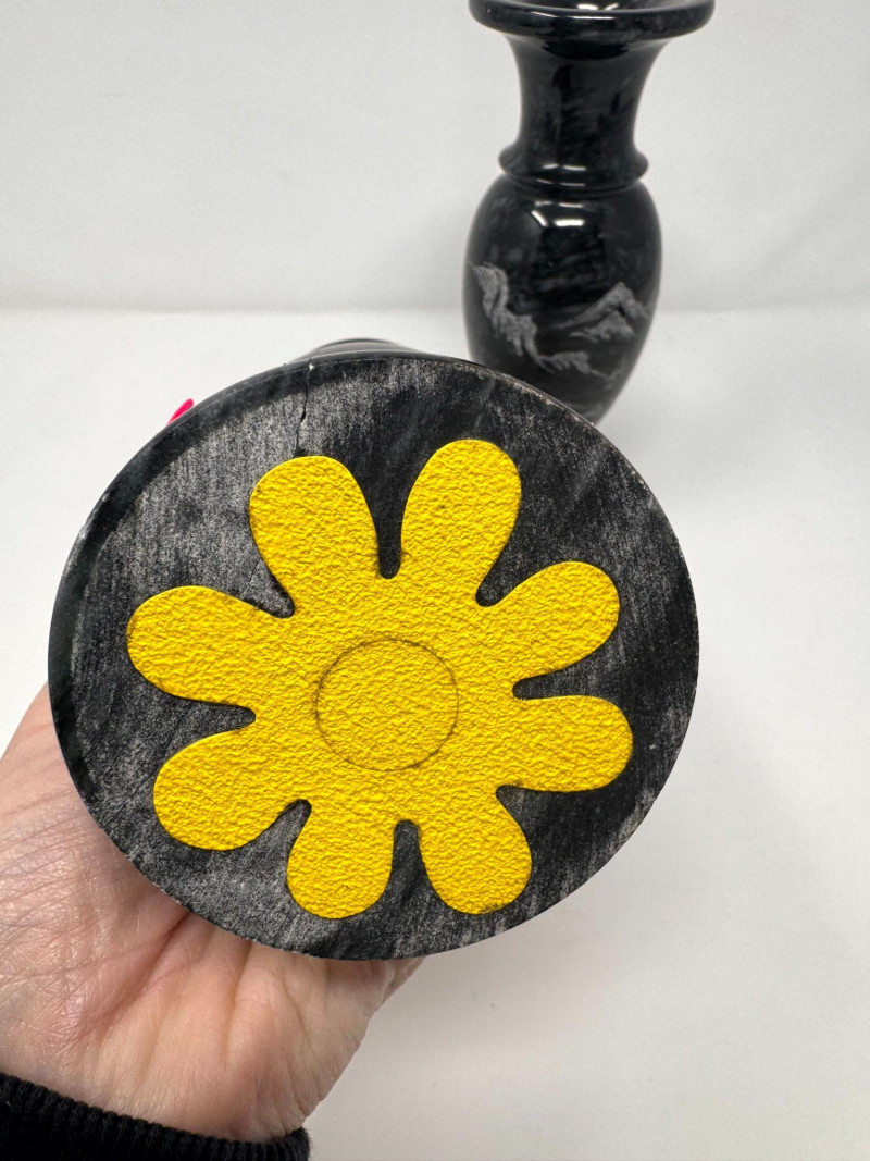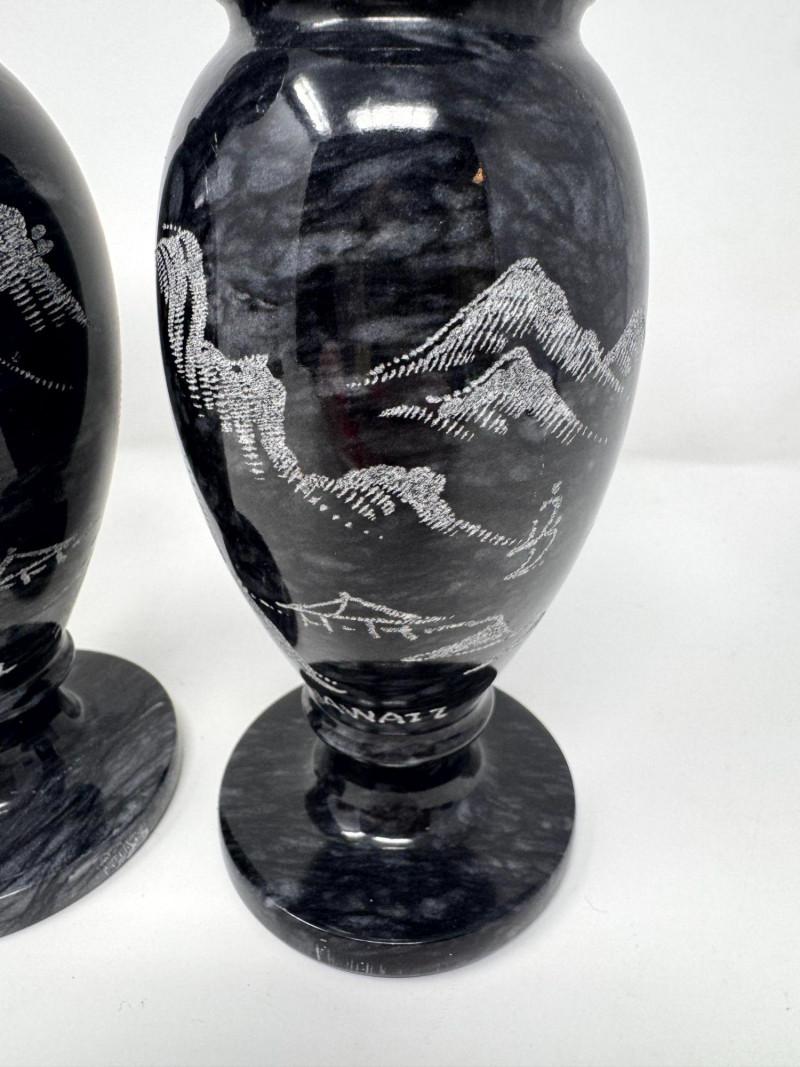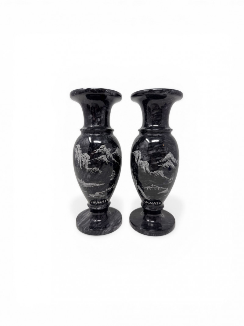Black Stone Vase Pair w/ Etched Hawaii Landscape Scene.