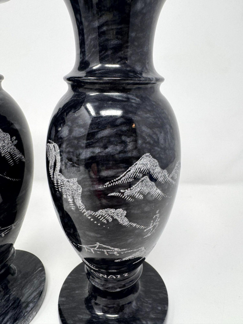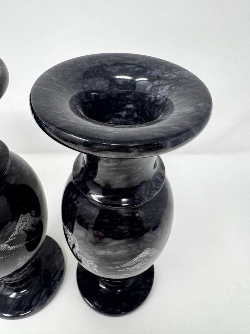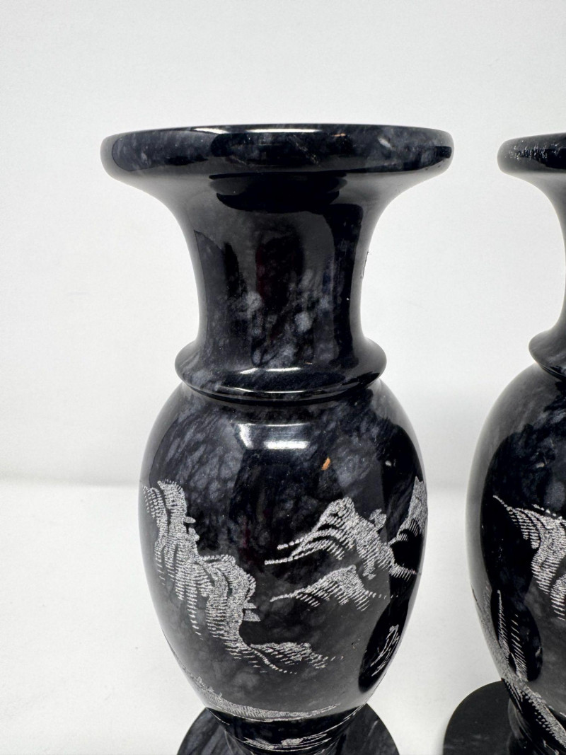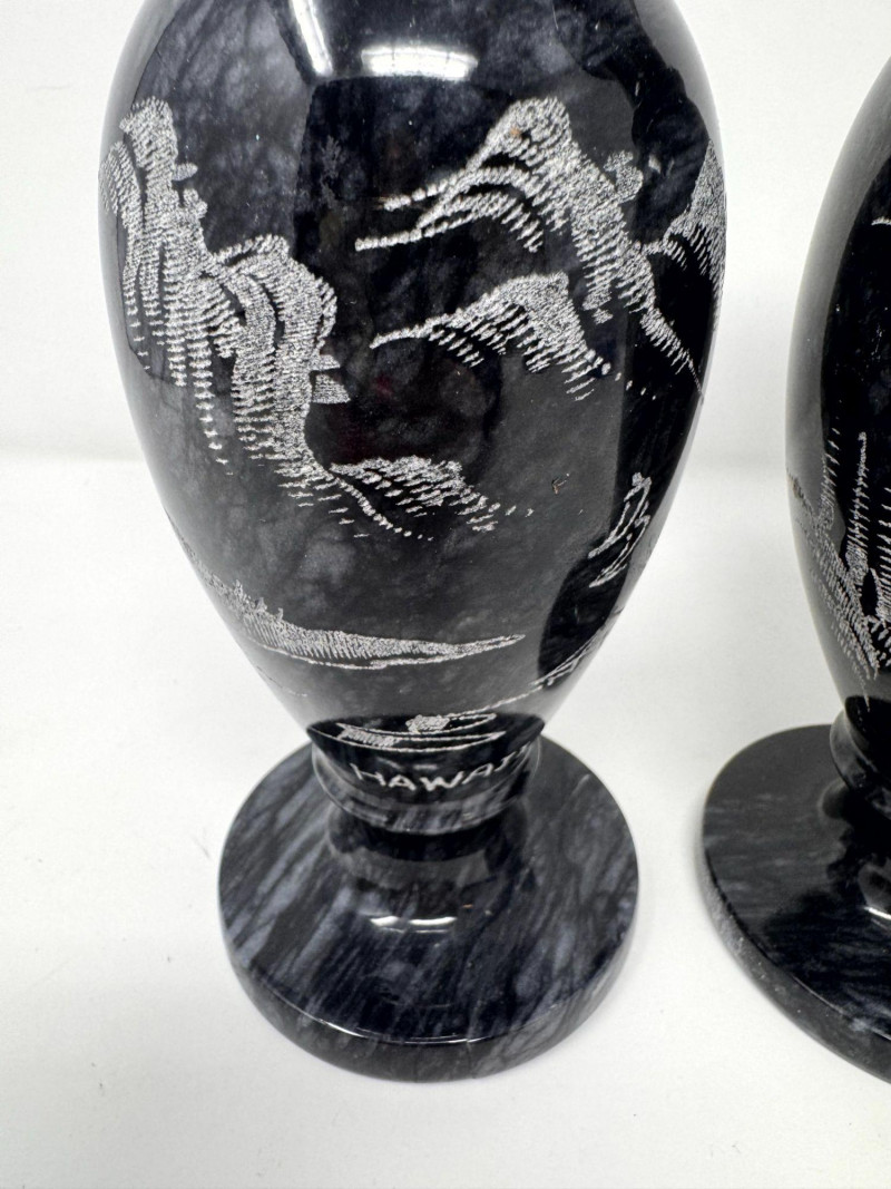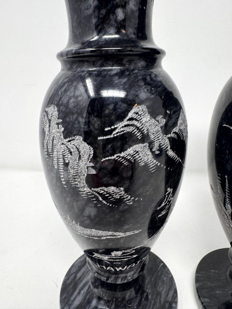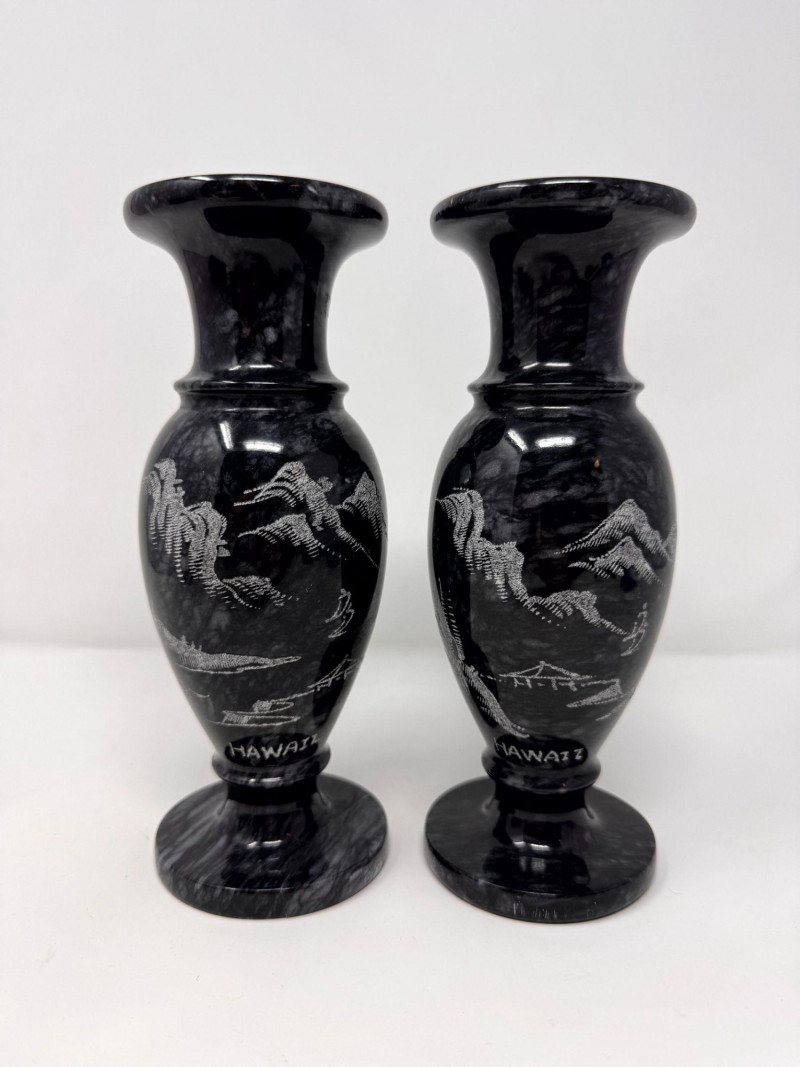 Lot # 50 - Black Stone Vase Pair w/ Etched Hawaii Landscape Scene