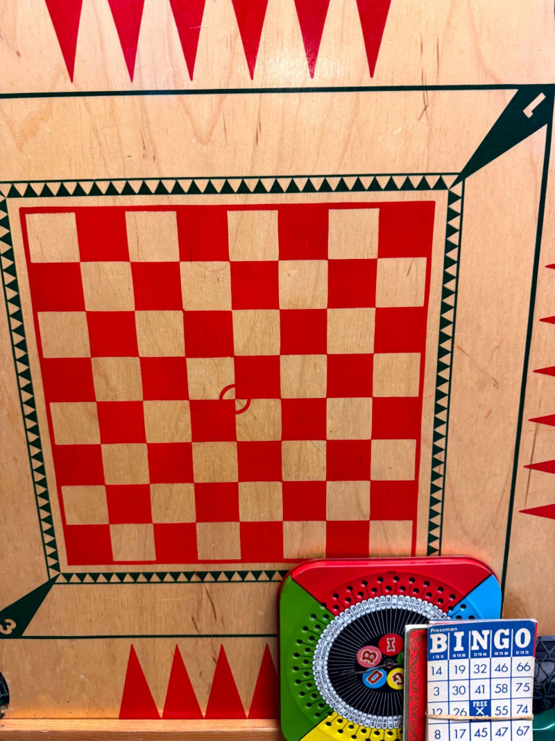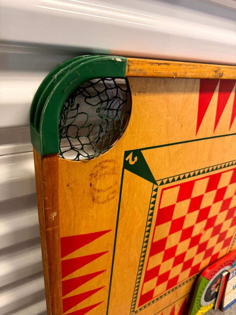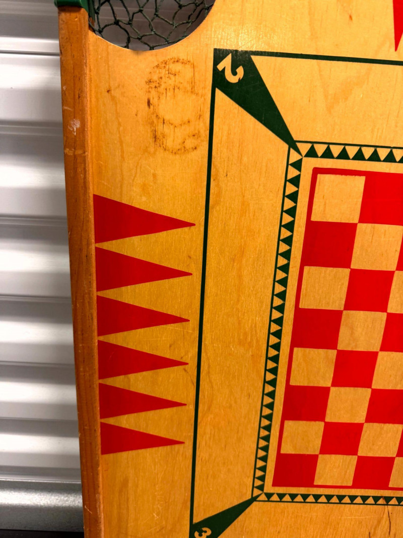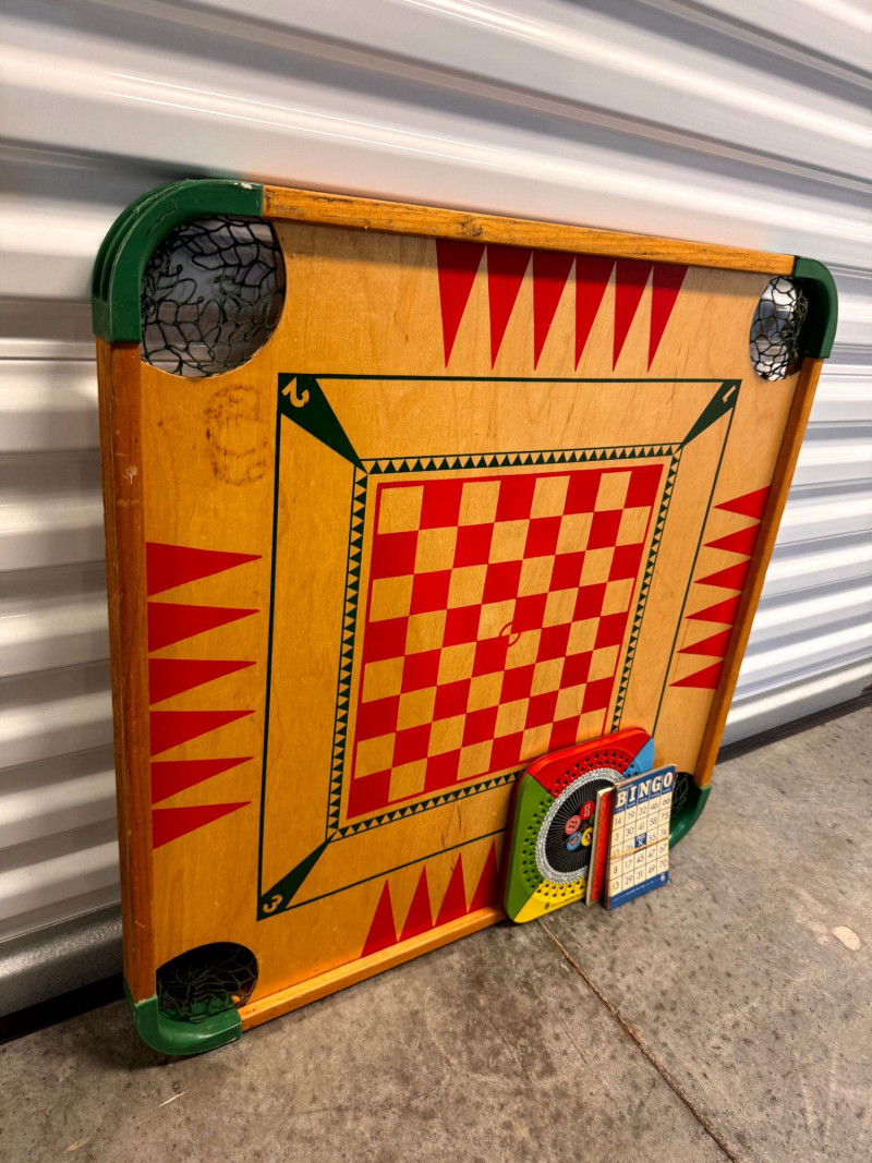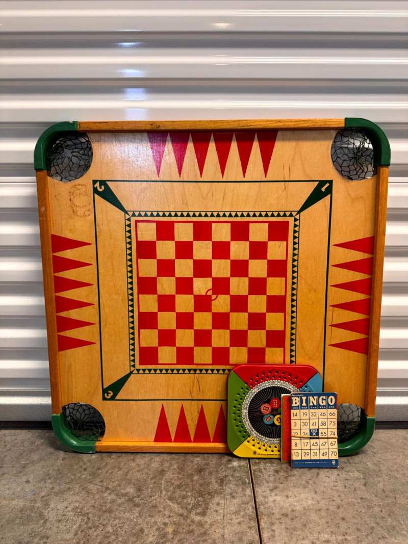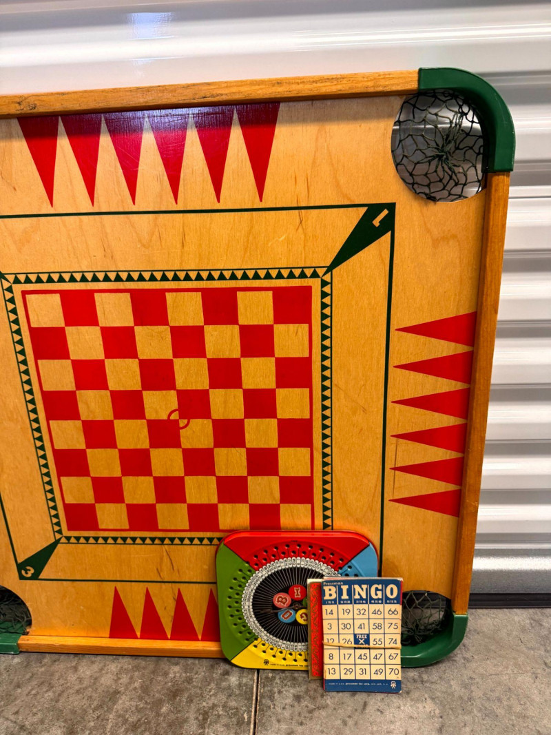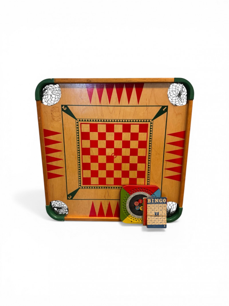 Vintage Wooden Game Board Checker + Bingo Spinner & Cards.