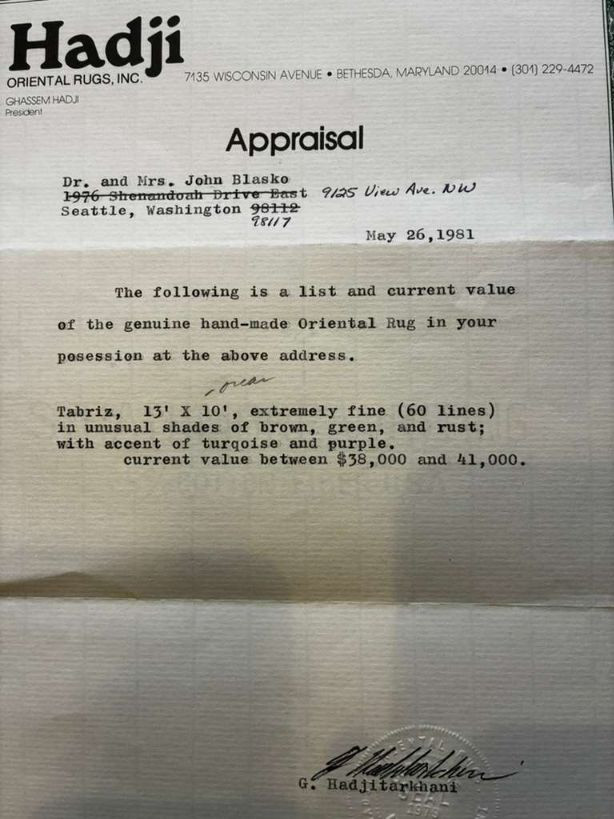 Large Hand Knotted Persian Tabriz Rug 13’ x 10’, ~ $38K–$41K Appraisal.Appraisal Note: