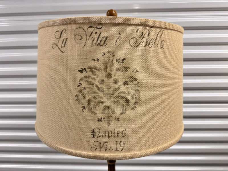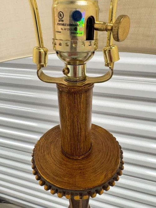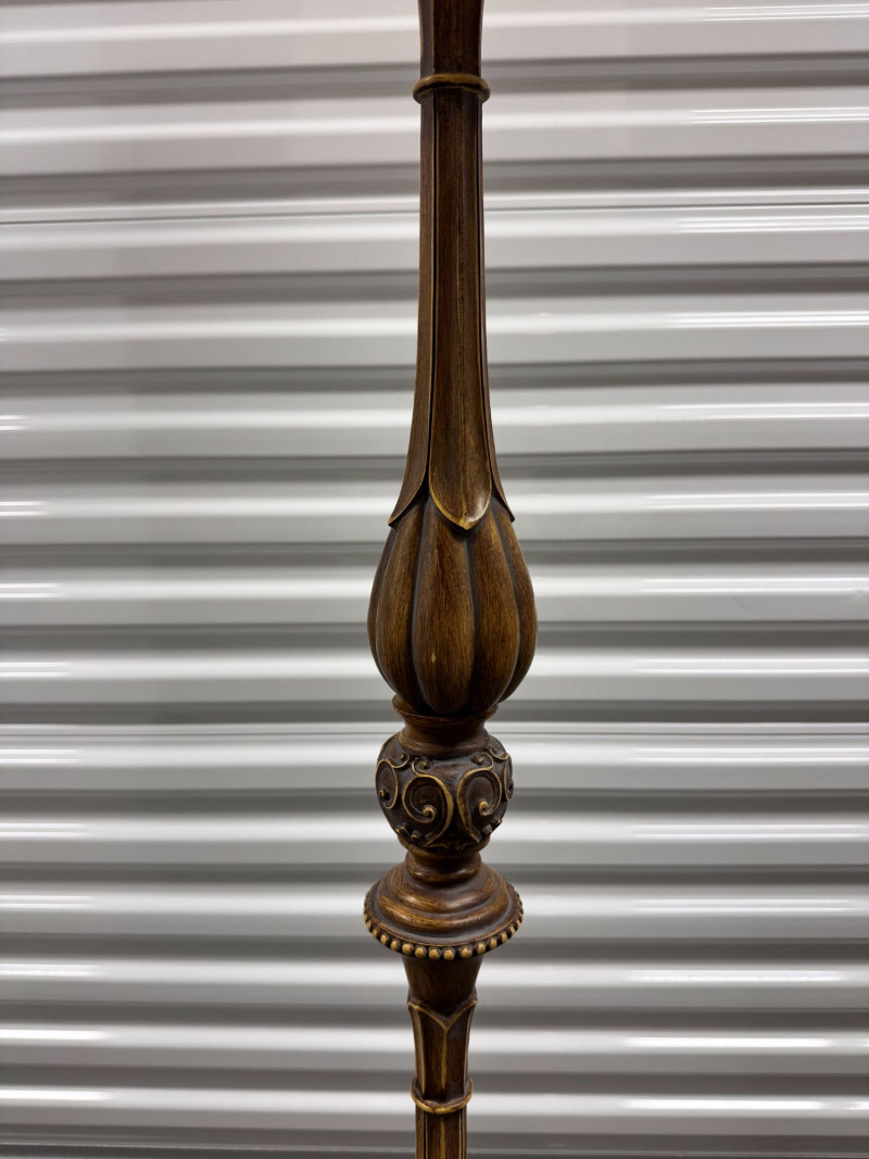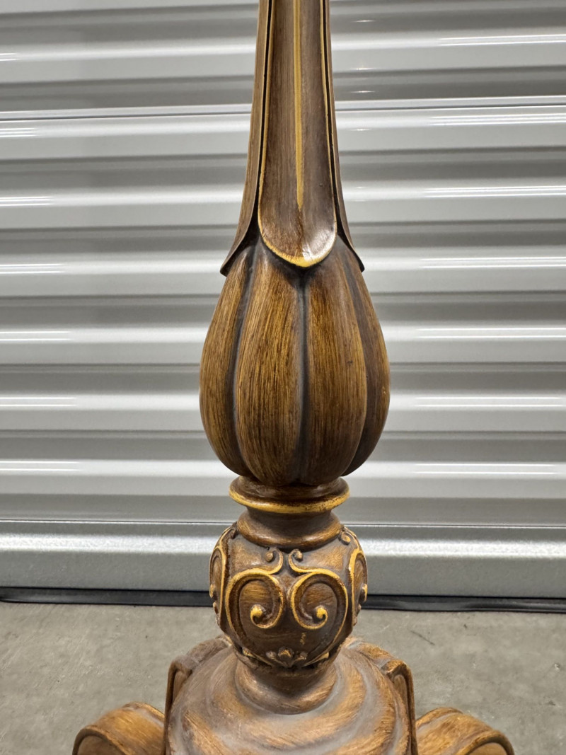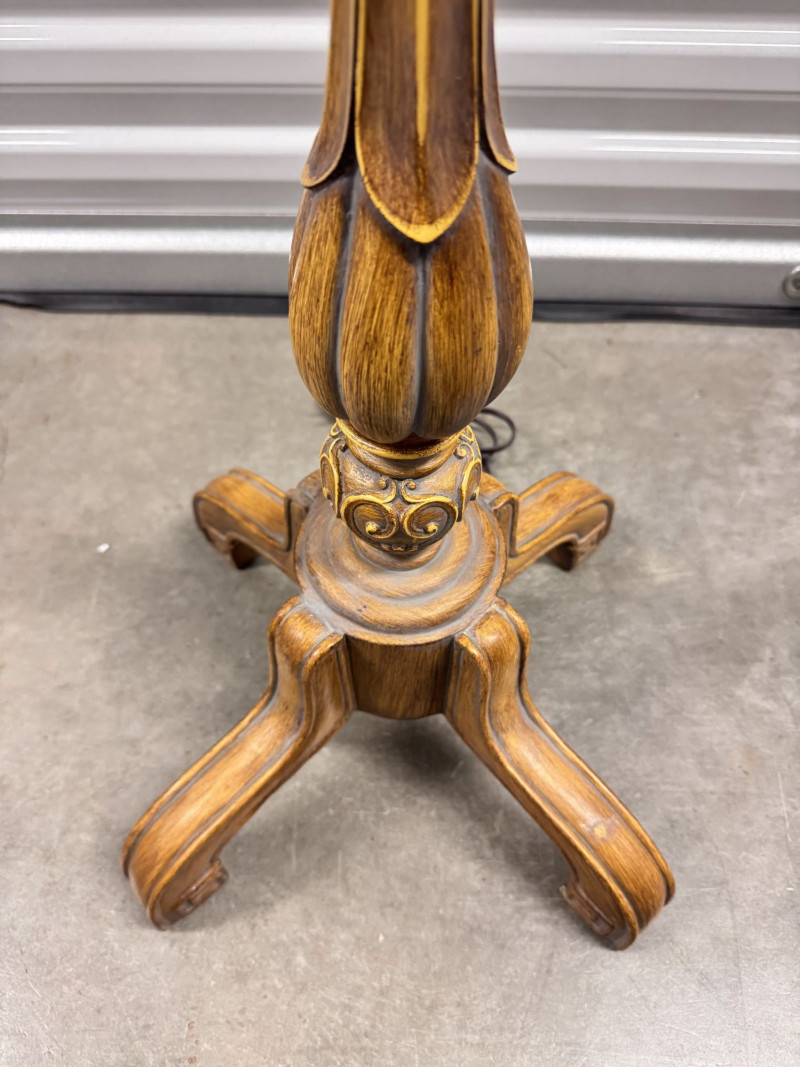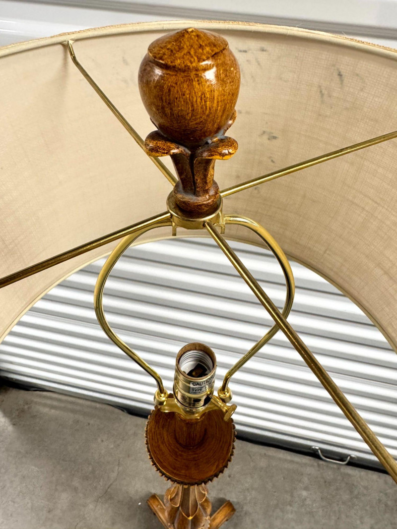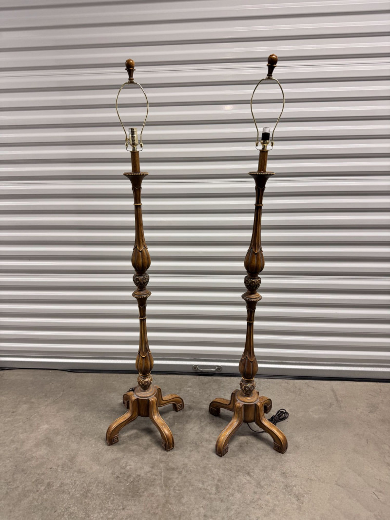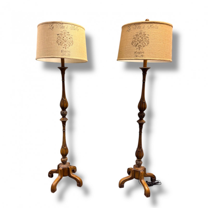 Tall Carved Wood Floor Lamps w/ Burlap Shades & Scroll Base - Pair.