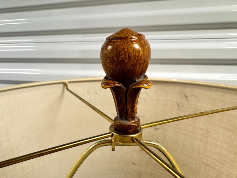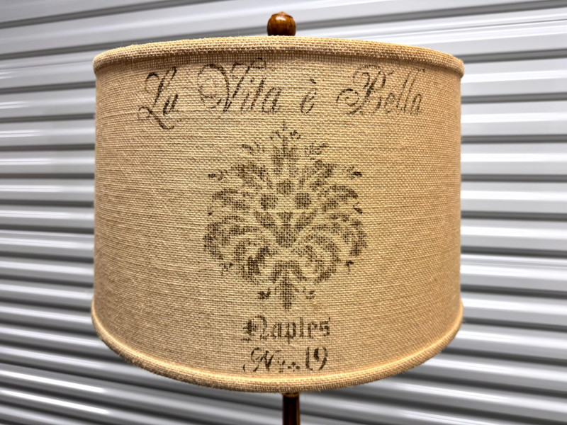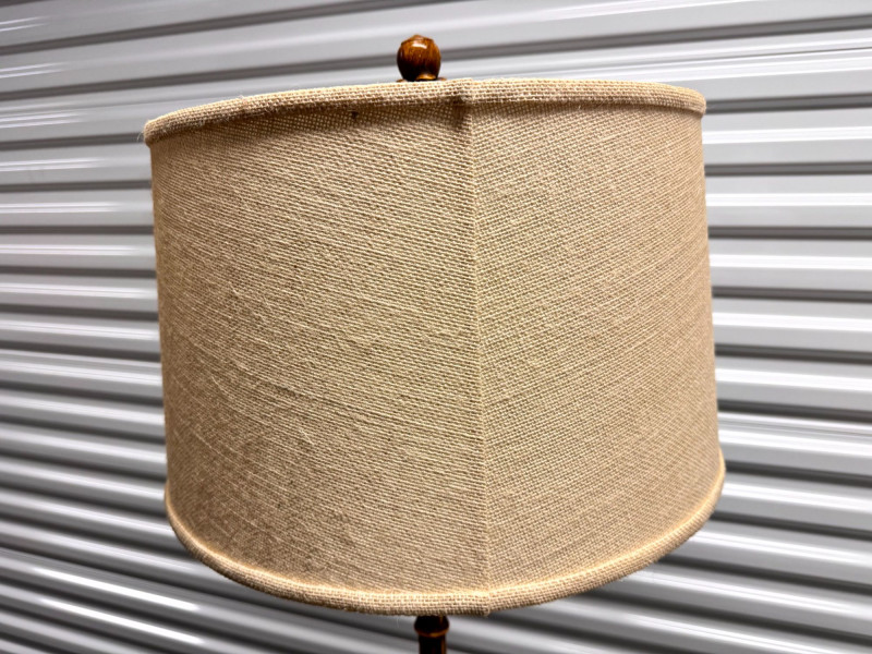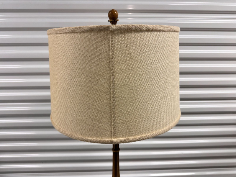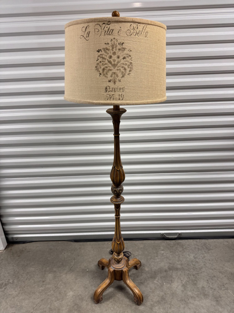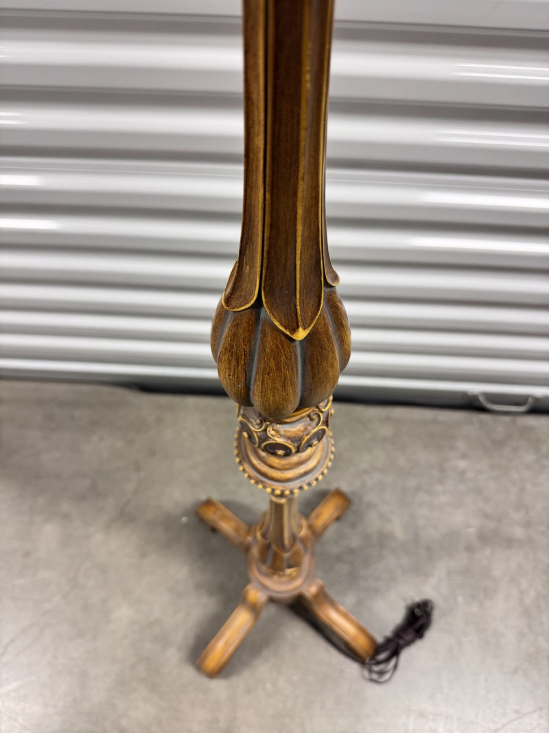 Lot # 92 - Tall Carved Wood Floor Lamps w/ Burlap Shades & Scroll Base - Pair