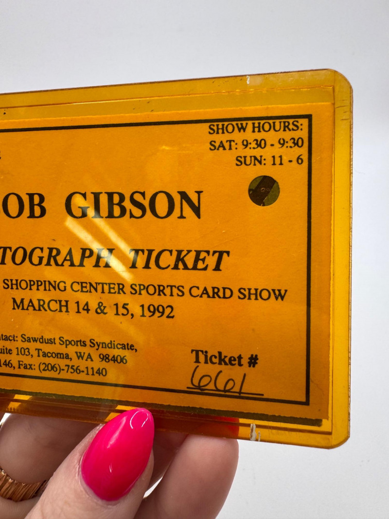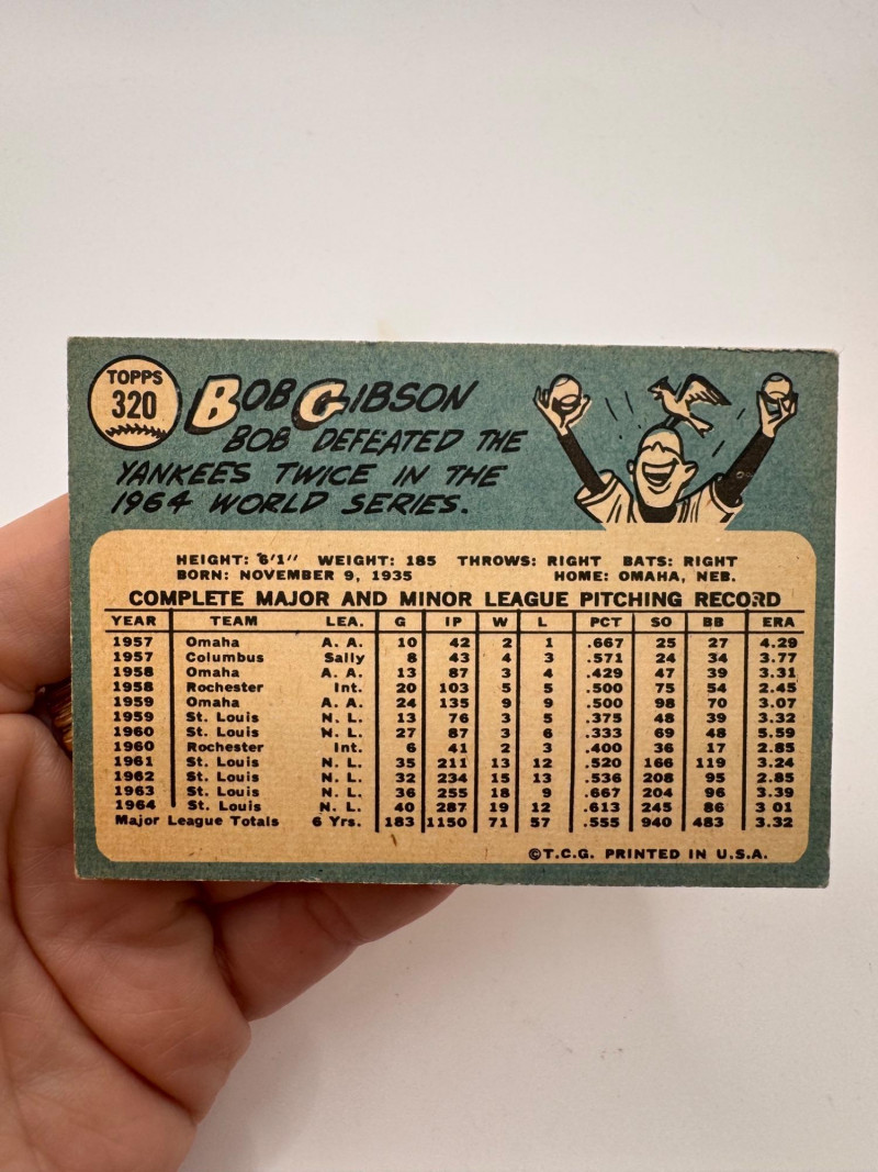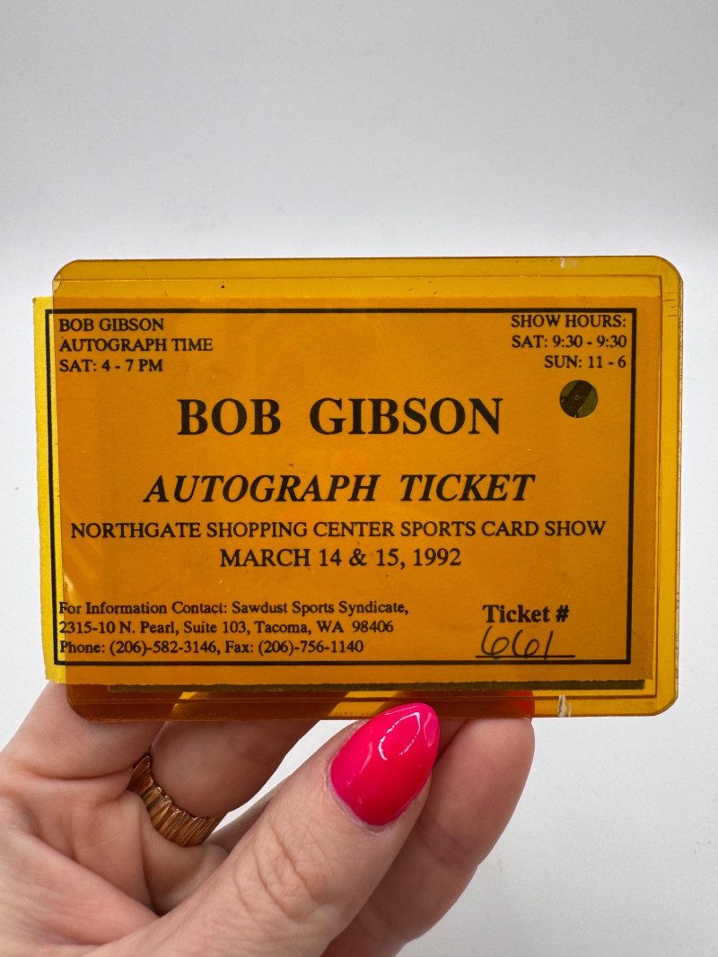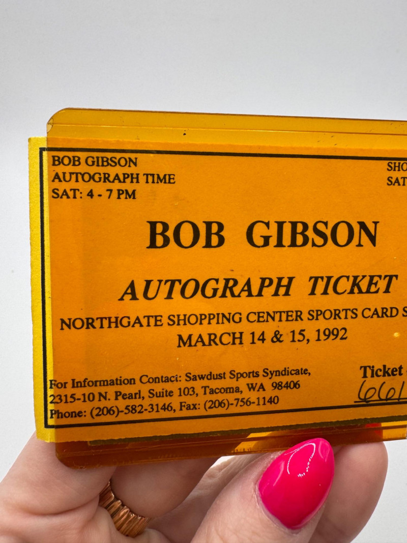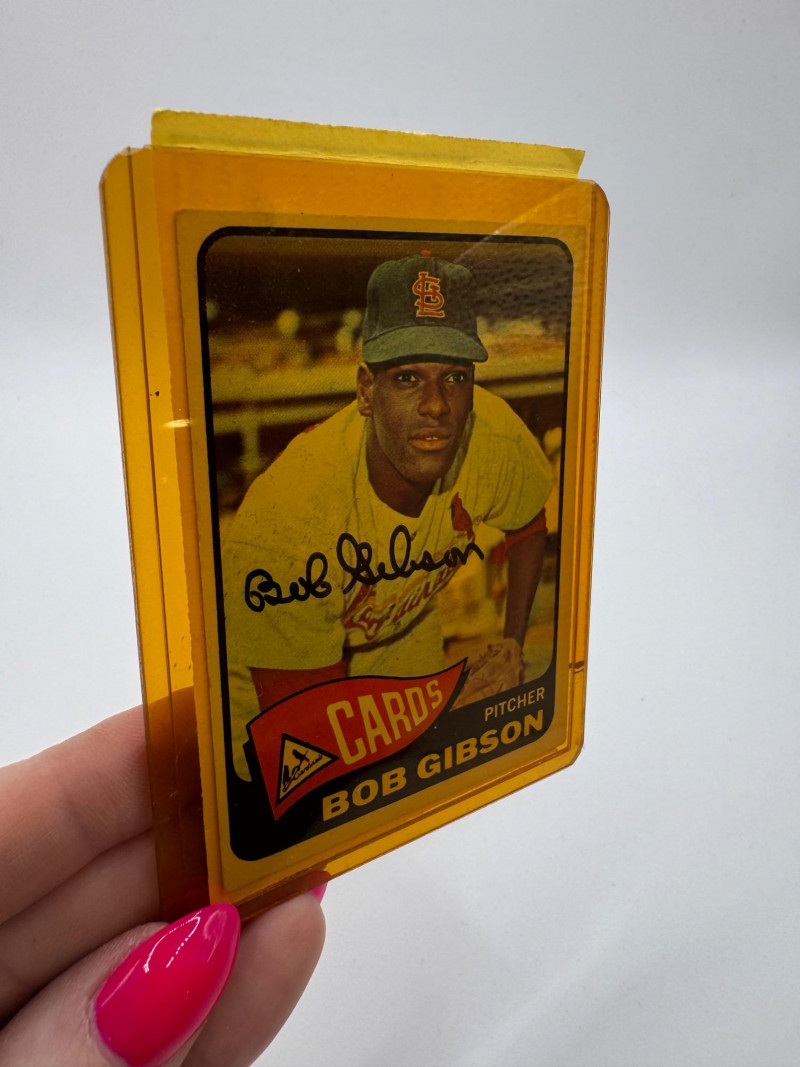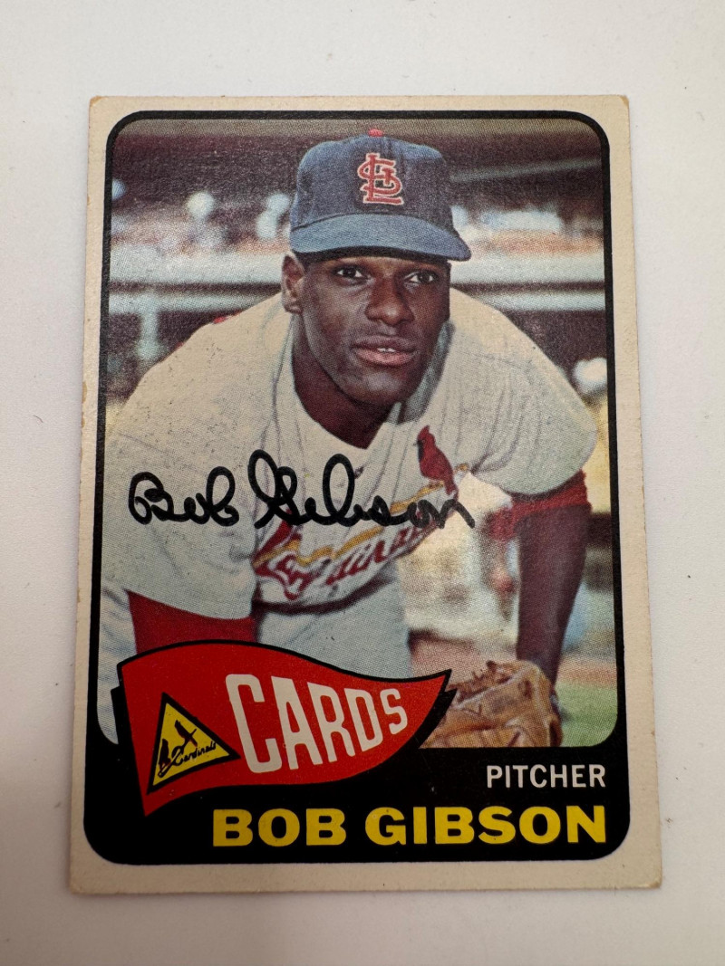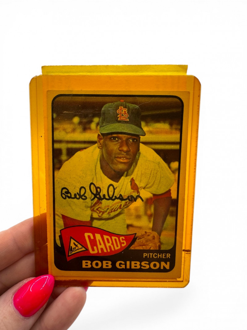 Vintage 1965 Bob Gibson Topps #320 Card w/ 1992 Autograph Ticket.