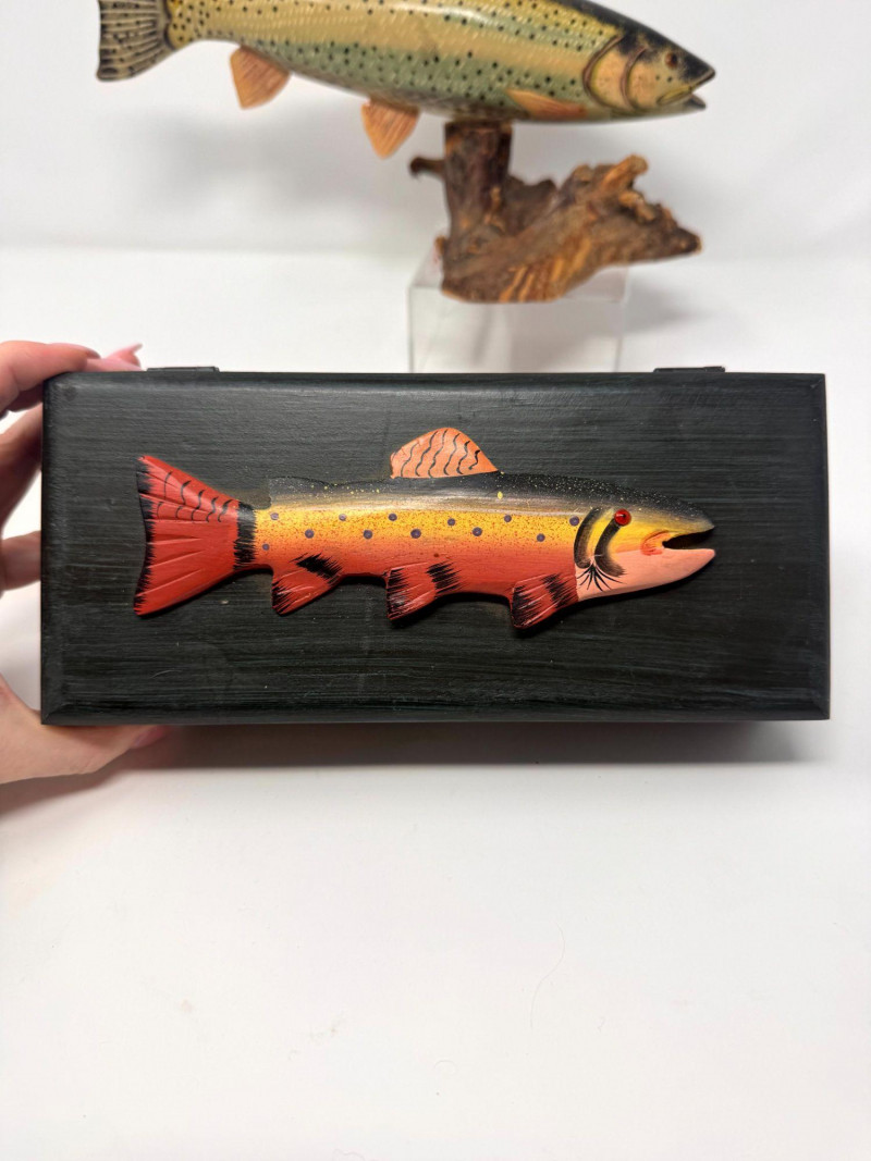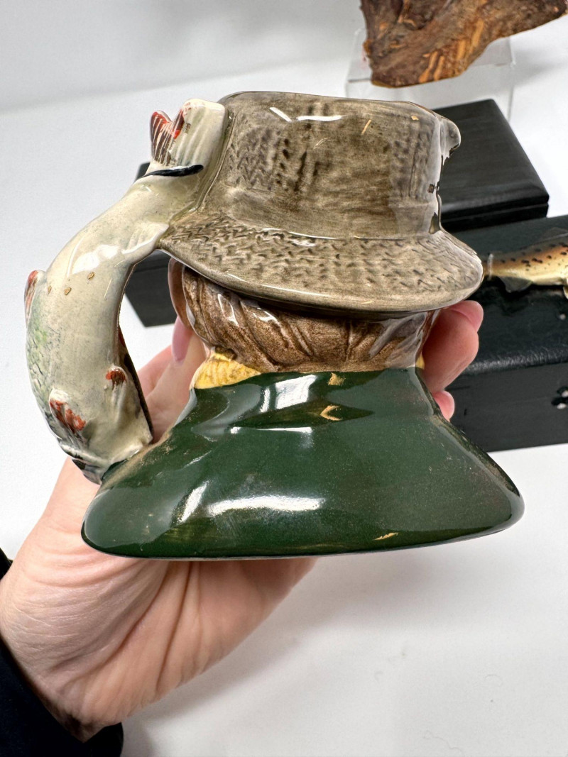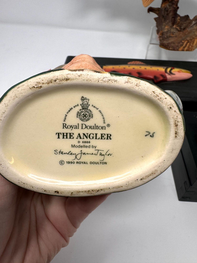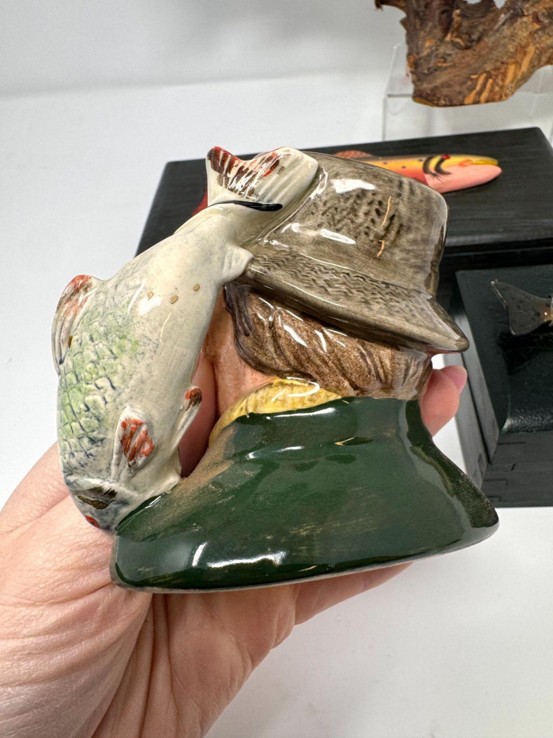 Royal Doulton Angler Jug w/ Carved Fish & Box Collectibles Royal Doulton character jug – “The Angler” Marked 1990 Royal Doulton Fishing-themed decor group Carved wood fish sculpture on driftwood base Approx. 11" long x 6" tall Decorative wooden box with fish relief Small wood box with fish top detail