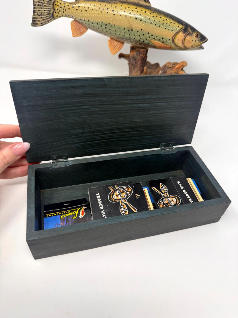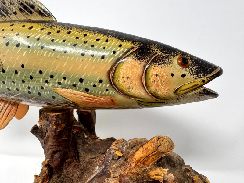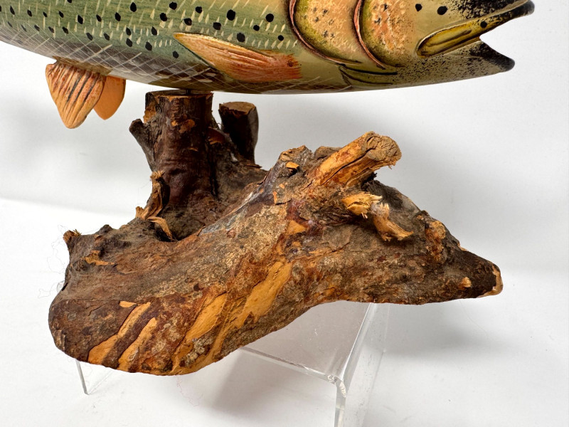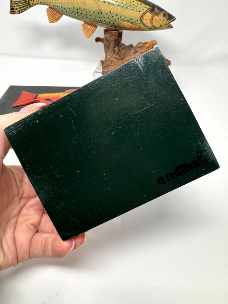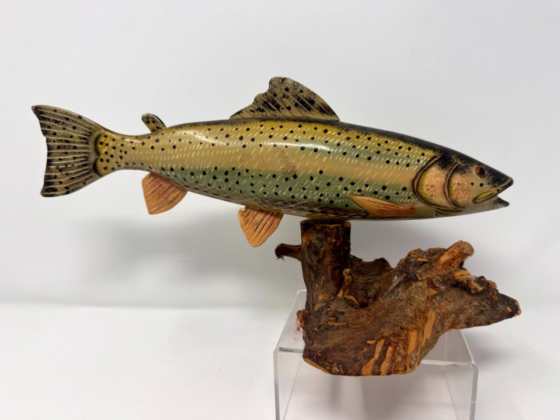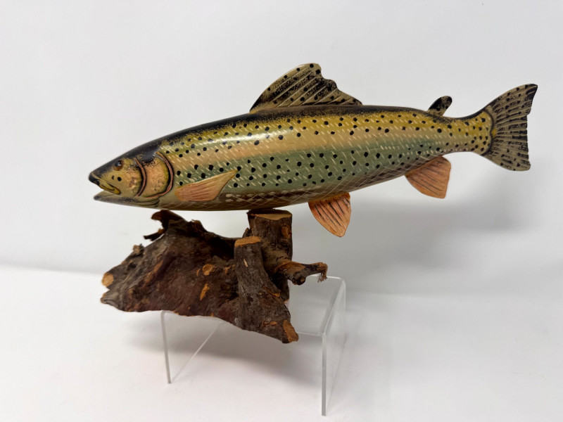 Royal Doulton Angler Jug w/ Carved Fish & Box Collectibles Royal Doulton character jug – “The Angler” Marked 1990 Royal Doulton Fishing-themed decor group Carved wood fish sculpture on driftwood base Approx. 11" long x 6" tall Decorative wooden box with fish relief Small wood box with fish top detail