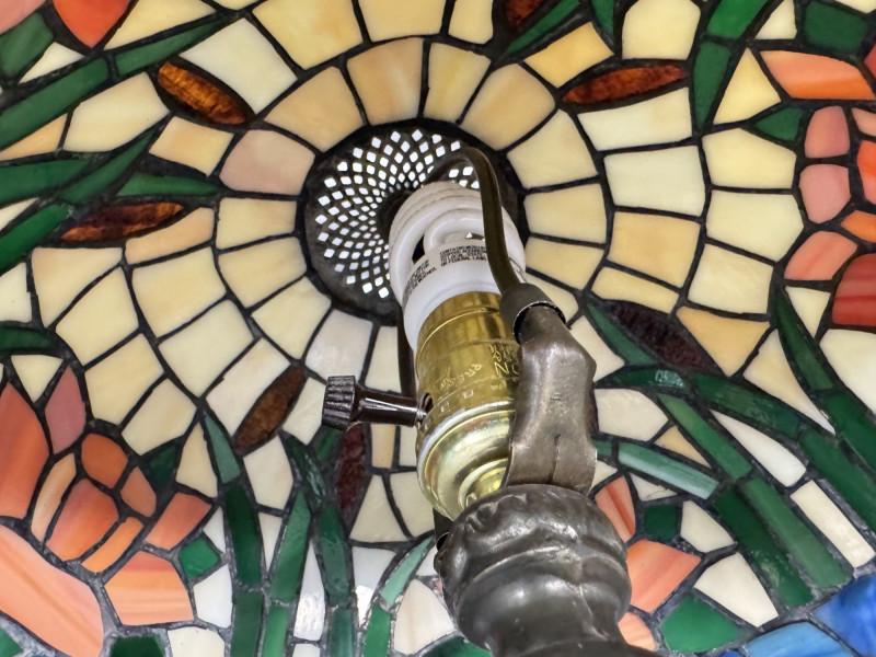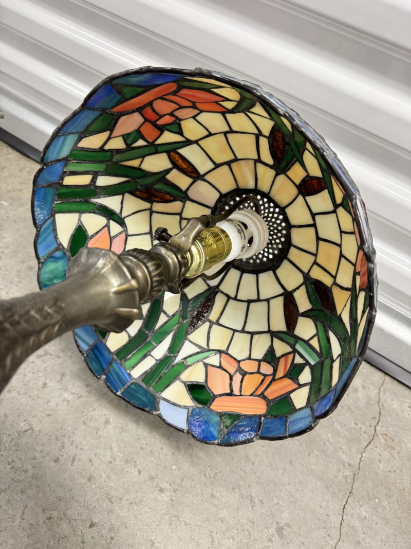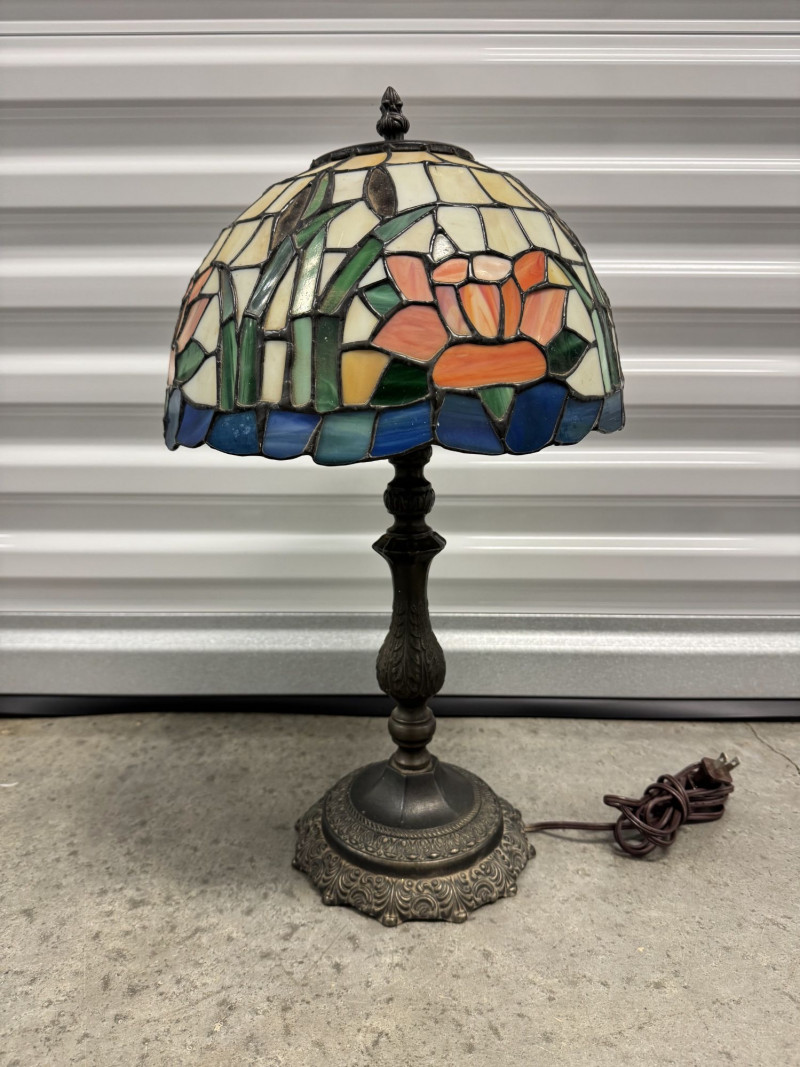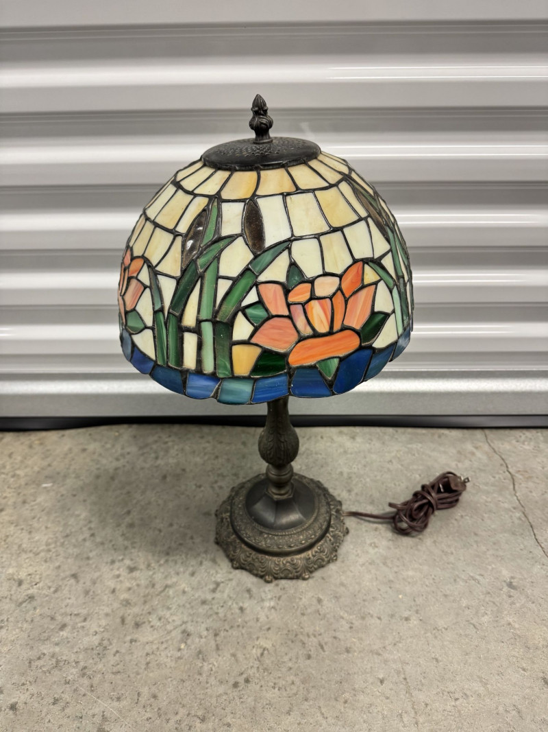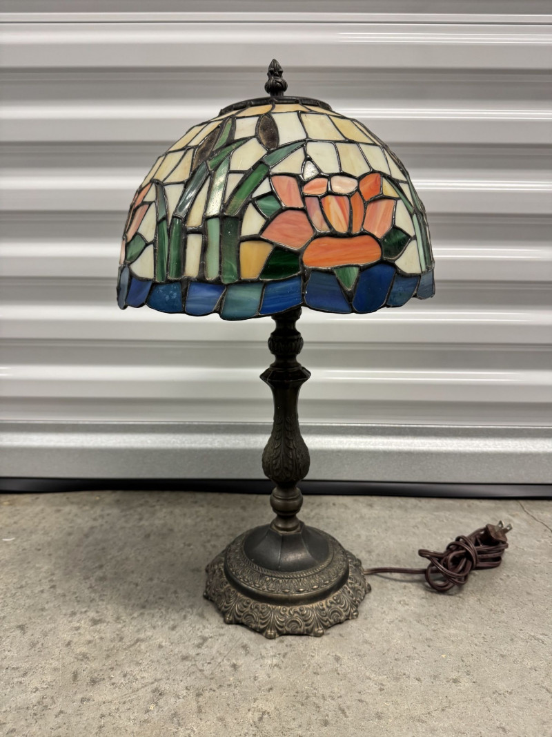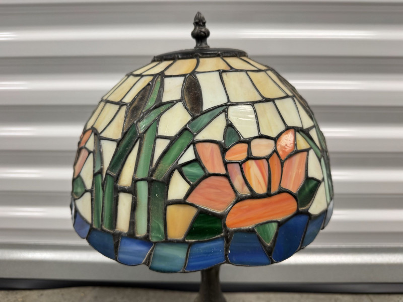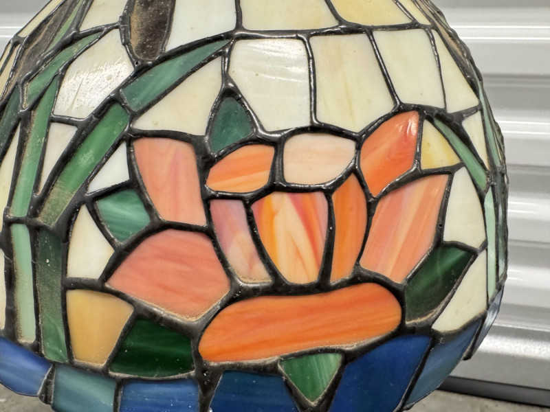 Tiffany-Style Stained Glass Lamp - Orange Blossom & Green Leaf.